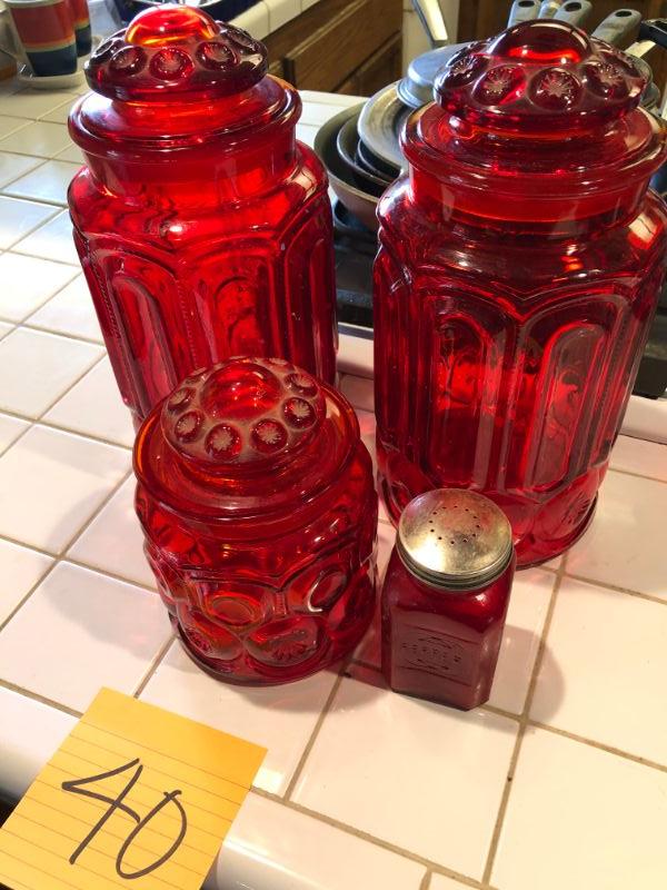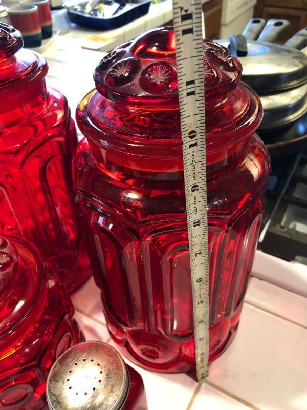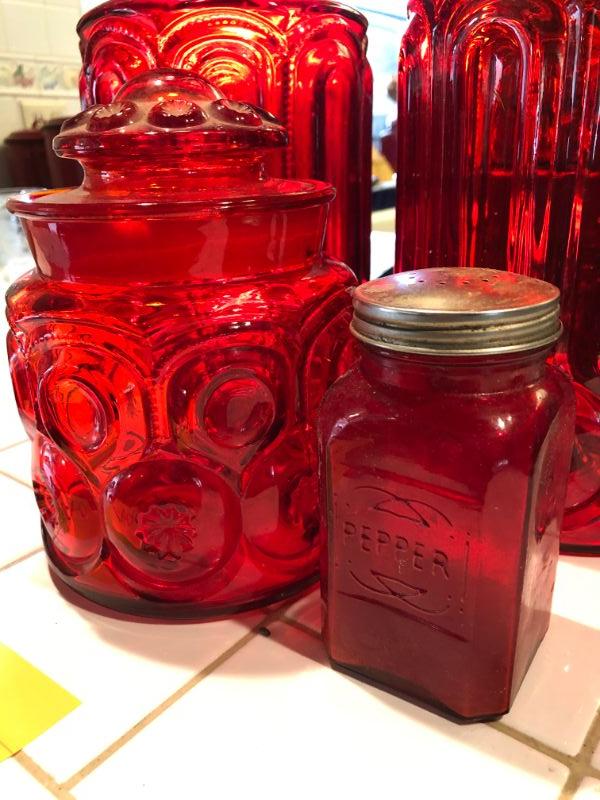 Vintage L.E. Smith red amberina Moon & Stars glass canister set and pepper shaker
