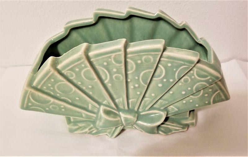 Classic McCoy Pottery planter in the form of a fan. Good condition, 5" tall, 9" across.