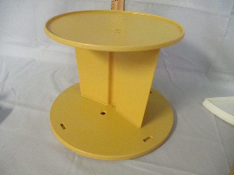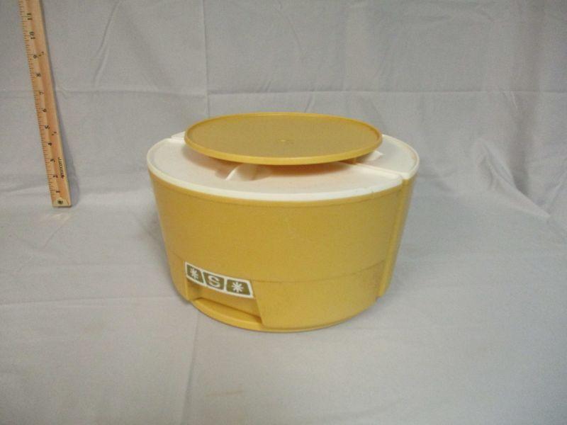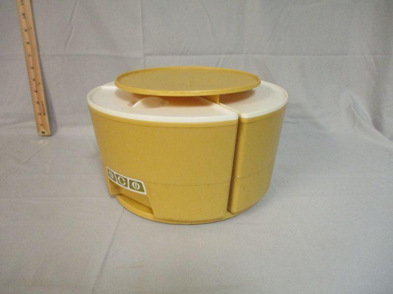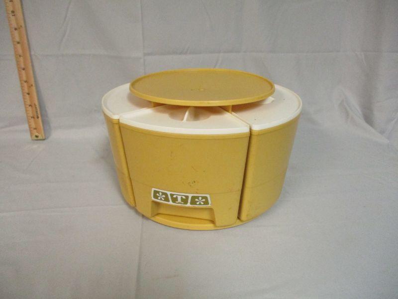 This is a cool retro canister set on a lazy susan. It is in great condition, just needs a quick cleaning. It is about 11" in total diameter x 6.5" in height.
