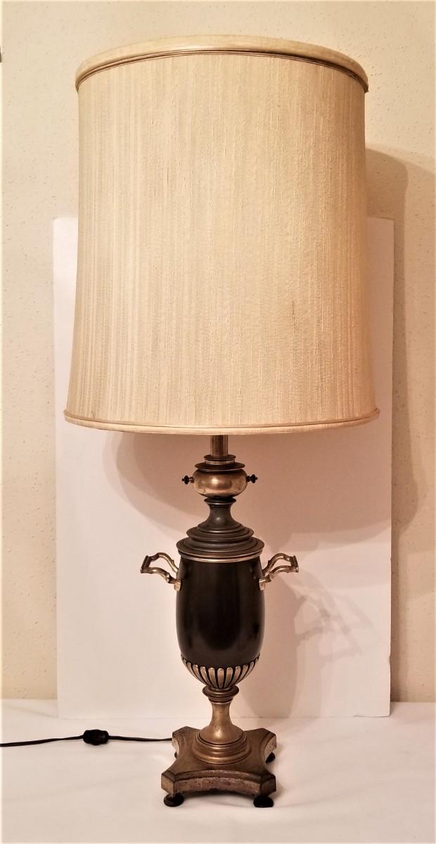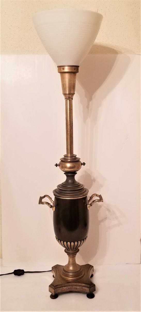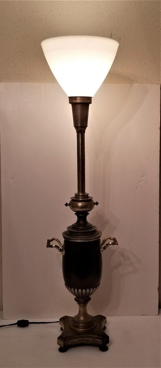 Vintage Torchiere style lamp, good working condition. Switch on cord. Milk glass shade. 35" tall with the Mid Century lamp shade, 32.5" tall without. MC shade sits atop the Milk Glass fixture, so you can use either way. Heavy.