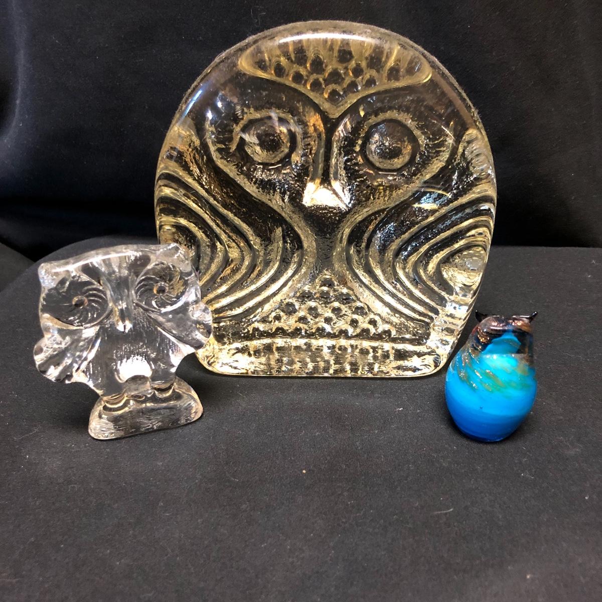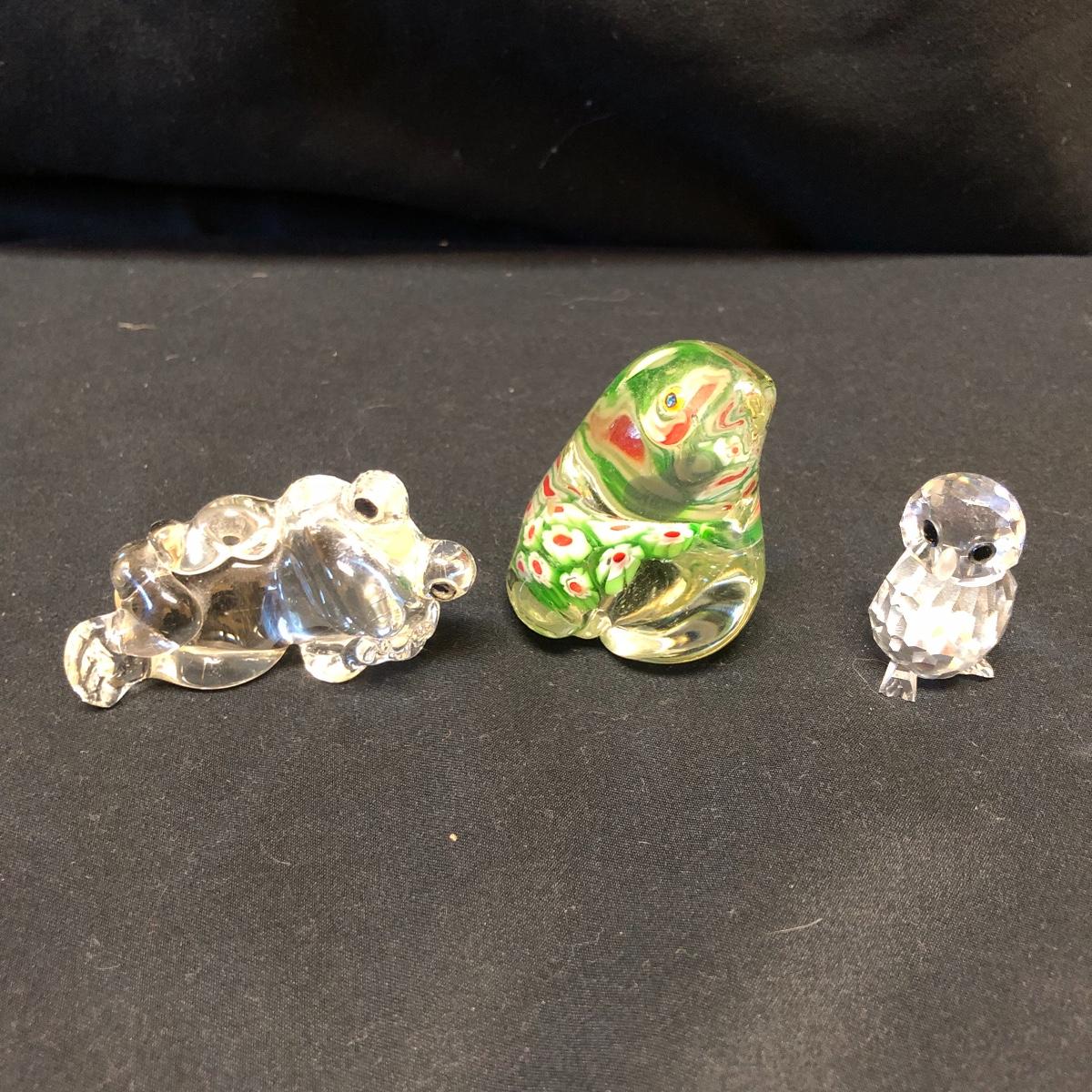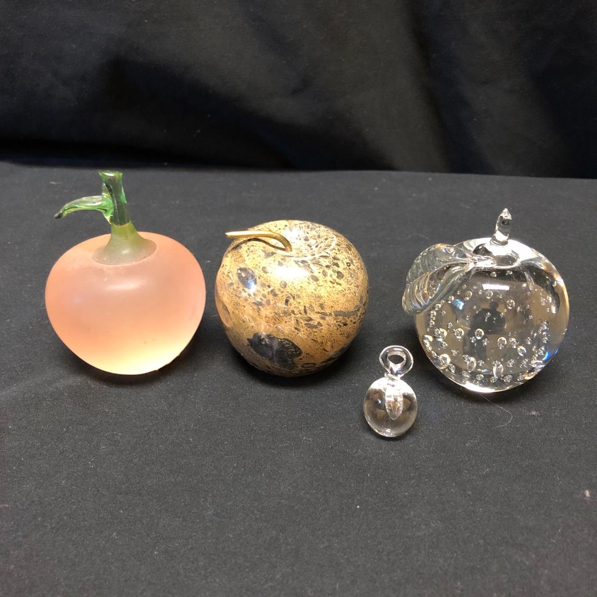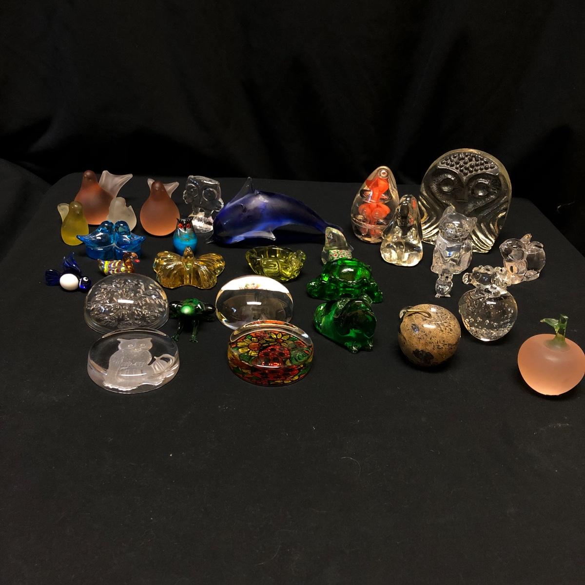 Add some decorations to your home and office with this array of paperweights and figurines. This lot includes a stone apple, Cristal lead Crystal snowflake paperweight, figurines in shapes of dolphin, frogs, birds, cat, owl, and what appears to be a hand blown egg shaped paperweight and more. Dolphin measures 3” x 8” x 3.5”.