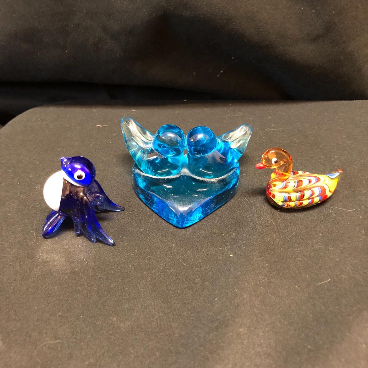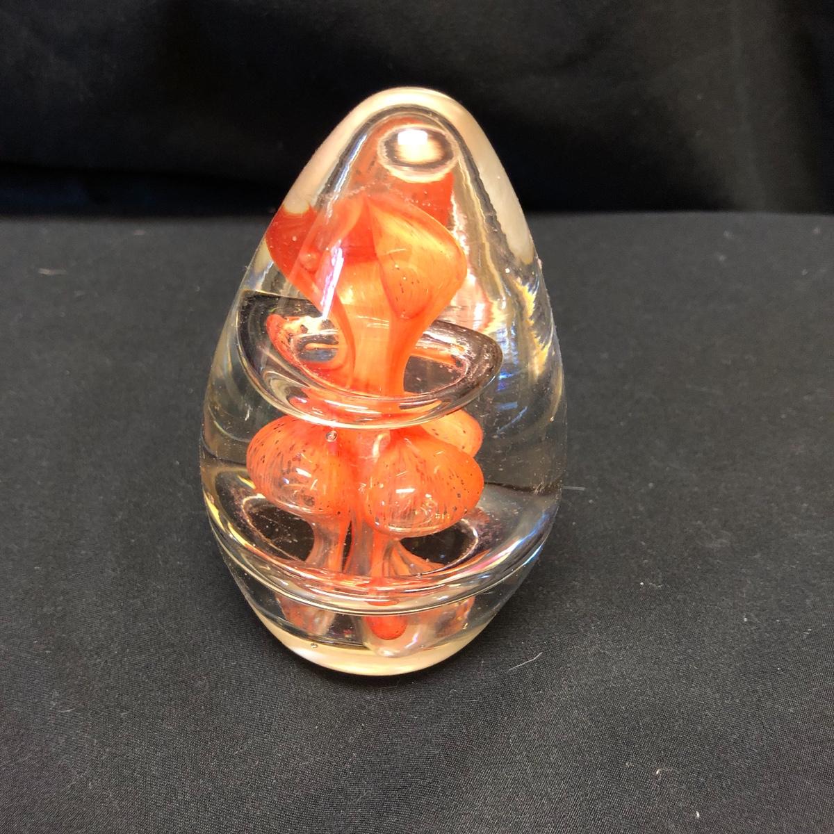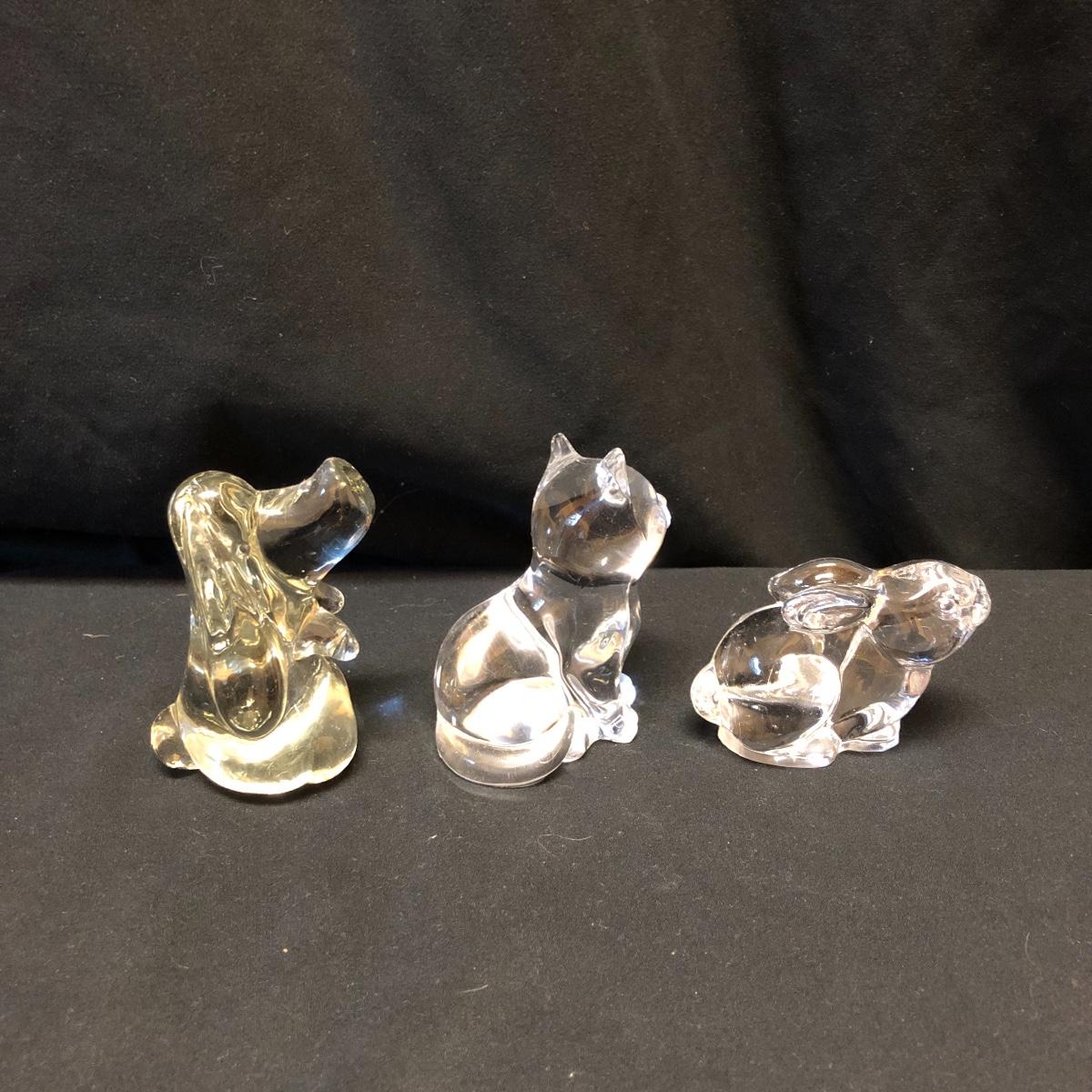 Add some decorations to your home and office with this array of paperweights and figurines. This lot includes a stone apple, Cristal lead Crystal snowflake paperweight, figurines in shapes of dolphin, frogs, birds, cat, owl, and what appears to be a hand blown egg shaped paperweight and more. Dolphin measures 3” x 8” x 3.5”.