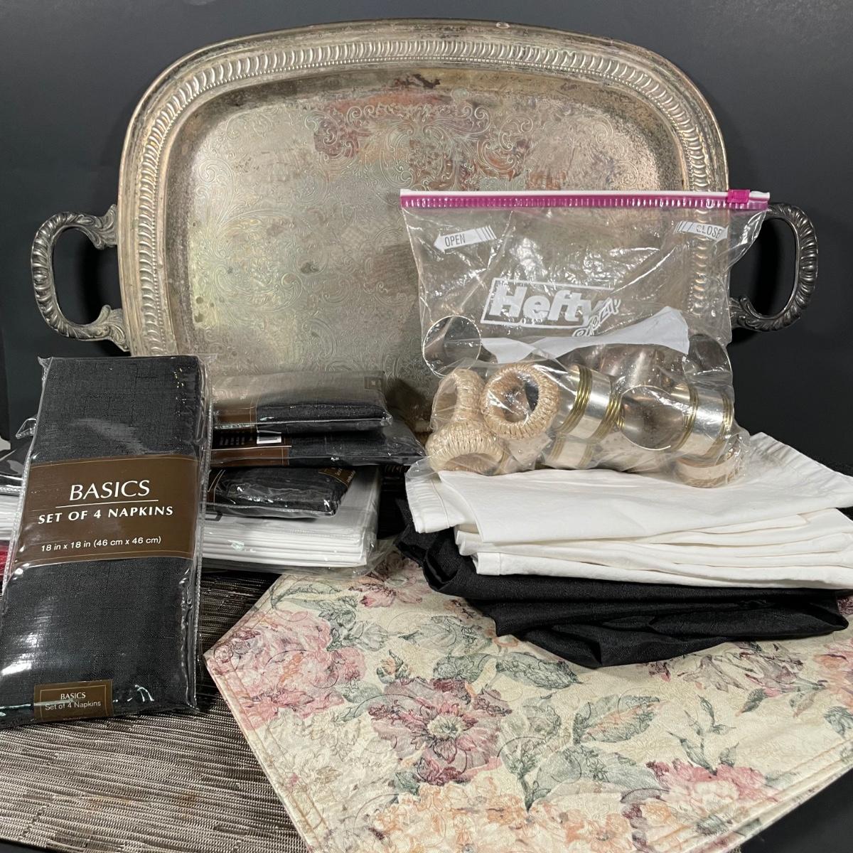 LOT 401D: Collection Of Napkin Rings, Place Mats, NIP Napkins & Silver Plate Serving Tray