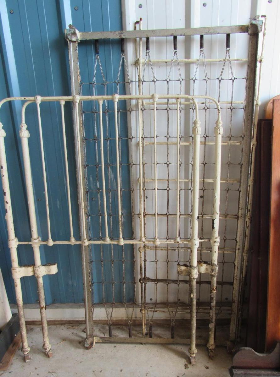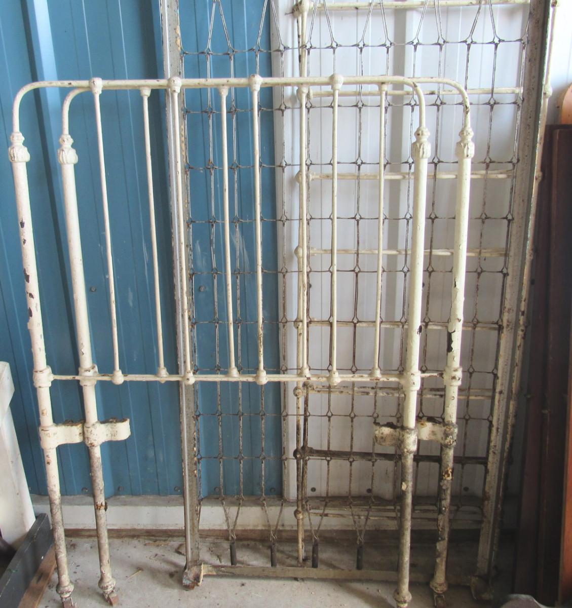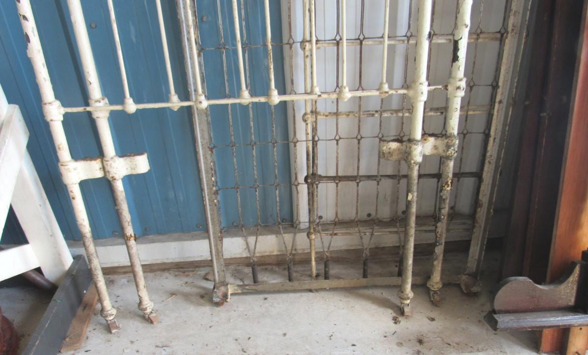 Good shape. Paint is chipping. Pieces appear to be all there, not sure about the hardware.