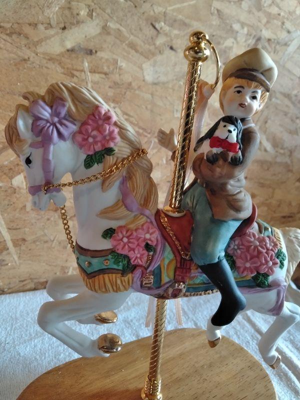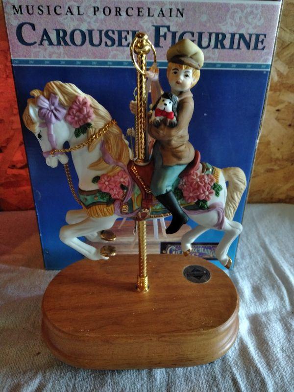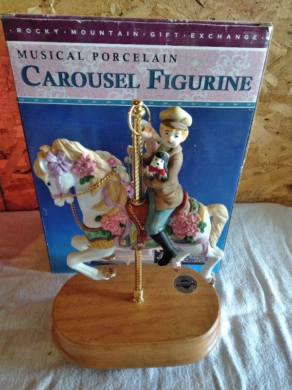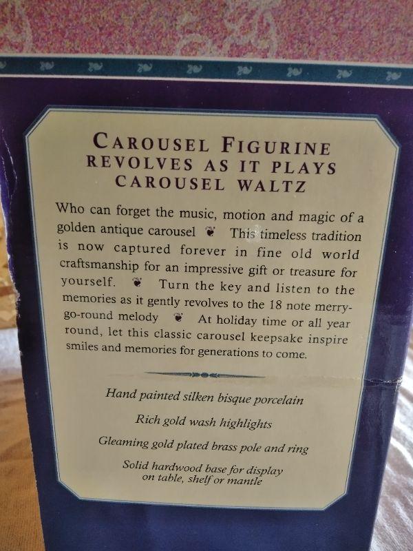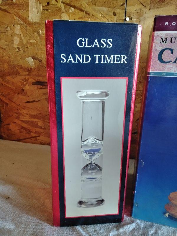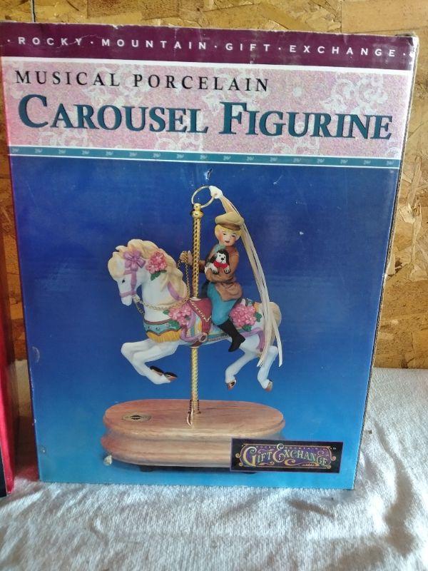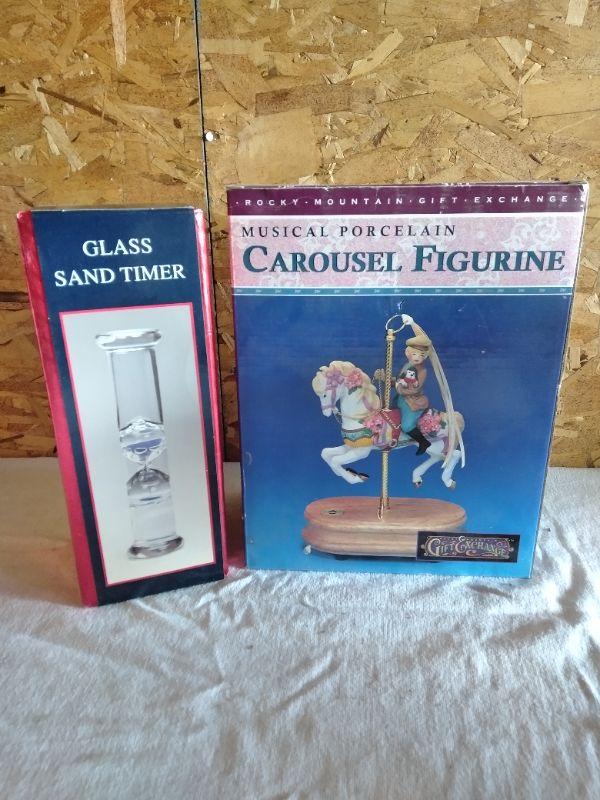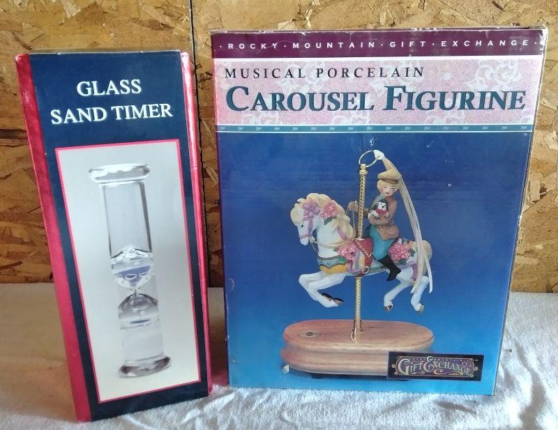 GIFT EXCHANGE MUSICAL PORCELAIN CAROSEL FIGURINE, AND GLASS SAND TIMER BOTH BRAND NEW ITEMS.