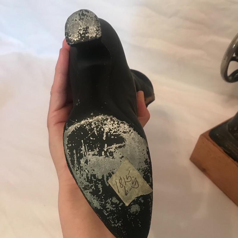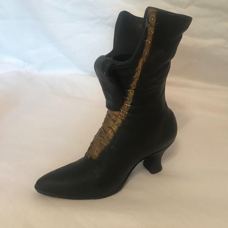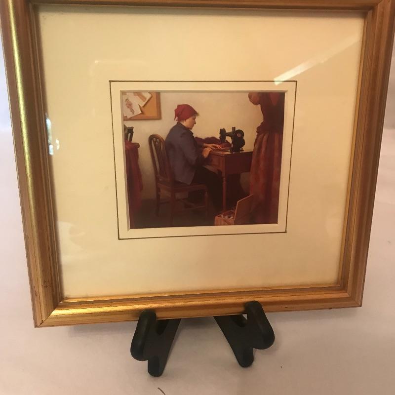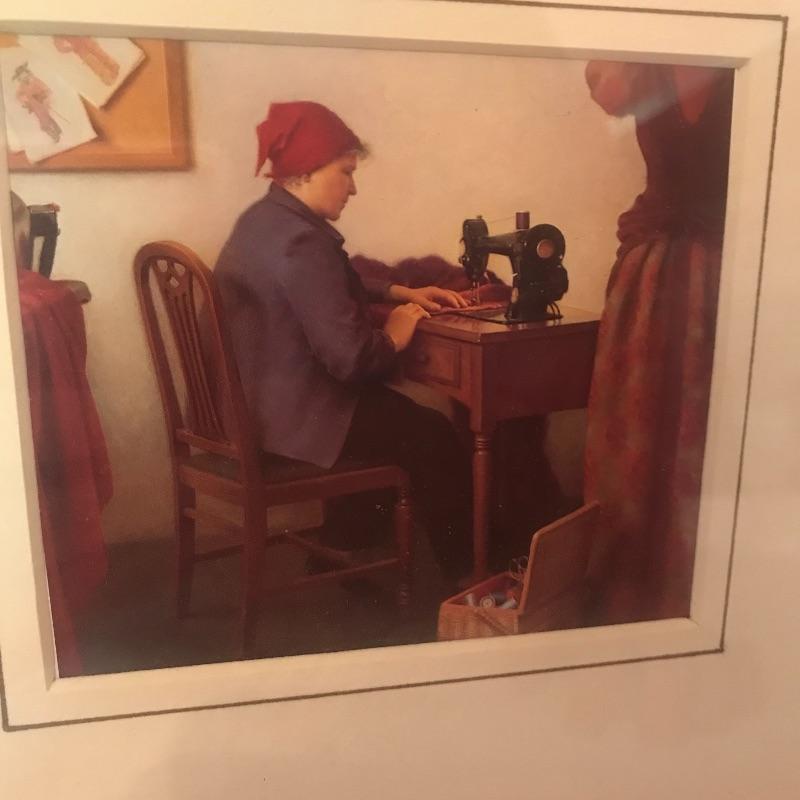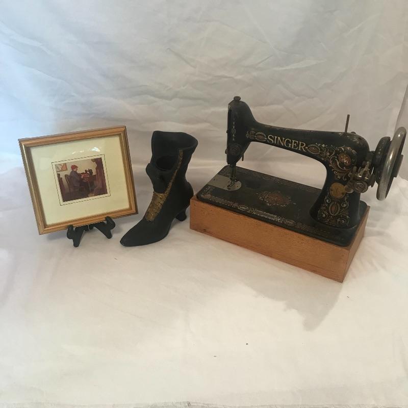 Antique Singer Sewing Machine on a wooden stand measures 15.5” x8.5”. Along with Sewing Machine which is really just for display is a small print of “The Costume Maker” by Jean Grapp in a good frame that measures 9” x8.5”. Also included in the lot is a metal cast antique shoe where the inside is like a vase. Local pick up only.