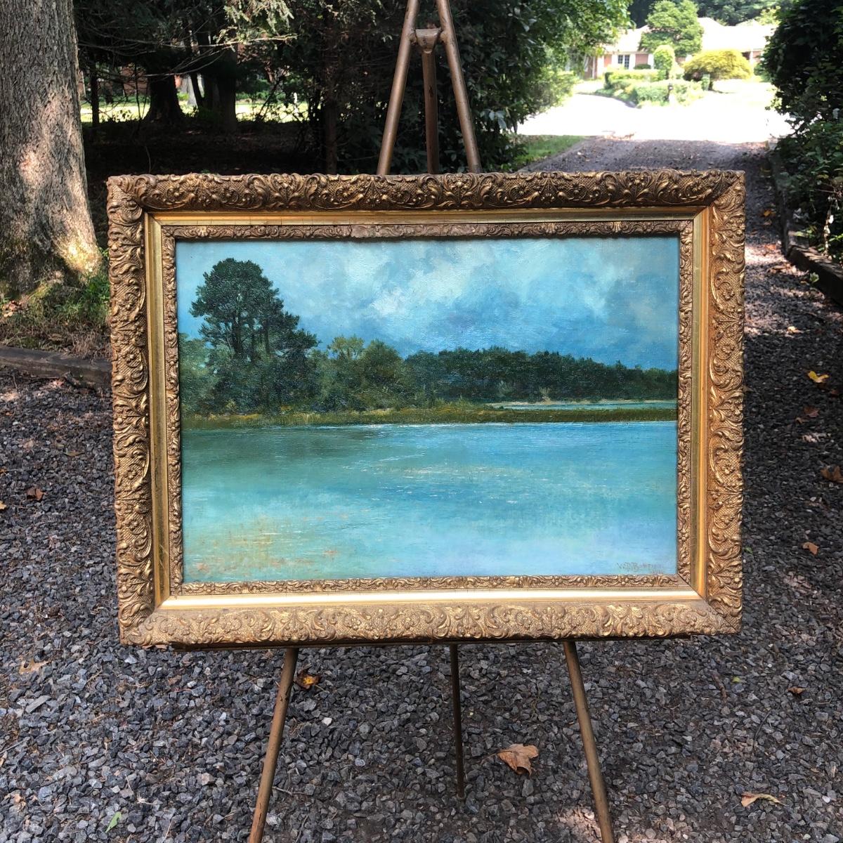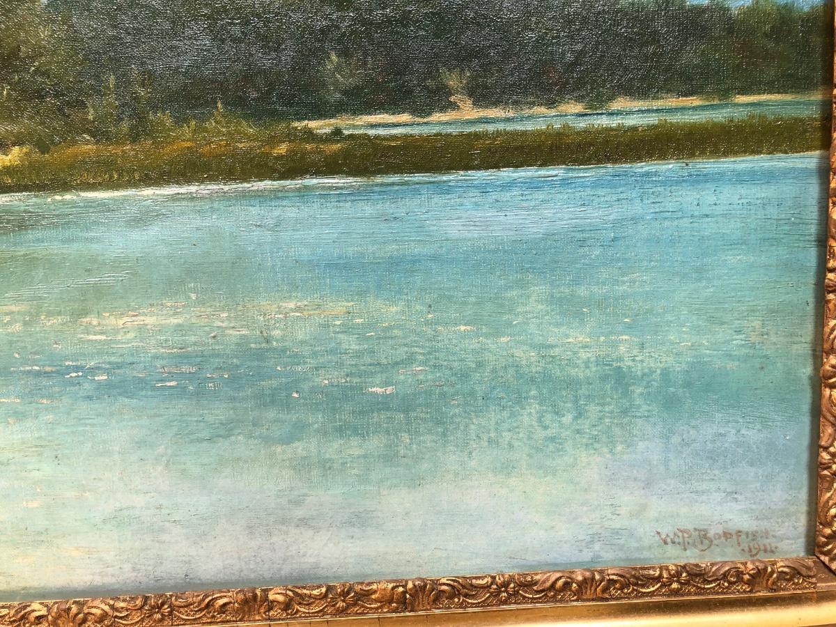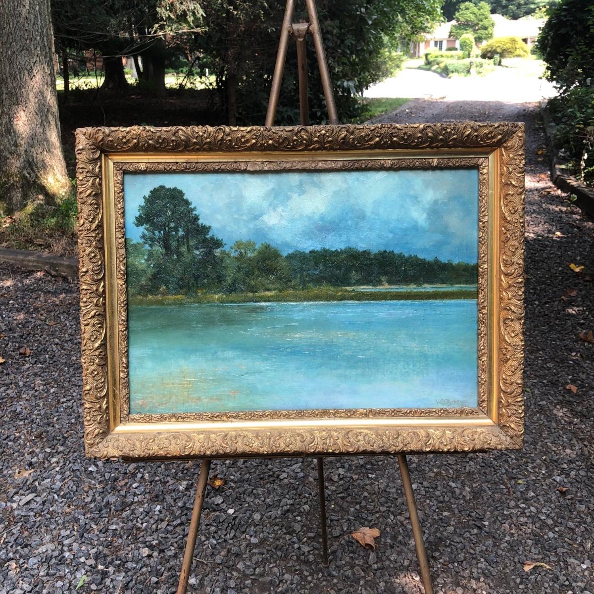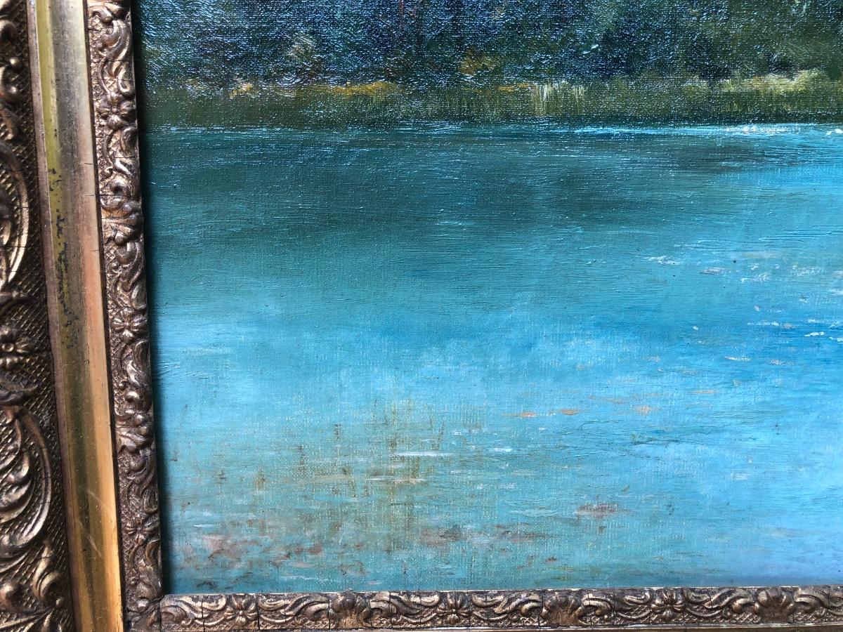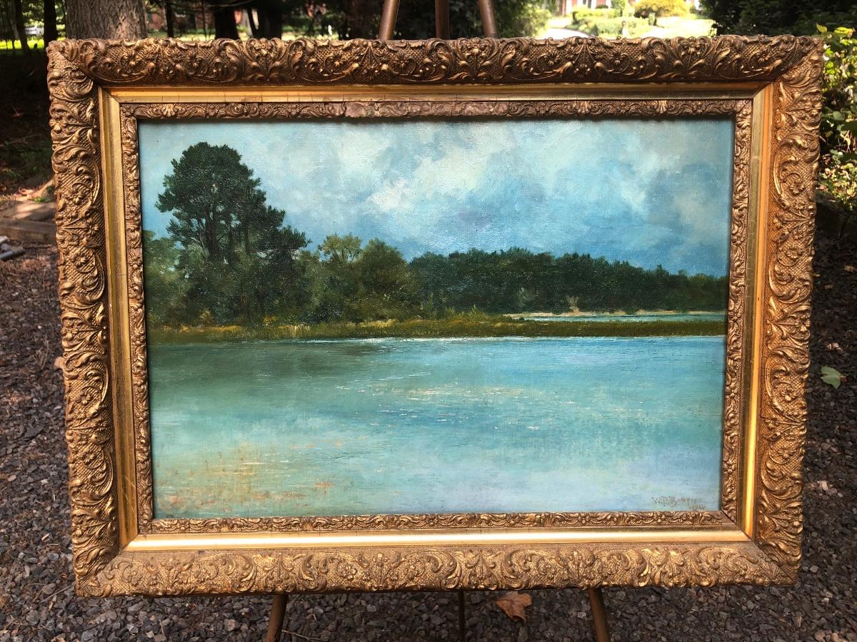 LOT 402G: Antique 1916 Framed Lake Landscape Oil Painting signed