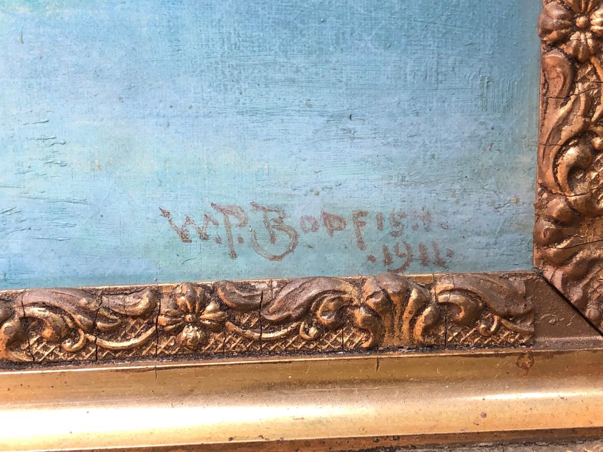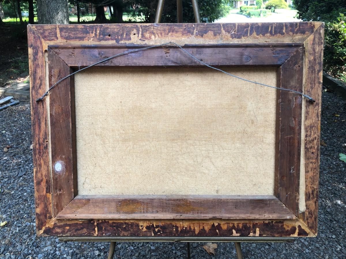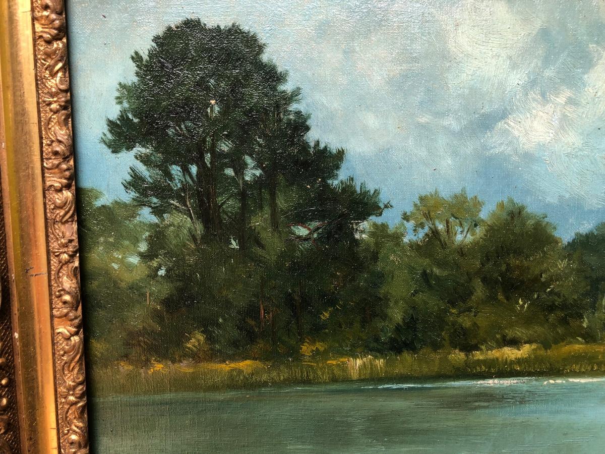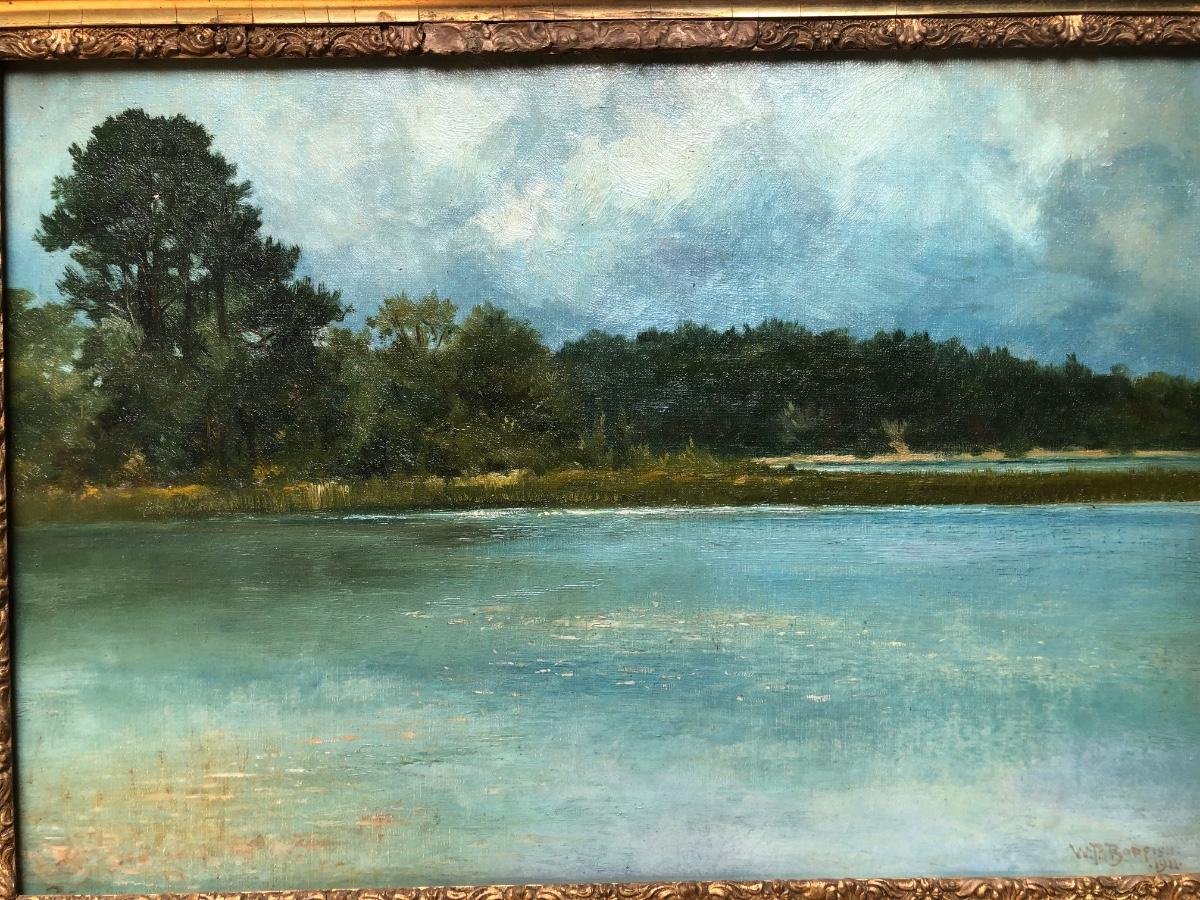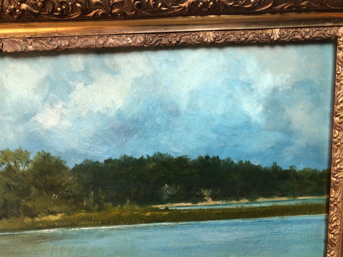 LOT 402G: Antique 1916 Framed Lake Landscape Oil Painting signed