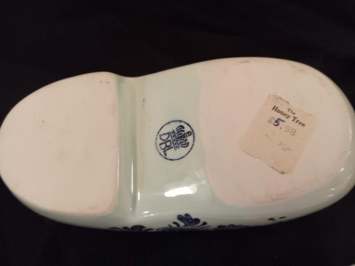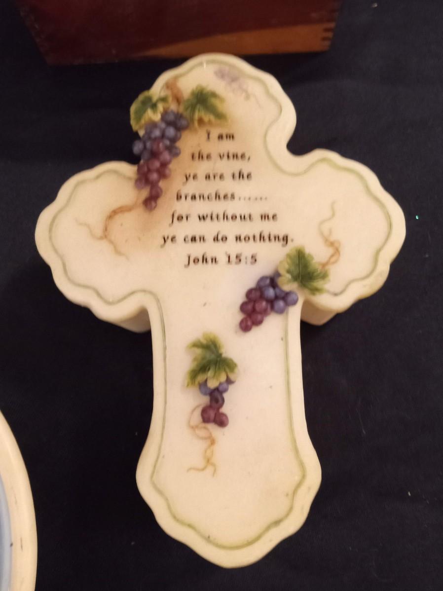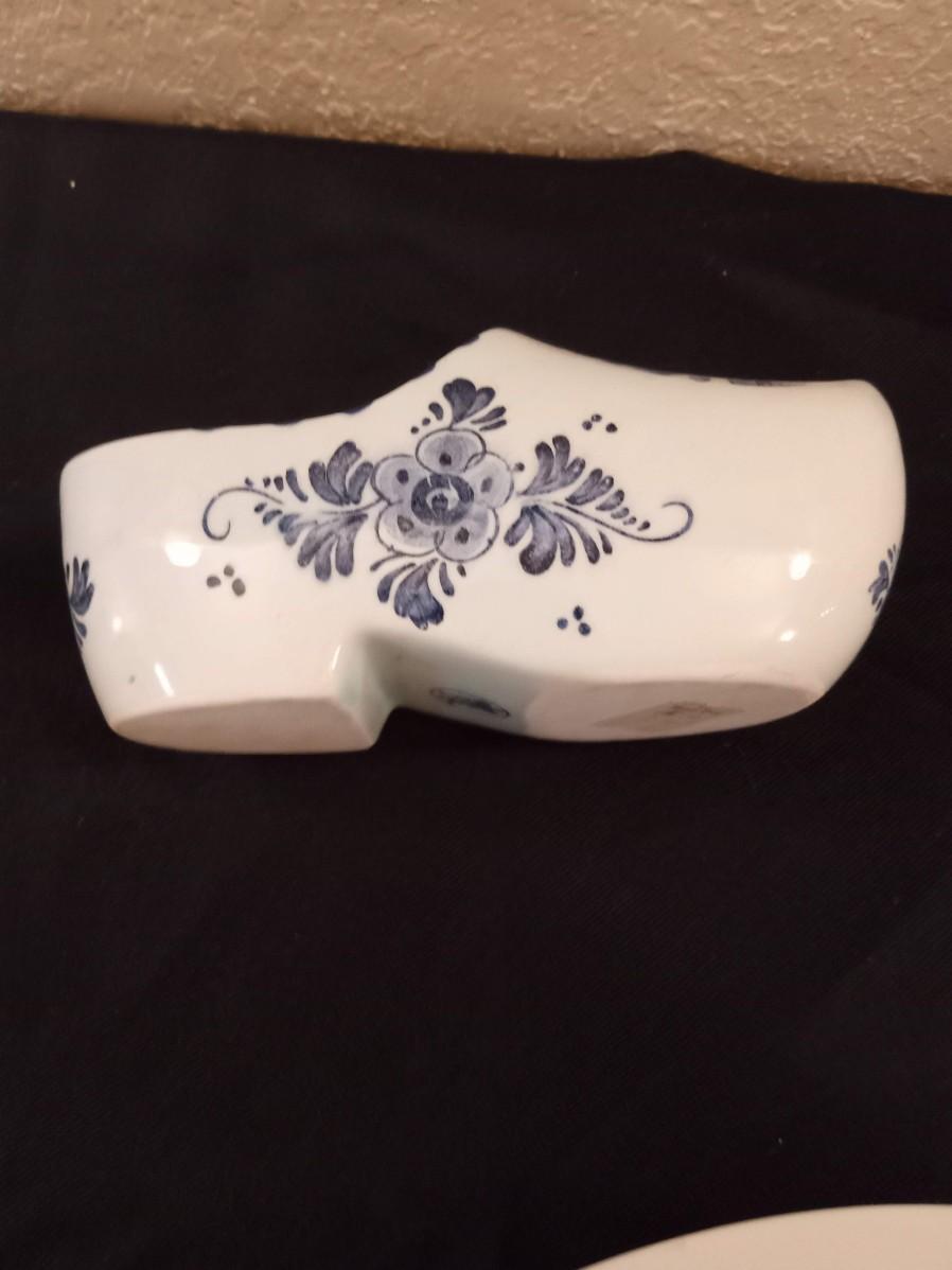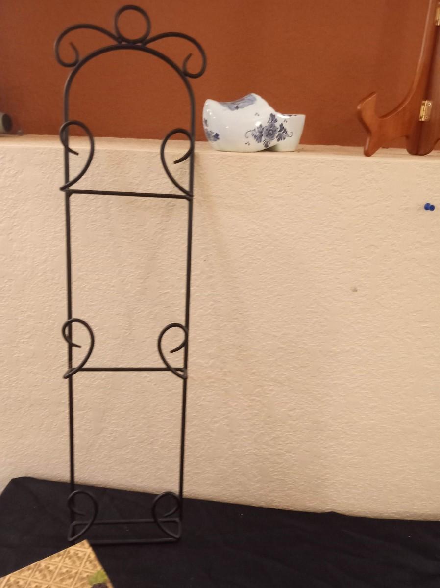 IRON WALL HUNG PLATE HOLDER, FIGURINE, DUTCH SHOE ASHTRAY, 2 RECIPE BOXES, CROSS TRIVET BOX