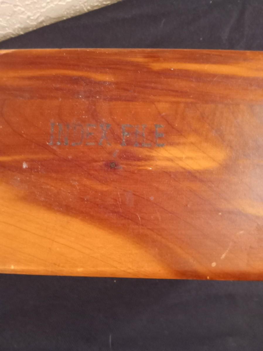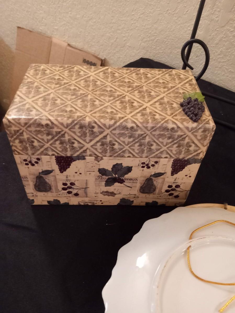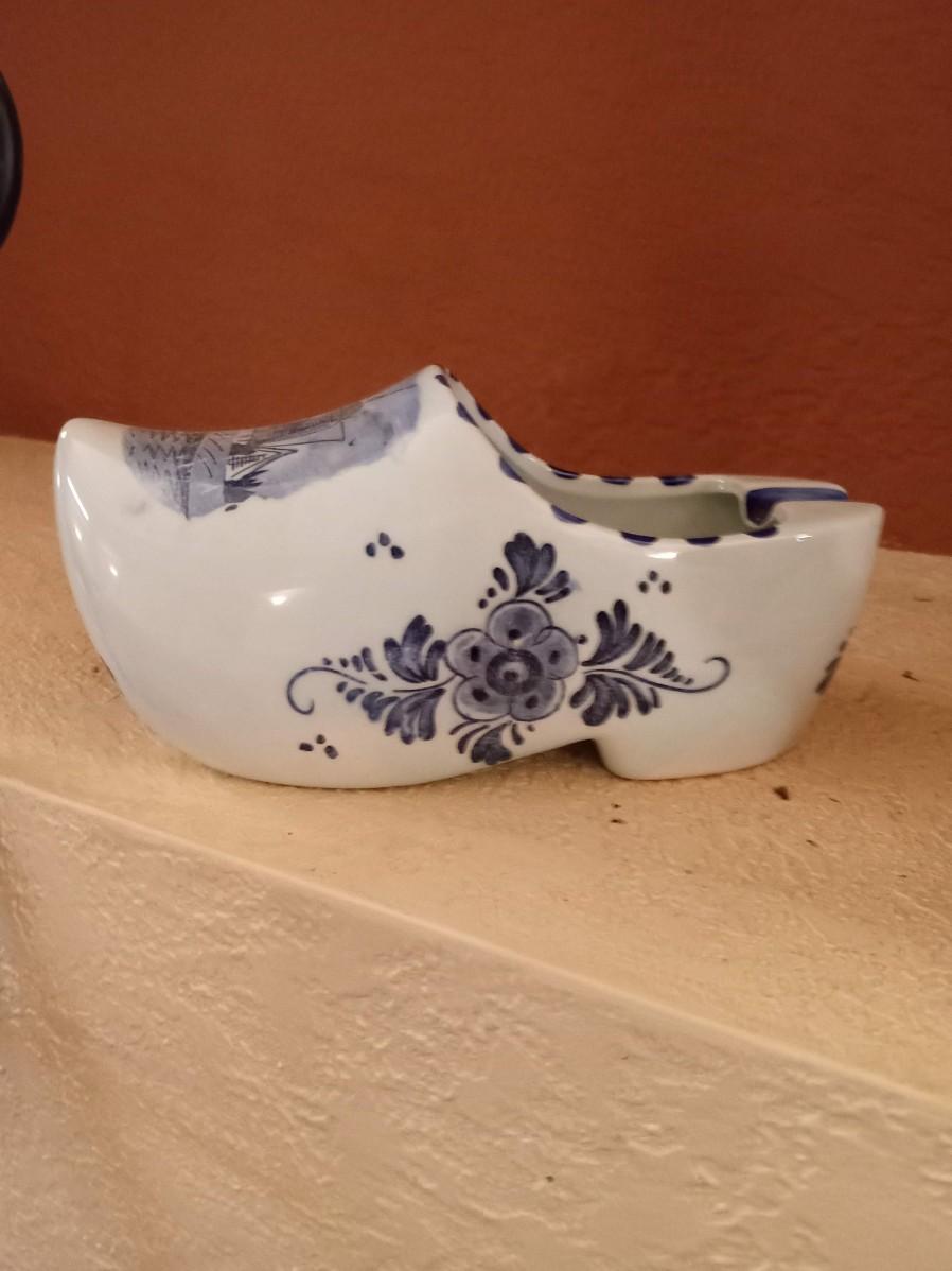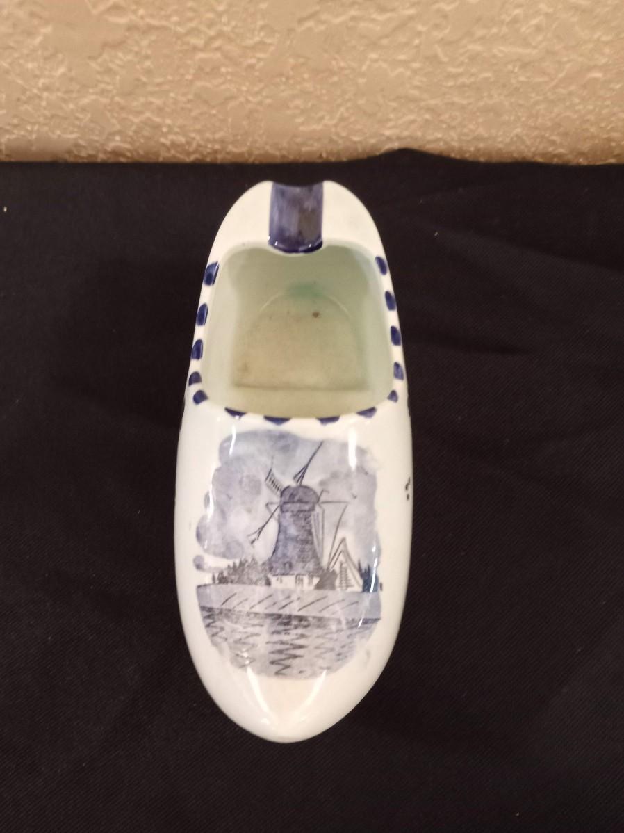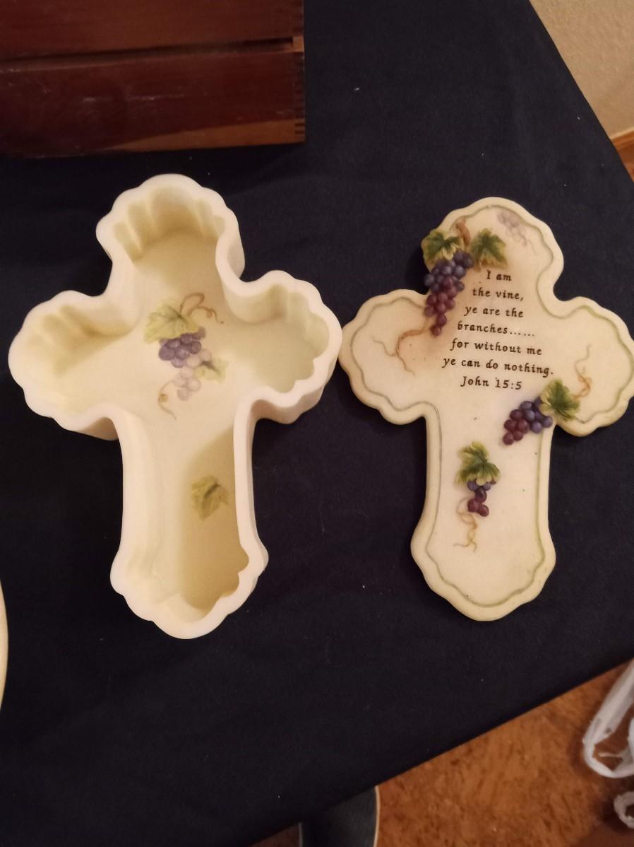 IRON WALL HUNG PLATE HOLDER, FIGURINE, DUTCH SHOE ASHTRAY, 2 RECIPE BOXES, CROSS TRIVET BOX