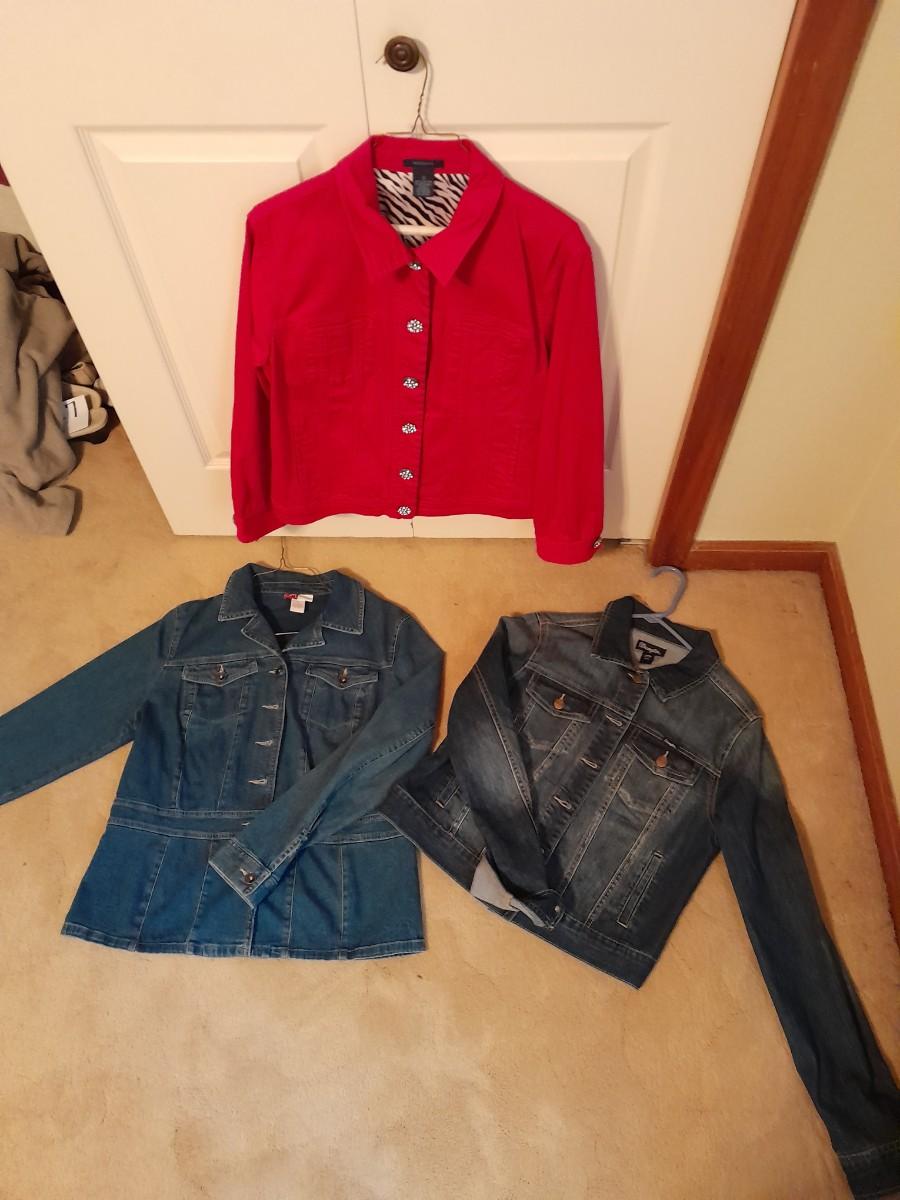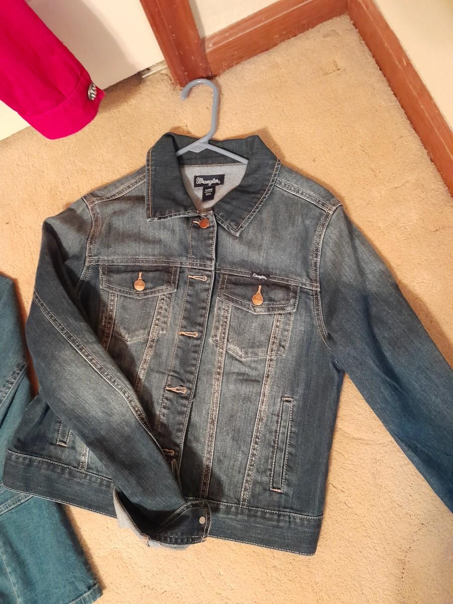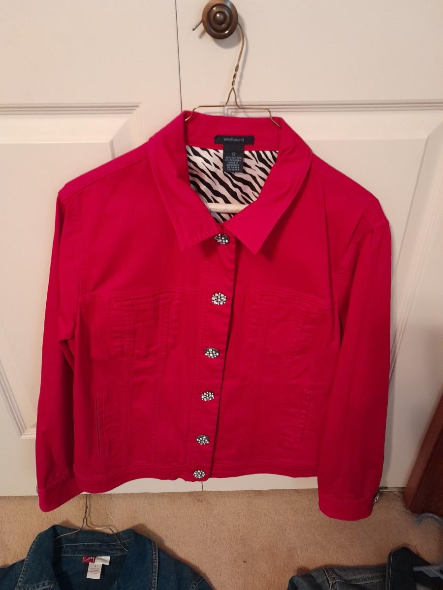 WOMEN'S JEAN JACKETS, WESTBOUND PINK WITH BLING BUTTONS, SIZE 12, WRANGLER SIZE LARGE, AND JM COLLECTION SIZE 12