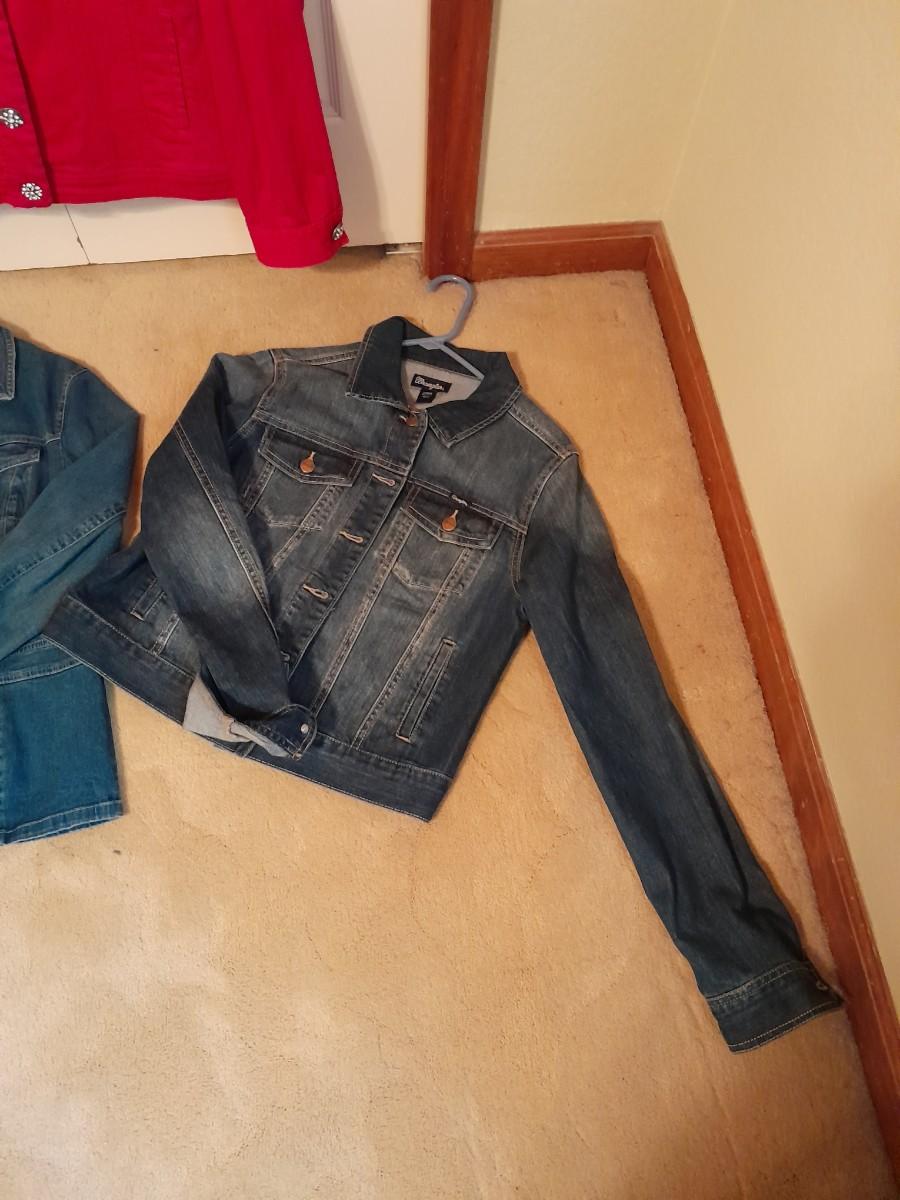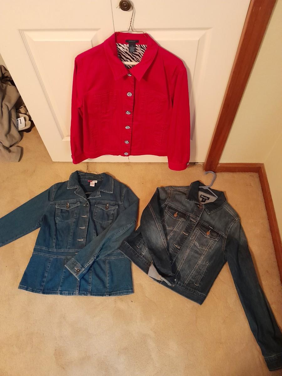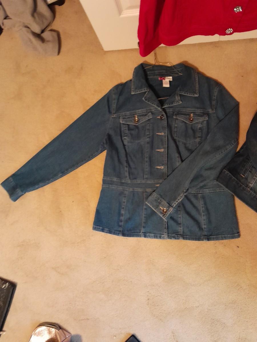 WOMEN'S JEAN JACKETS, WESTBOUND PINK WITH BLING BUTTONS, SIZE 12, WRANGLER SIZE LARGE, AND JM COLLECTION SIZE 12