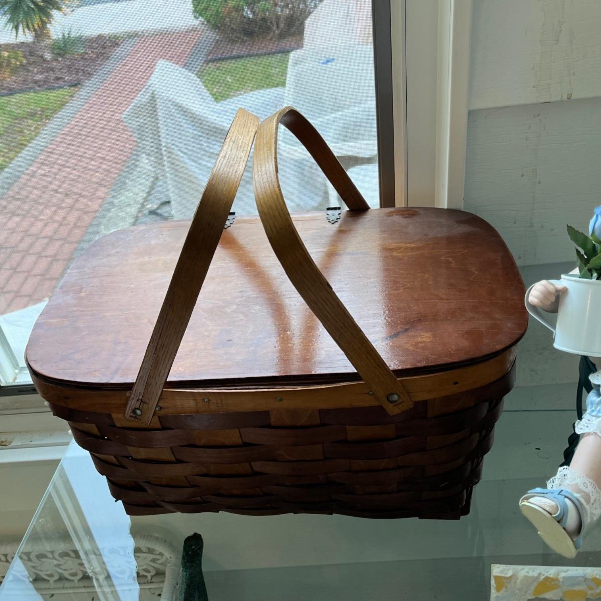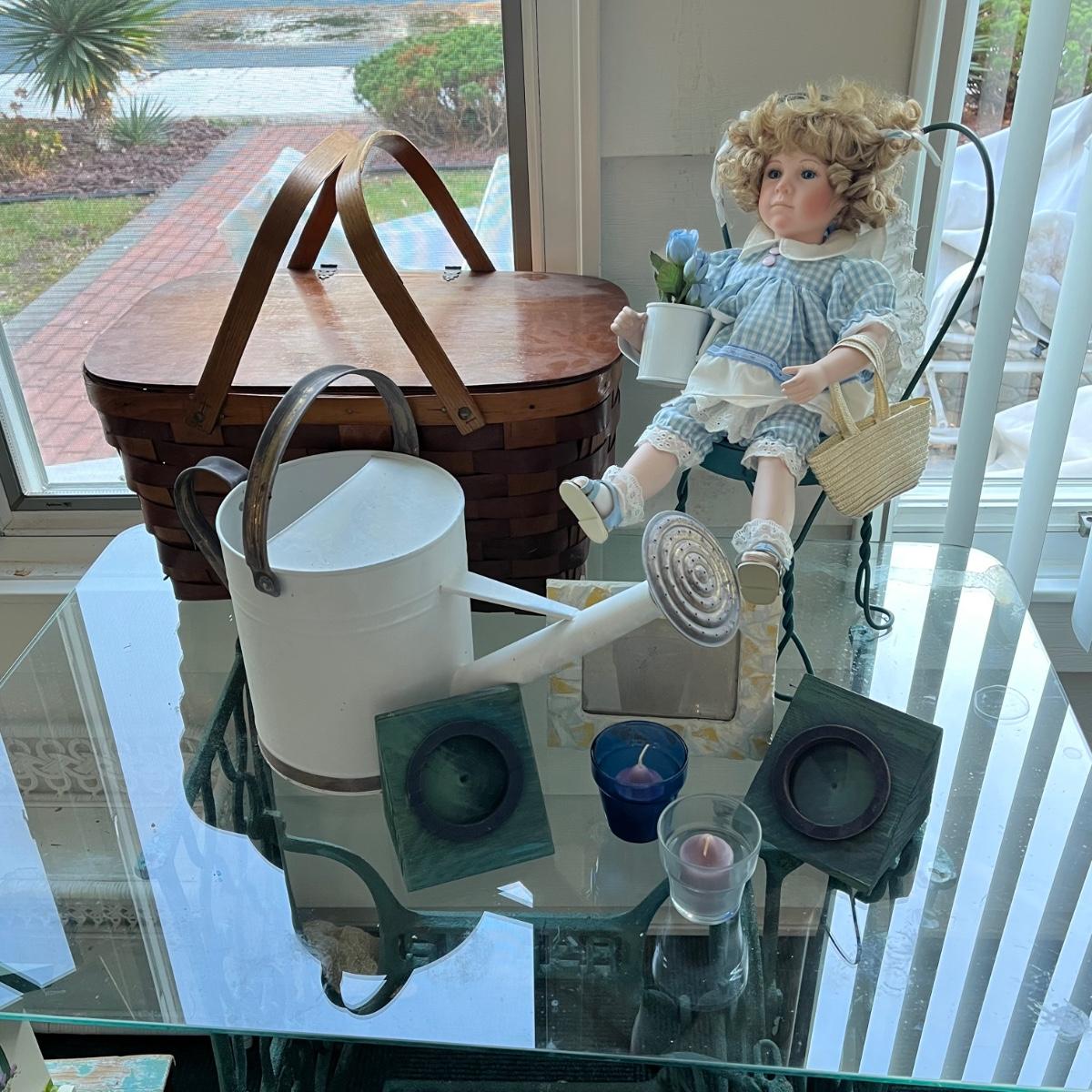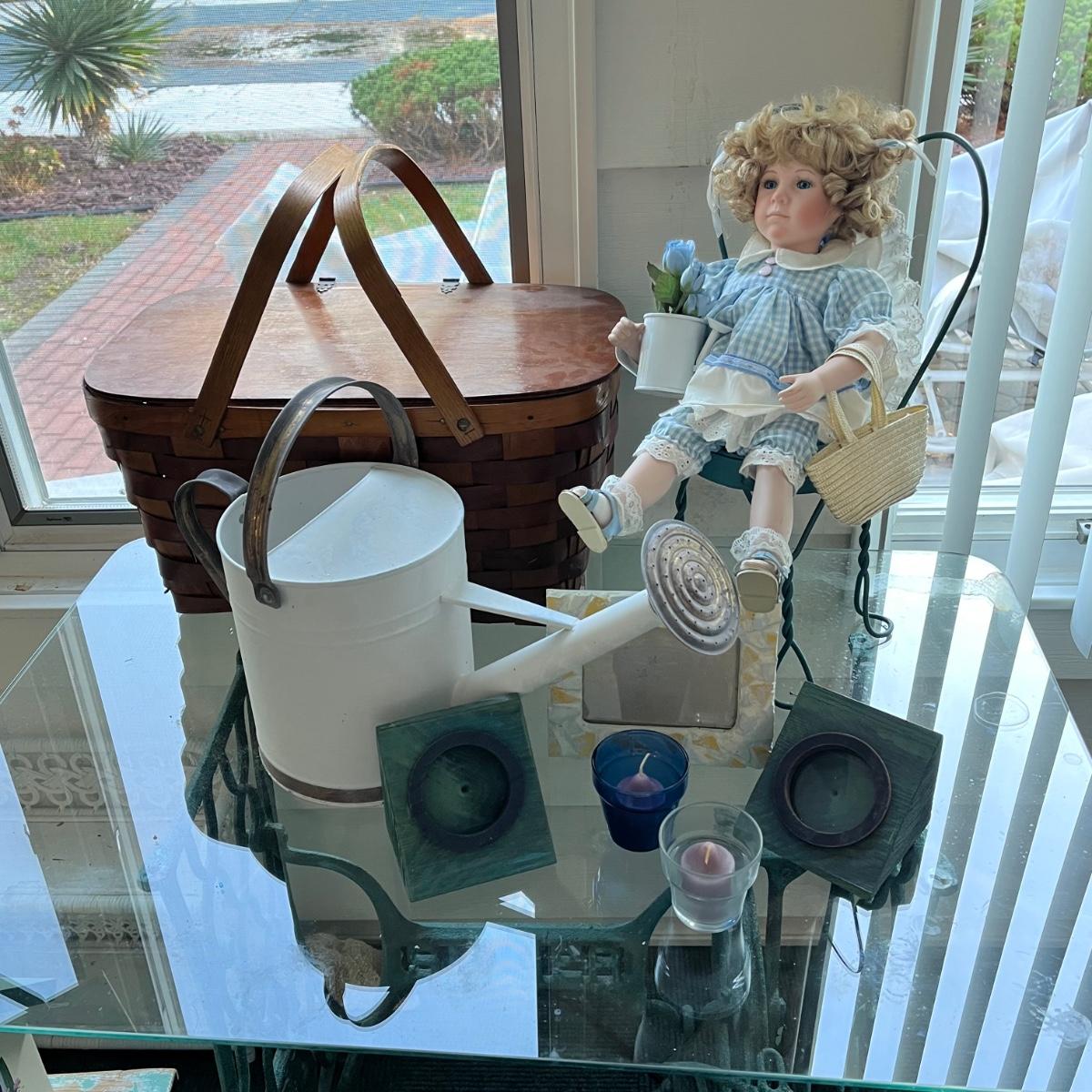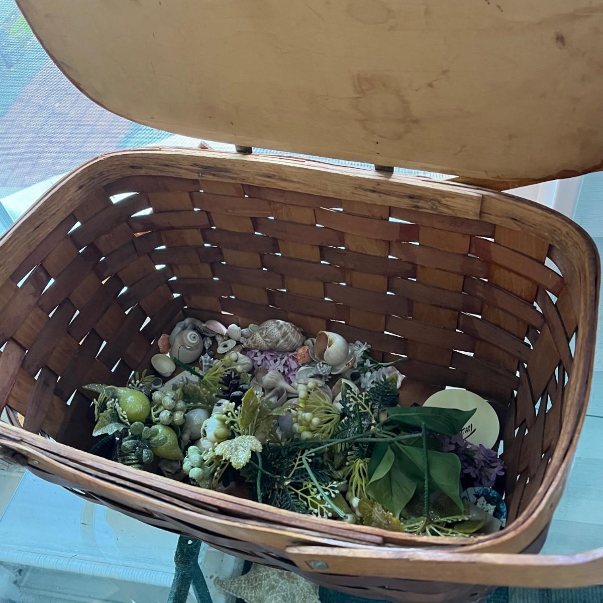 LOT 403P: Vintage Picnic Basket, Musical Doll, Seashells, Frames and more