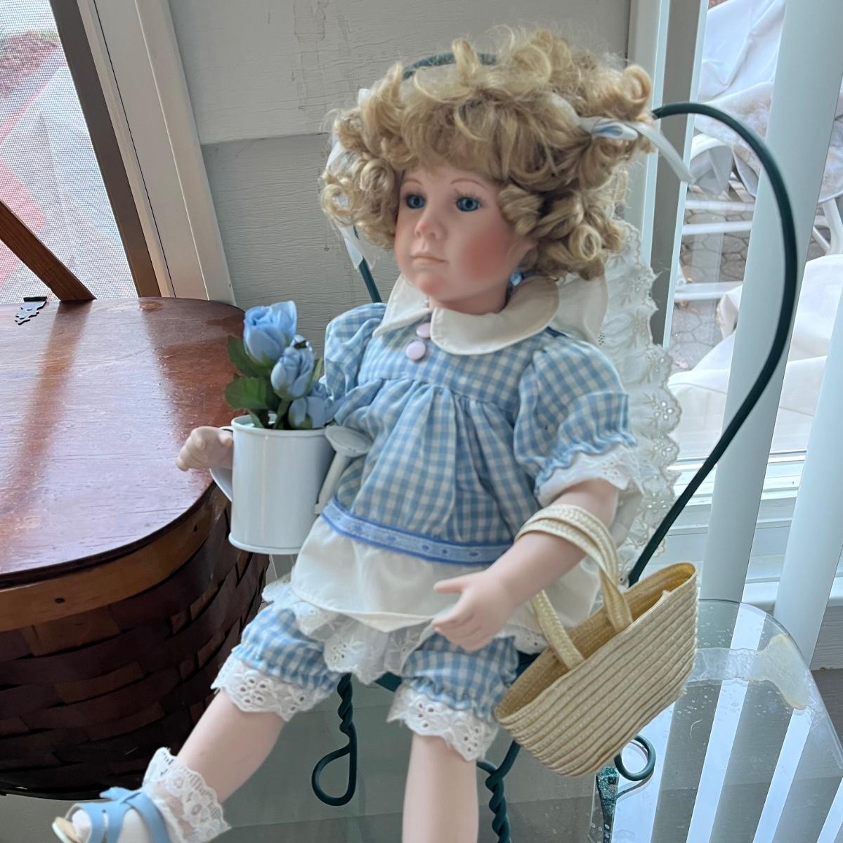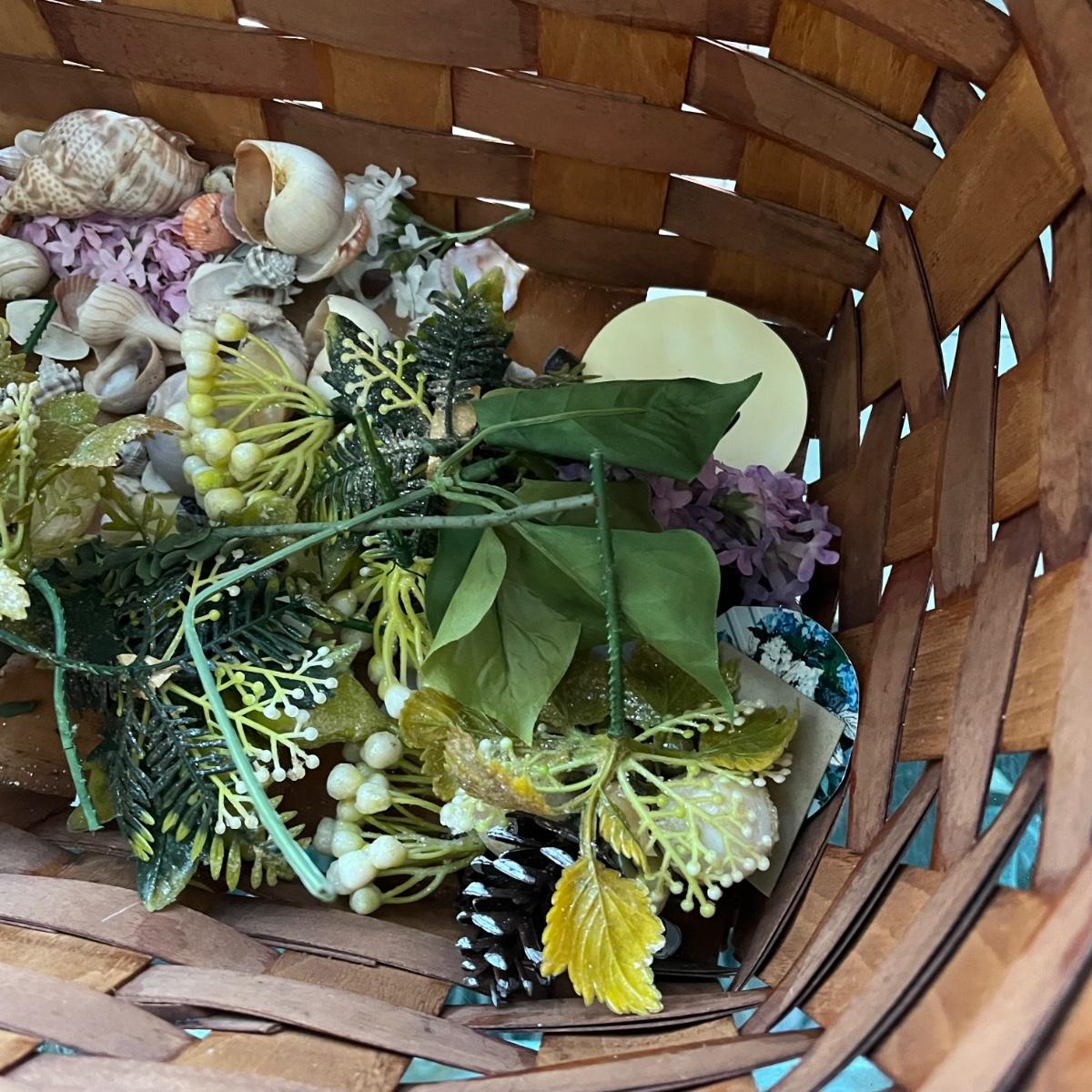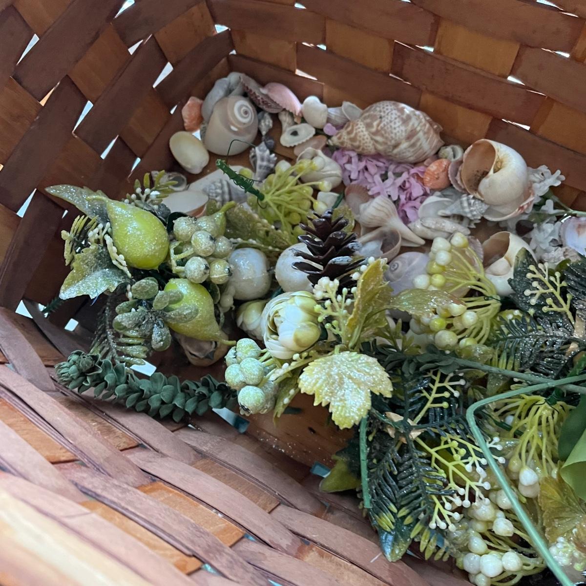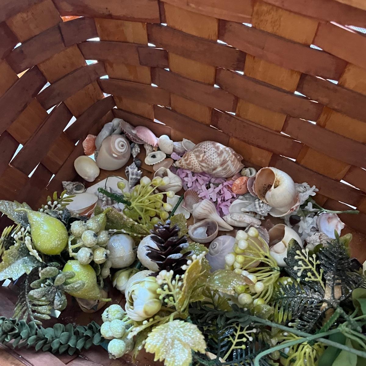 LOT 403P: Vintage Picnic Basket, Musical Doll, Seashells, Frames and more