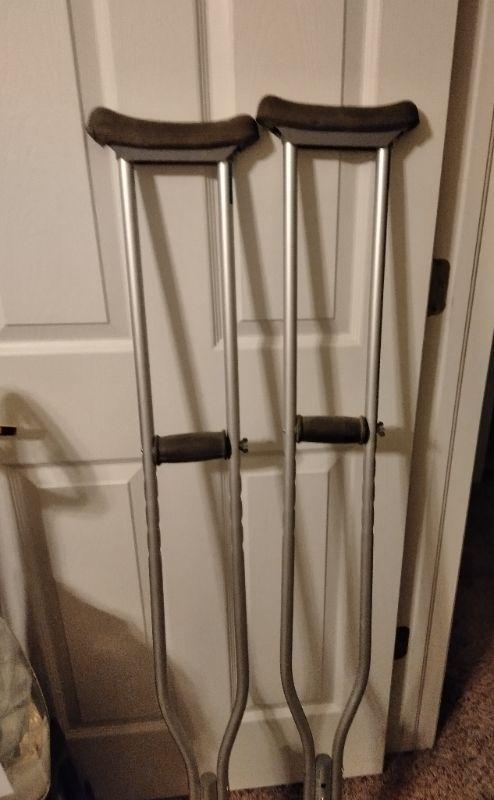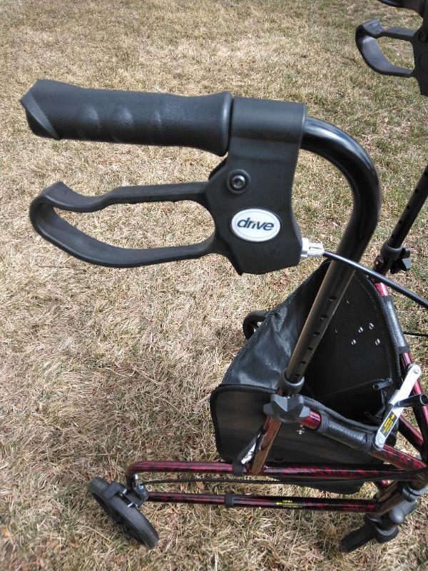 DRIVE RED THREE WHEEL WALKING AIDE WITH BRAKES AND STORAGE POUCH. ALSO COMES WITH A PAIR OF CRUTCHES.