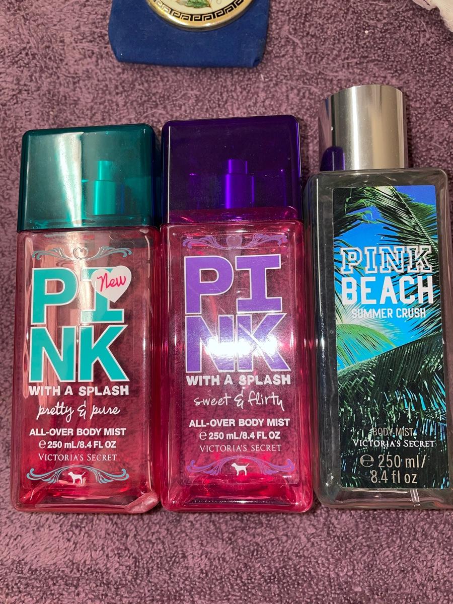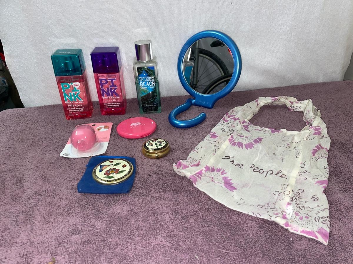 3 Victoria Secret Pink Body Sprays, Magnifying Mirror, Pink Compact Mirror, Cloisonne Mirror with Pouch, Small Pill Case.