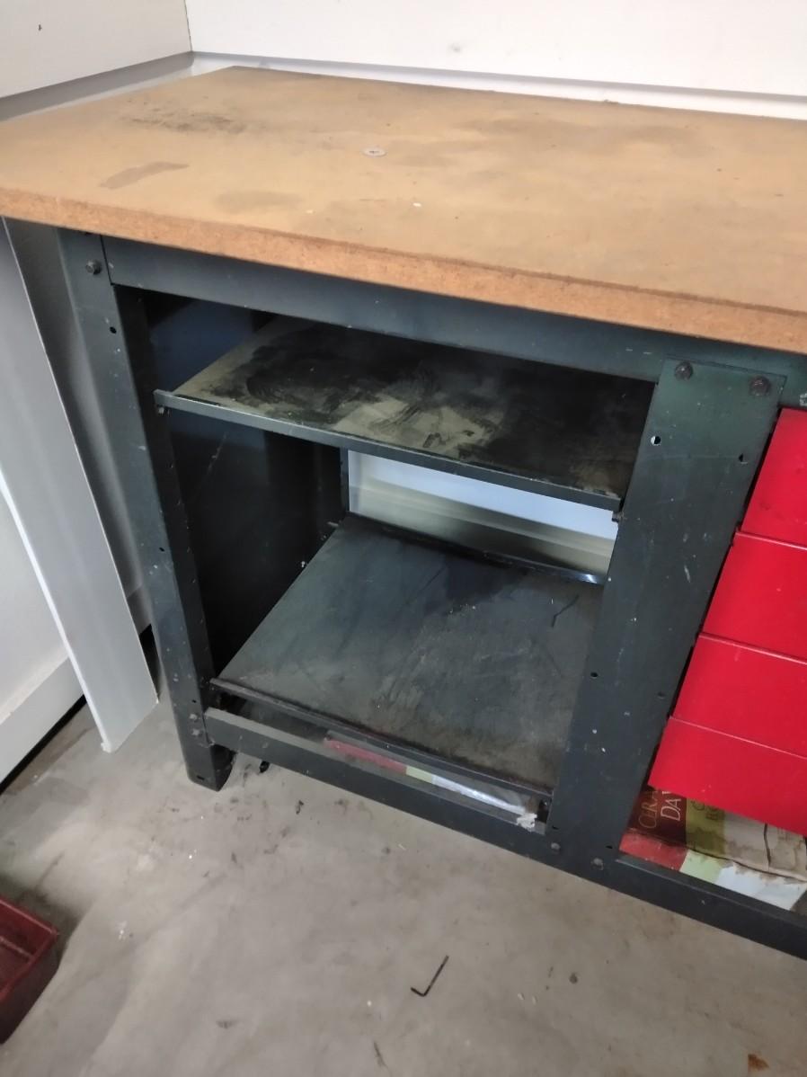 4 DRAWER WORK BENCH, THE WOOD TOP IS STAINED/DIRTY 33.5" X 60" X 24"