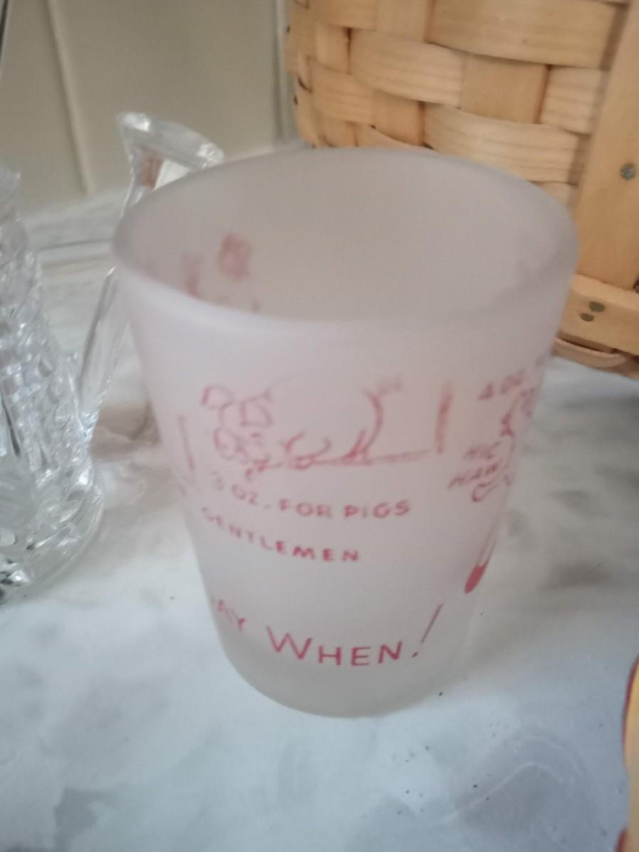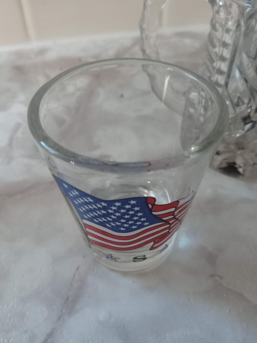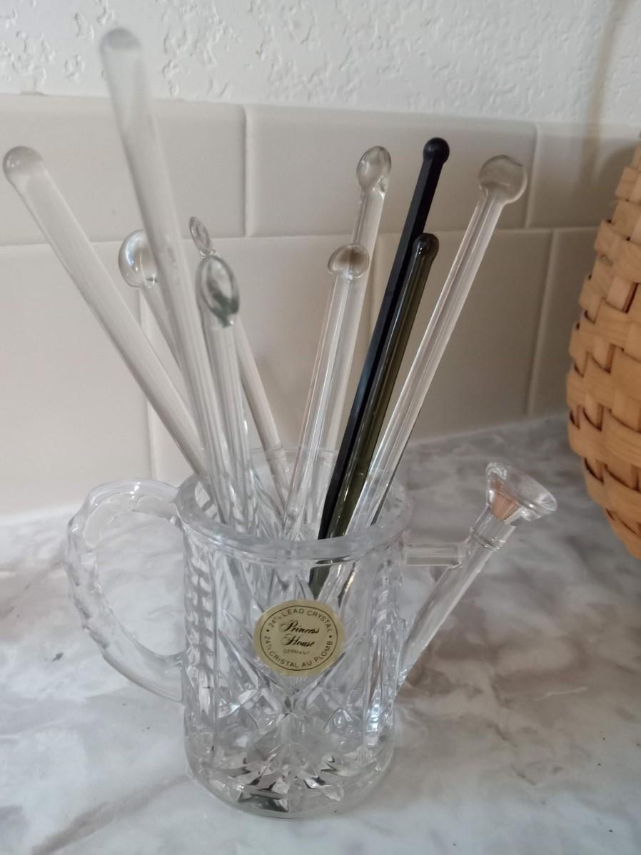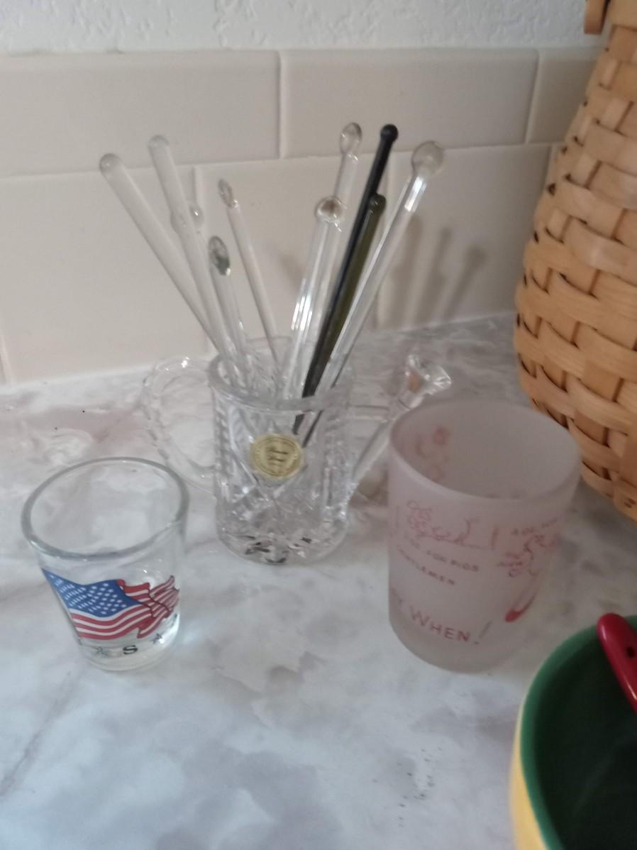 LOT 405  CONDIMENT DISH, SHOT GLASSES, GLASS STIR STICKS AND A BASKET