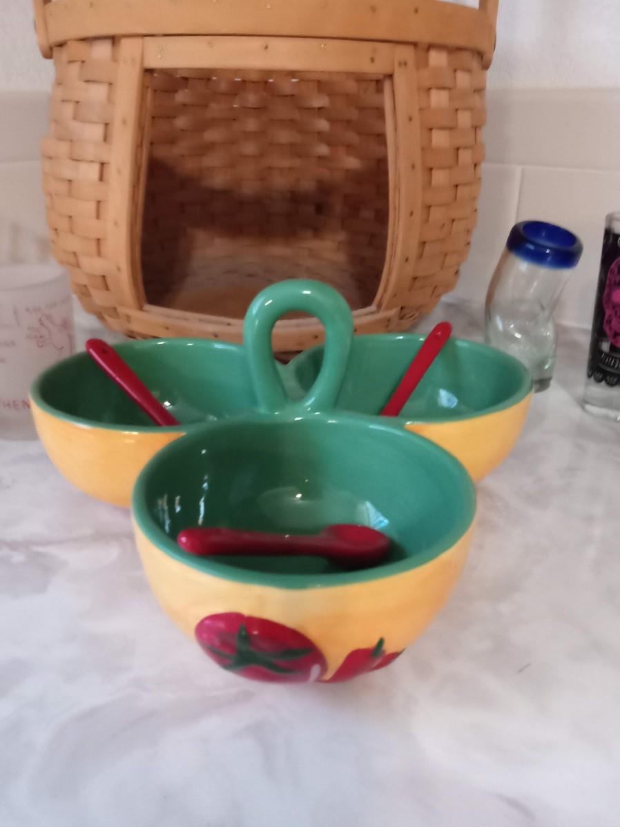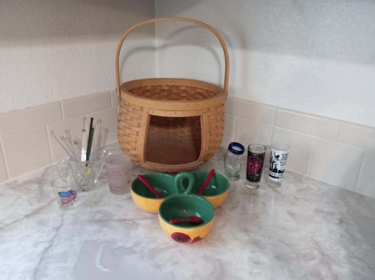 I CAN VISUALIZE CORN CHIPS FLOWING OUT THE SIDE OF THE BASKET AND THE TRIPLE DISH FILLED WITH SALSA AND GUACAMOLE. THE SHOT GLASSES ARE FILLED WITH TEQUILA AND IT'S TIME TO PARTY!