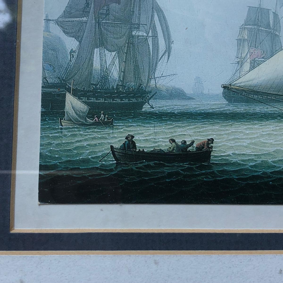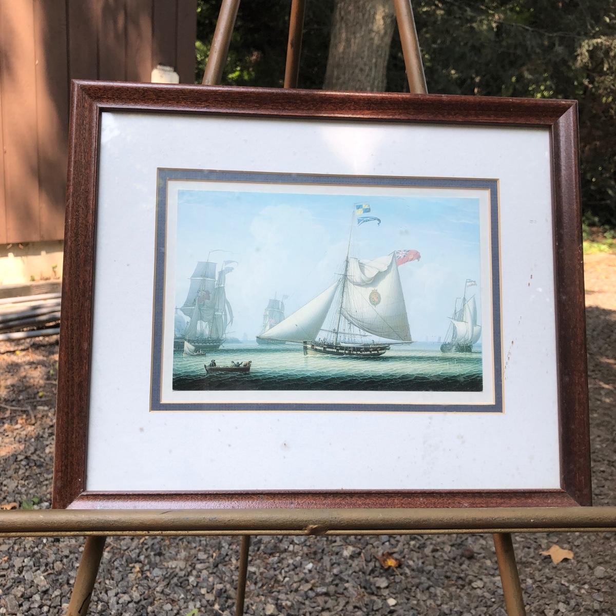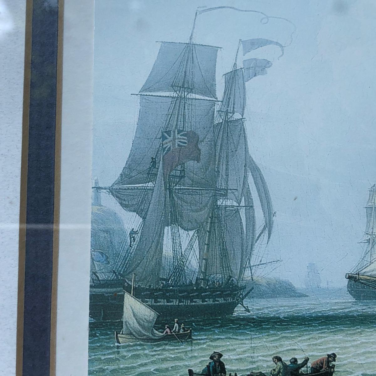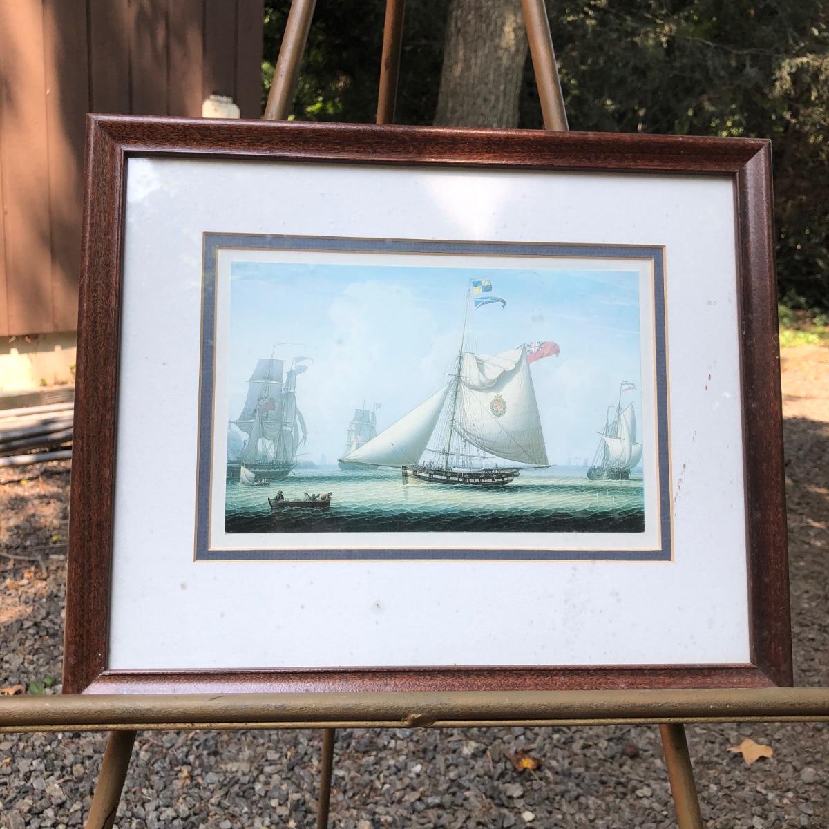 Both framed prints measure 14 x 12 inches. Salmon print depicts yacht with King George IV on board. Buttersworth print is of a New York Harbor.