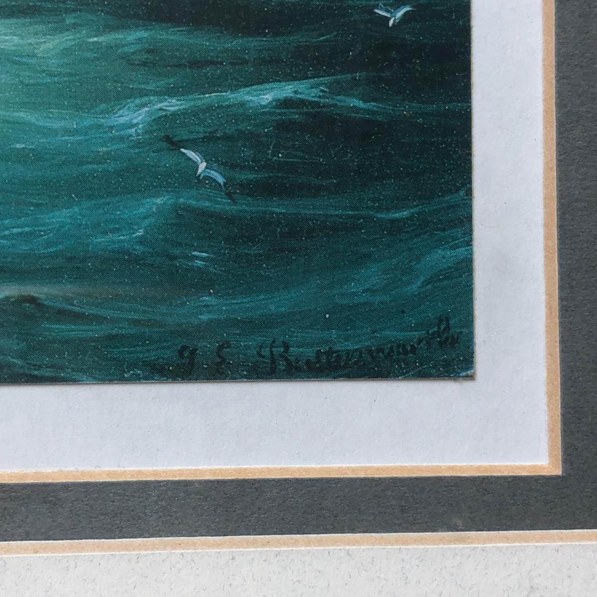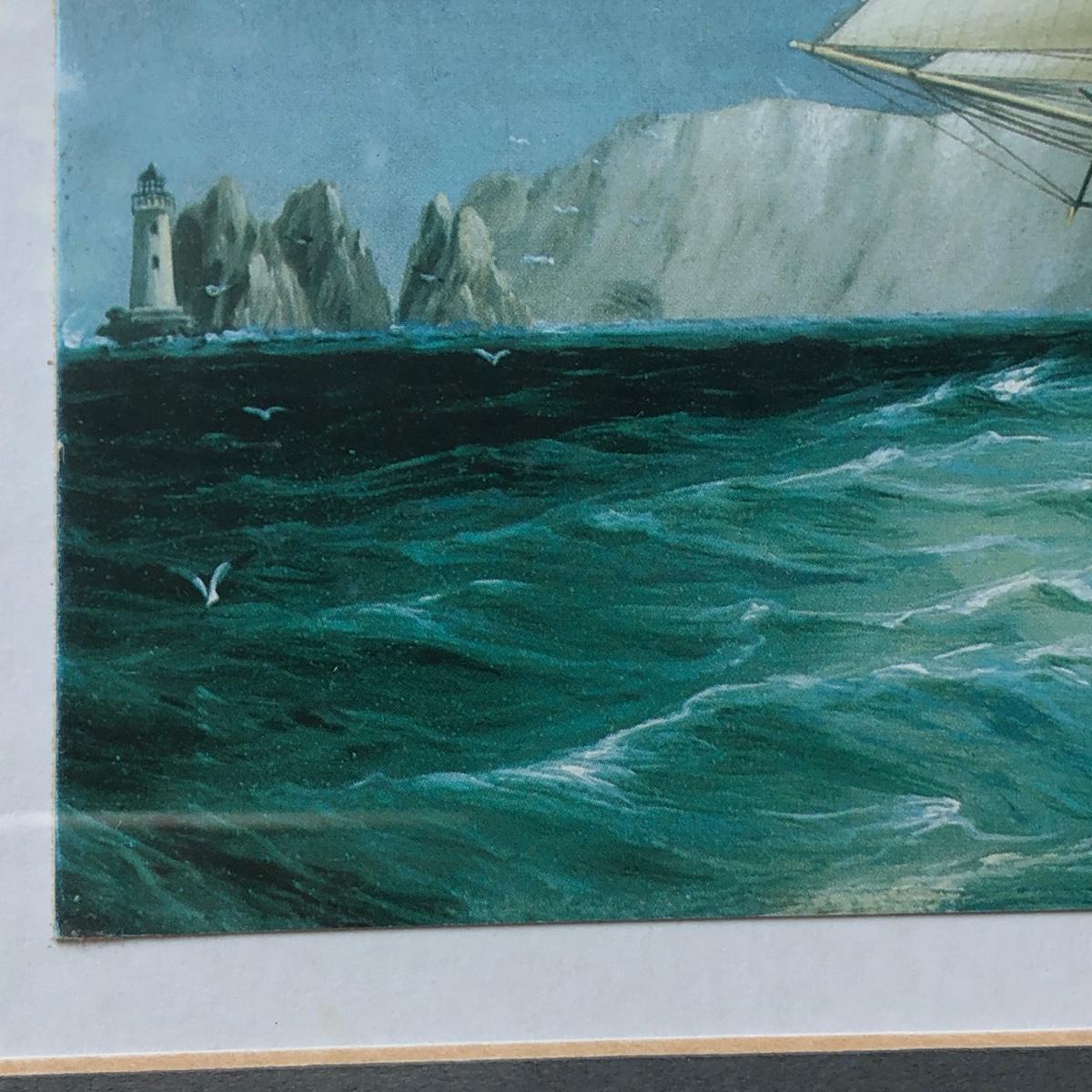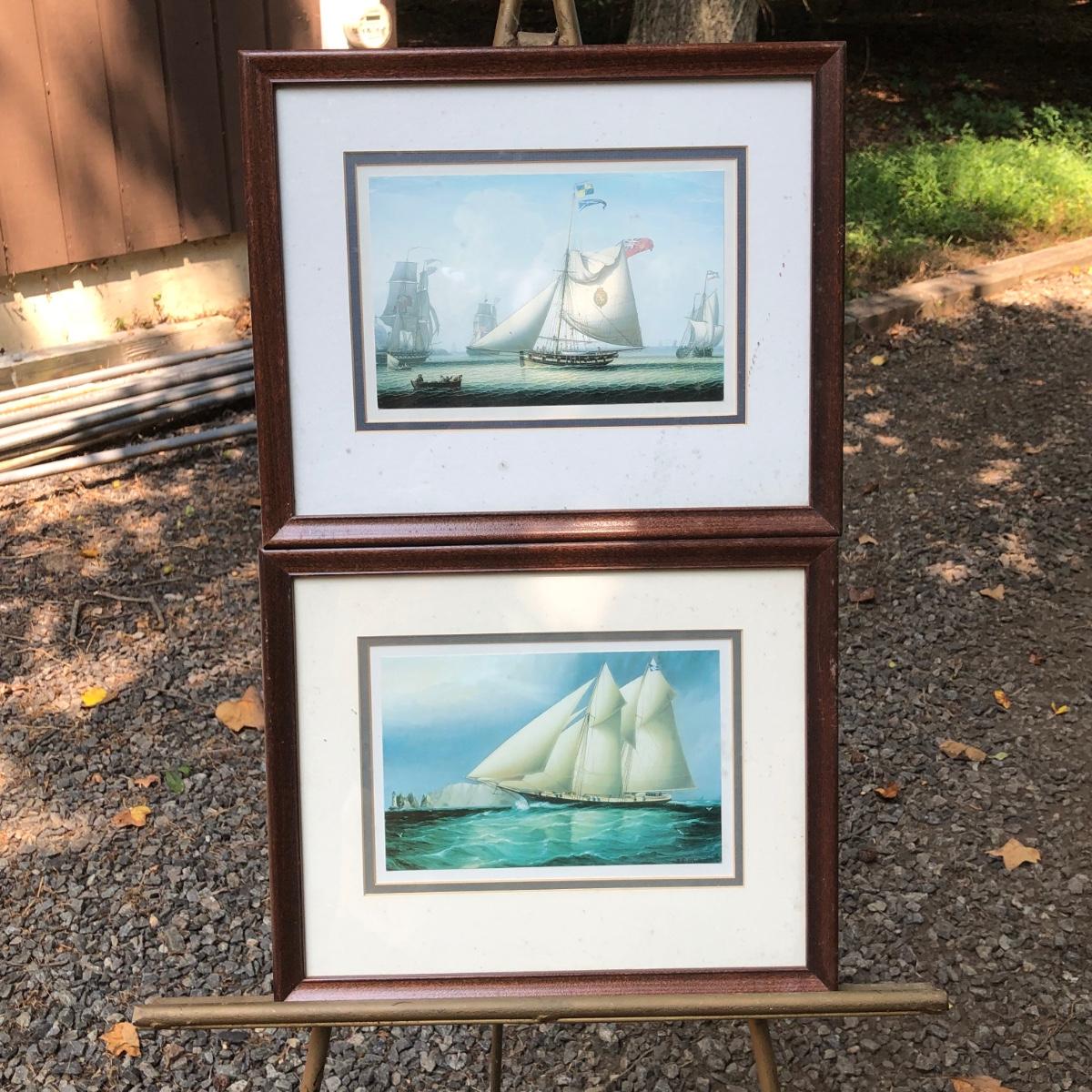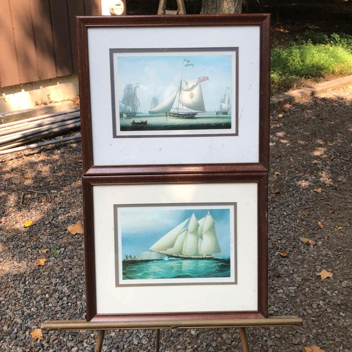 Both framed prints measure 14 x 12 inches. Salmon print depicts yacht with King George IV on board. Buttersworth print is of a New York Harbor.
