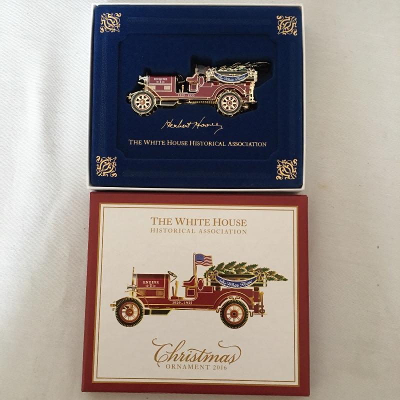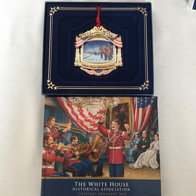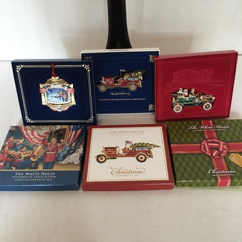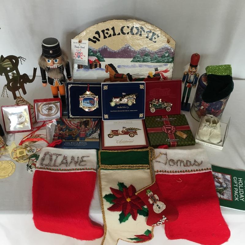 Lovely collection of Christmas decorations including three White House historical association ornaments, Godinger salt and pepper shakers, hand stenciled slate, nutcracker and more.