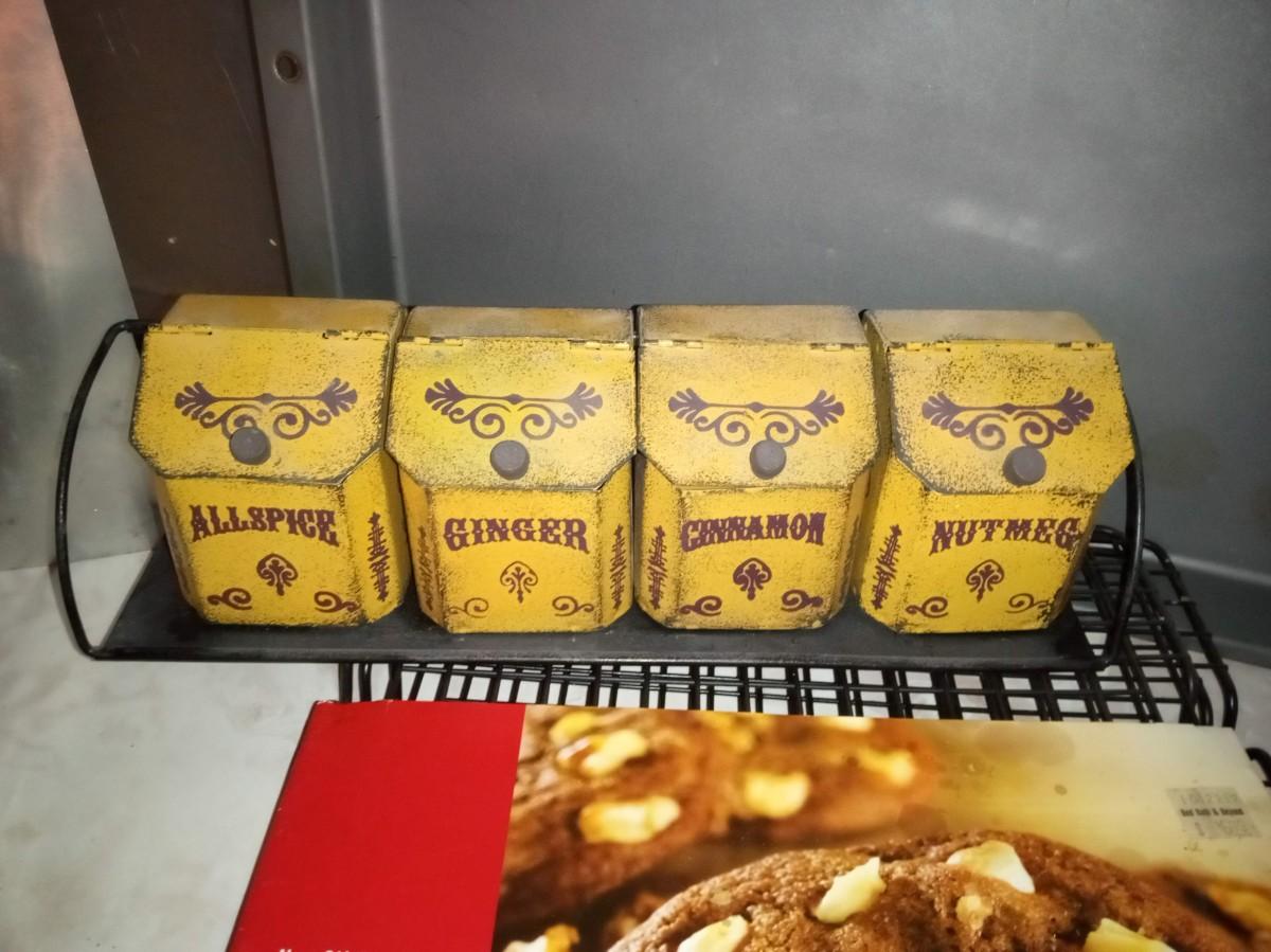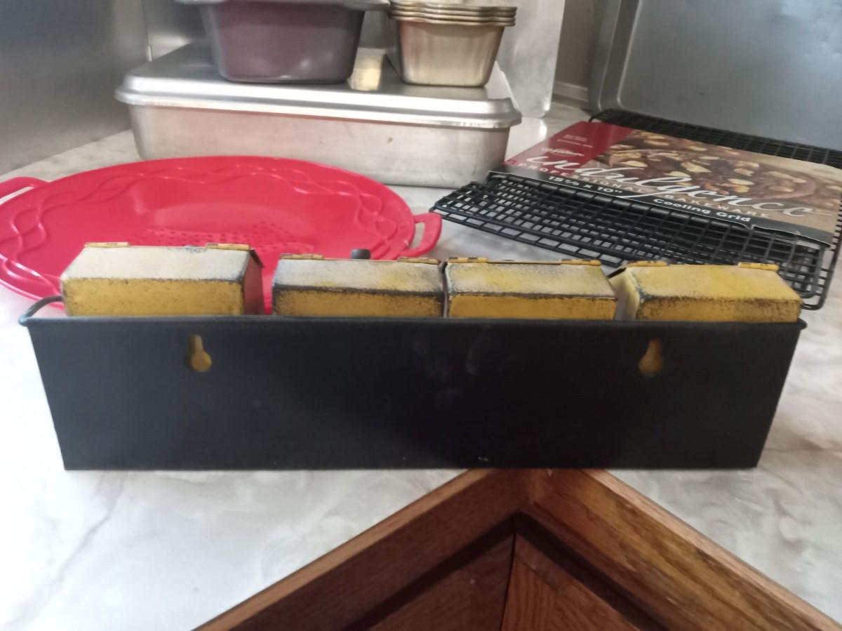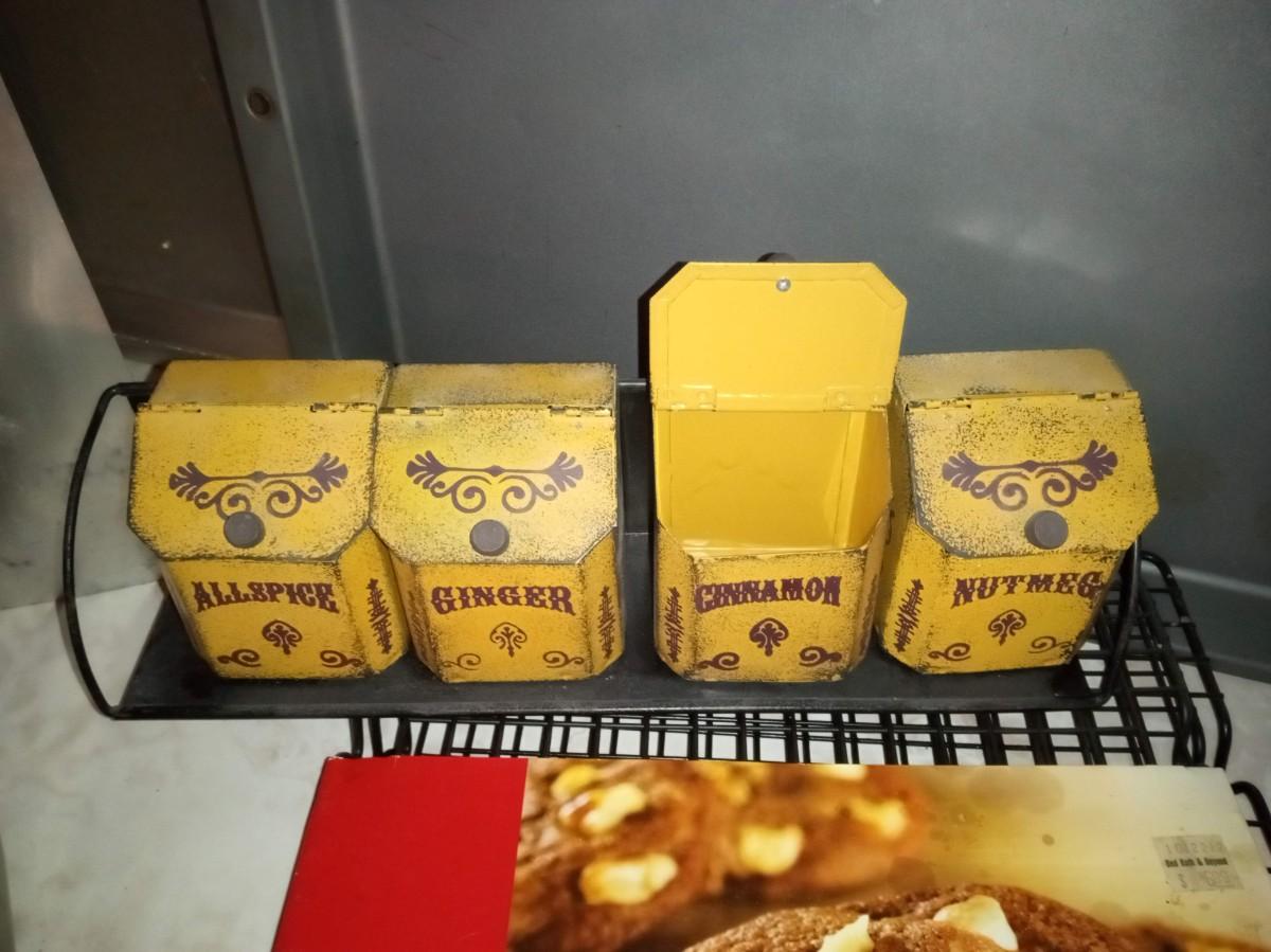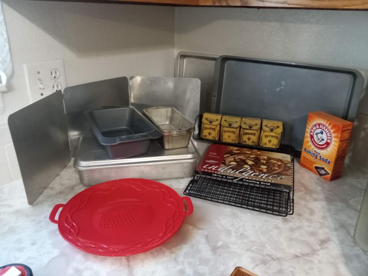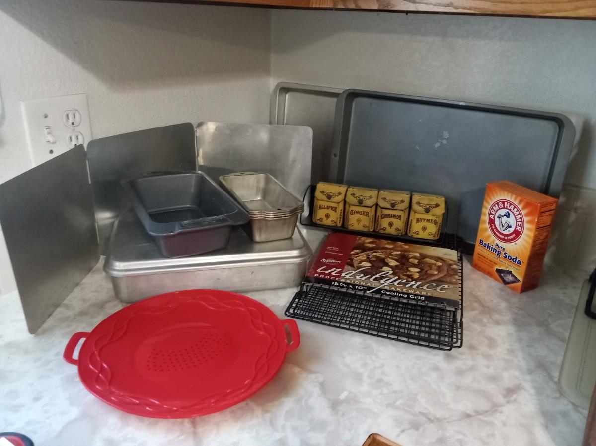 TIN SPICE HOLDERS, COOLING RACKS, COOKIE SHEETS, CAKE PAN WITH LID, LOAF PANS, RUBBER PIZZA PAN AND SOME BAKING SODA
