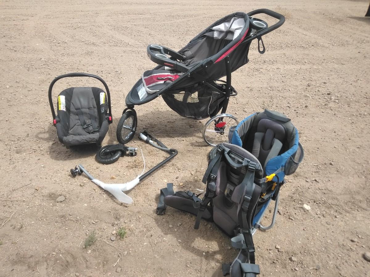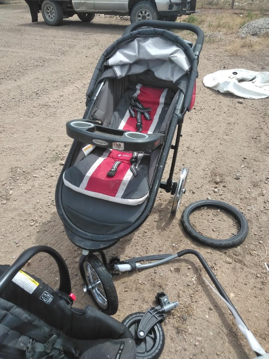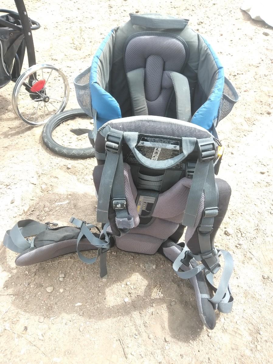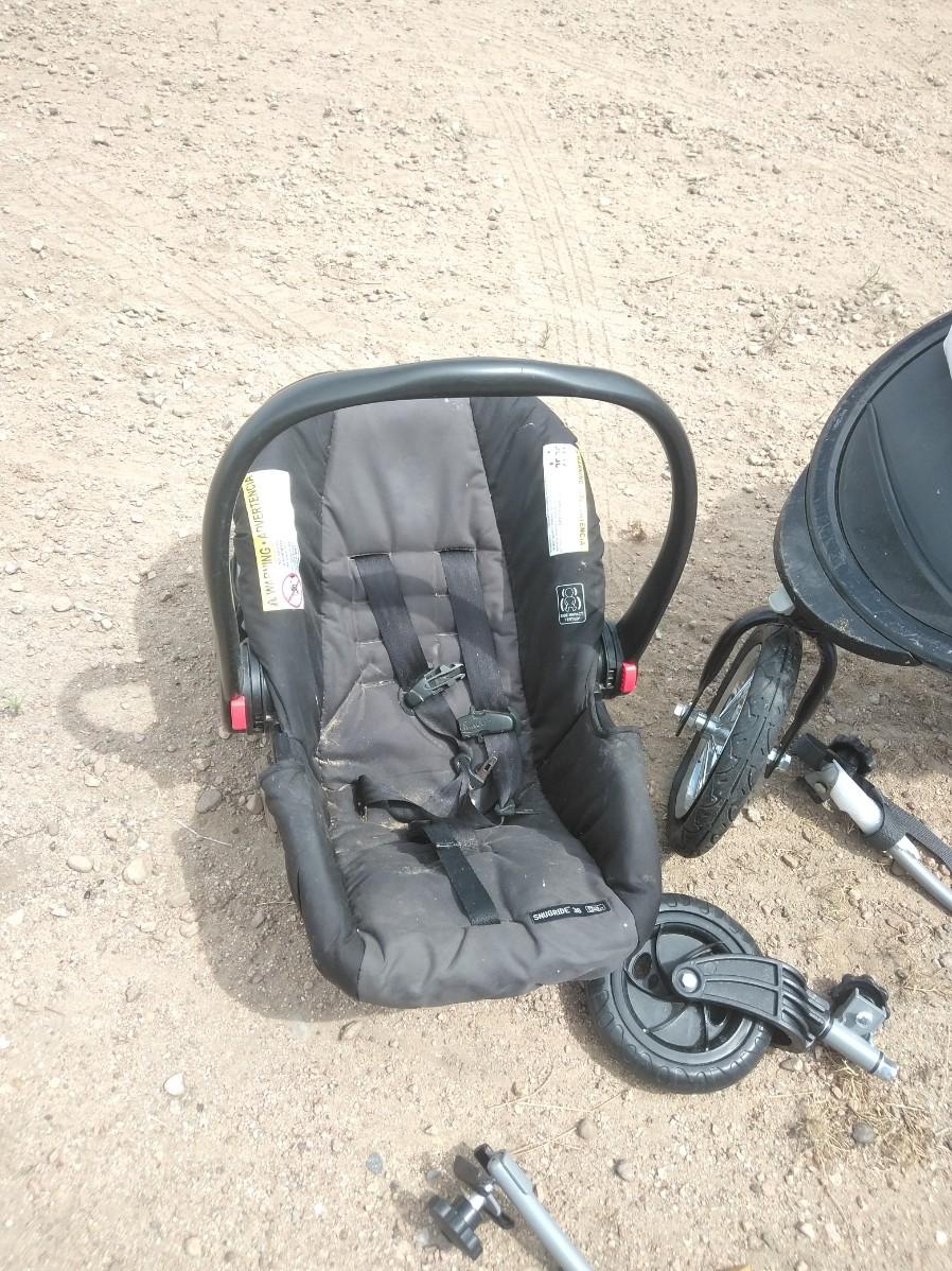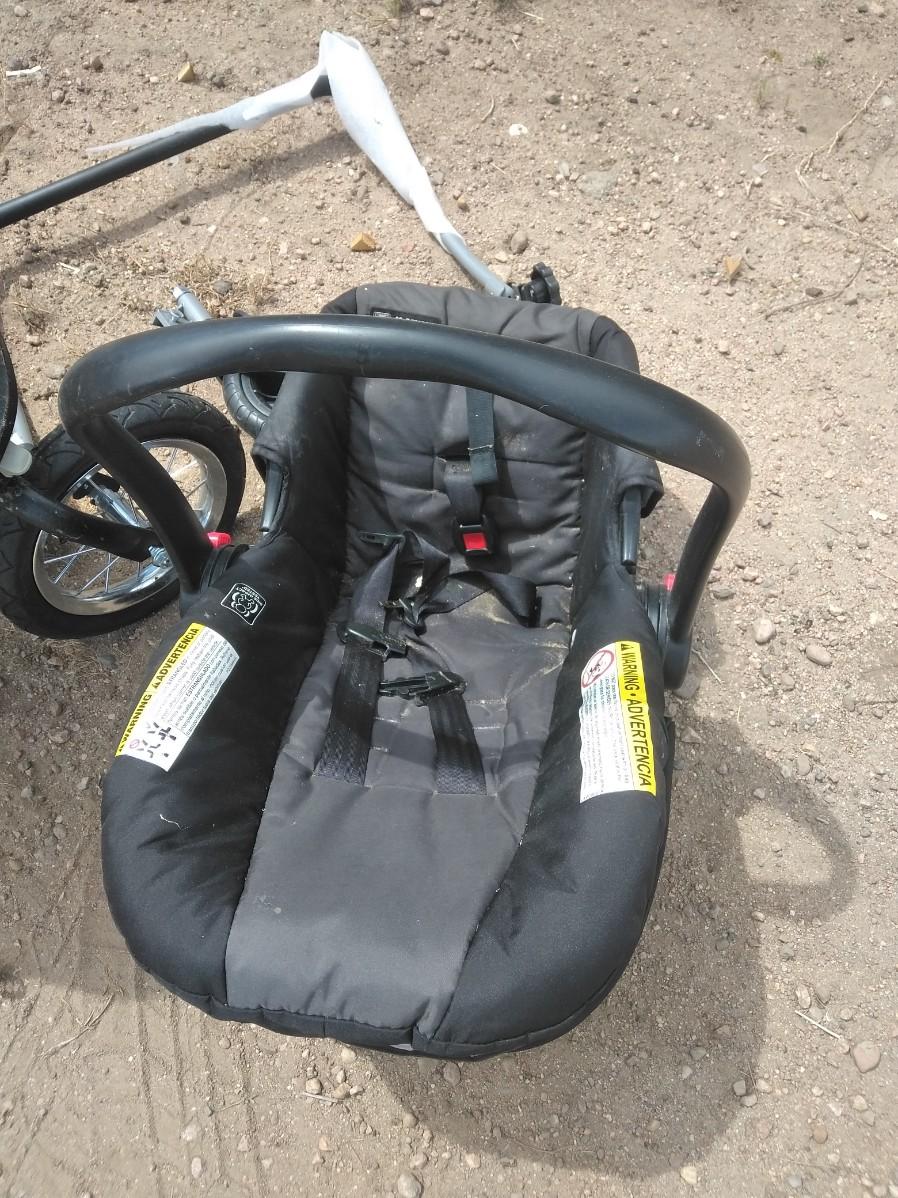 THREE WHEELED STROLLER (needs tire repair), BACK CARRIER, AND CAR SEAT. PLEASE BE ADVISED CHILDREN'S ITEMS / BABY ITEMS MAY HAVE BEEN RECALLED, THESE ITEMS HAVE NOT BEEN CHECKED FOR ANY RECALL.