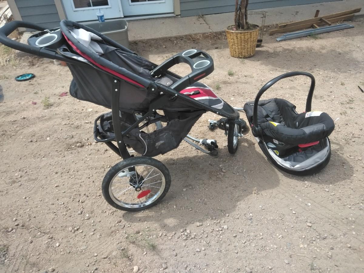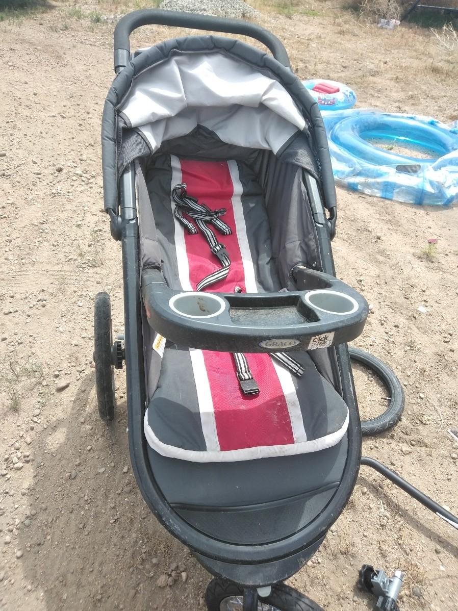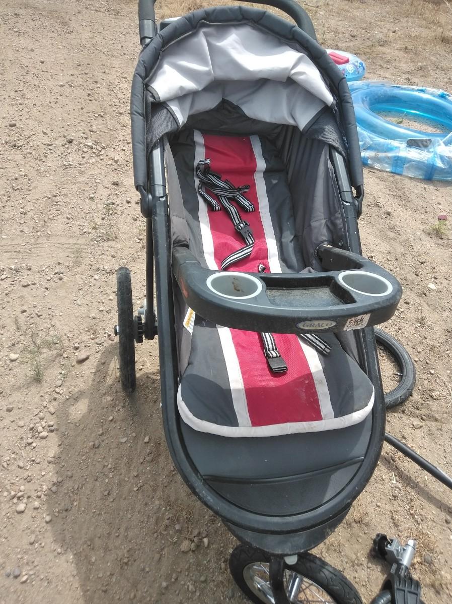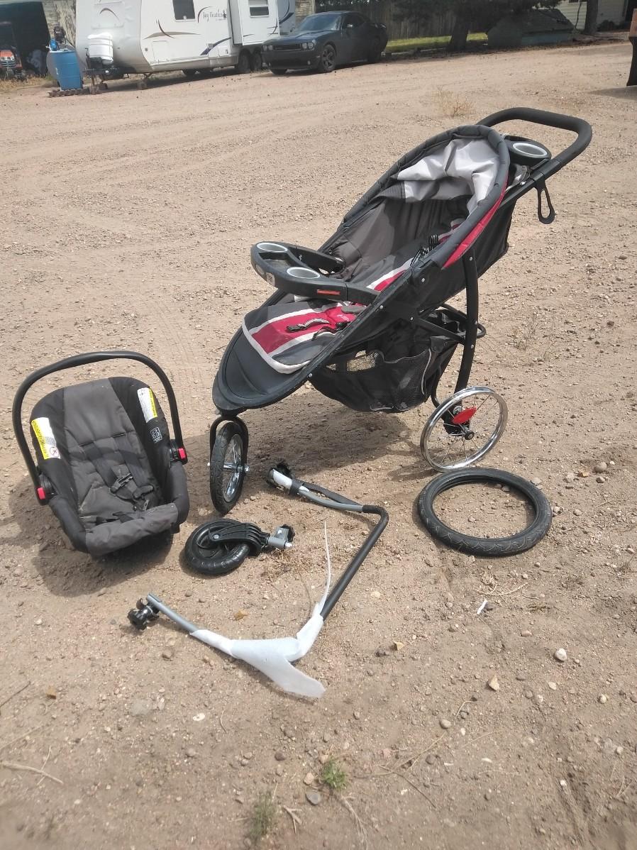THREE WHEELED STROLLER (needs tire repair), BACK CARRIER, AND CAR SEAT. PLEASE BE ADVISED CHILDREN'S ITEMS / BABY ITEMS MAY HAVE BEEN RECALLED, THESE ITEMS HAVE NOT BEEN CHECKED FOR ANY RECALL.