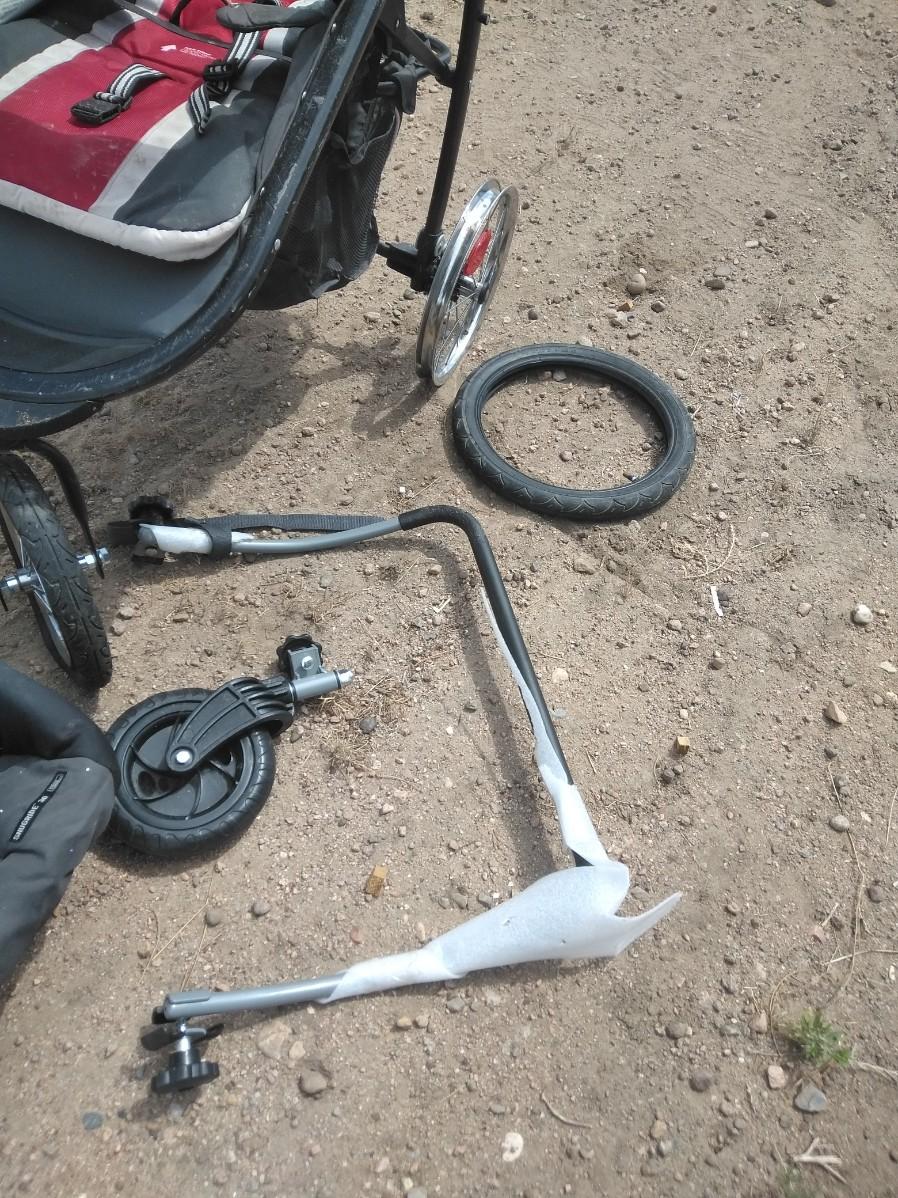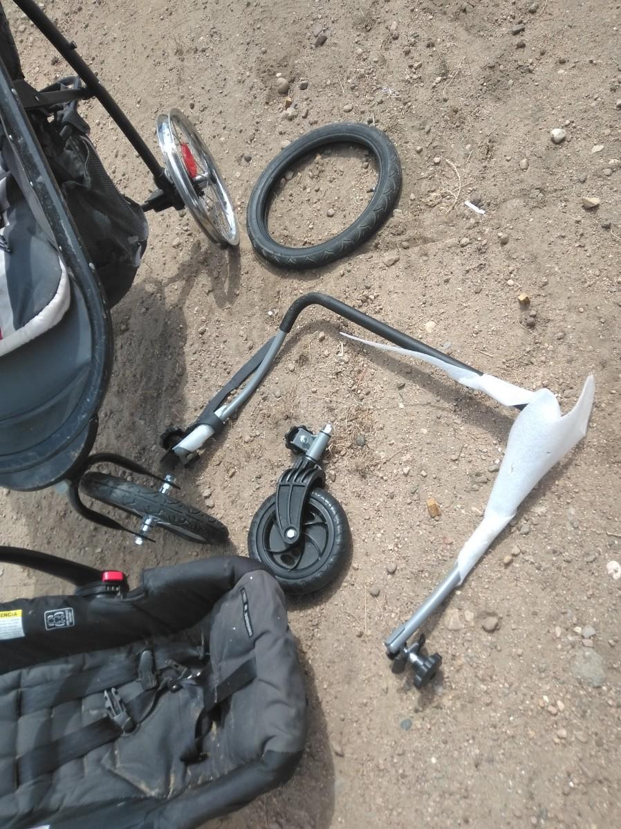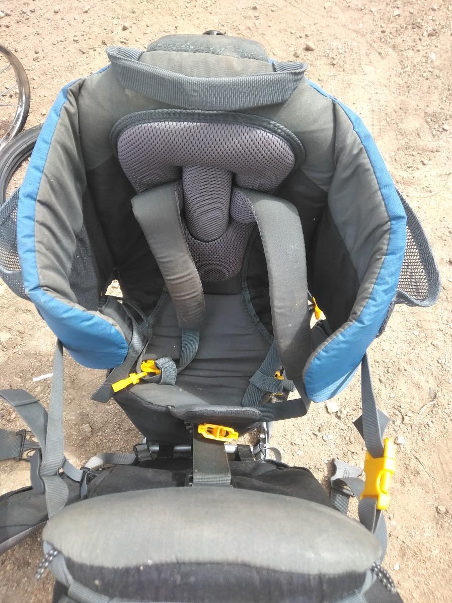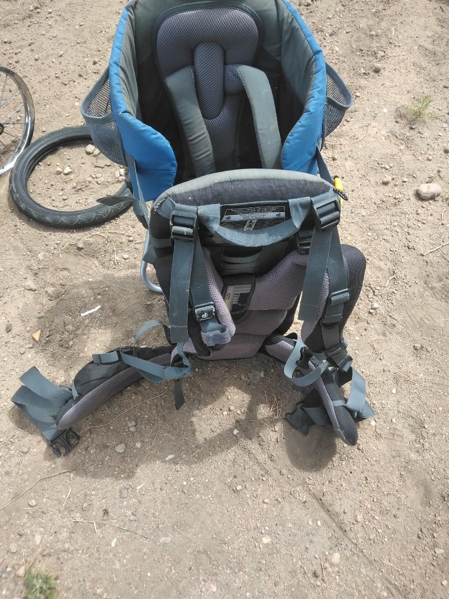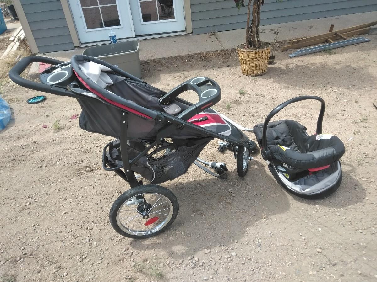 THREE WHEELED STROLLER (needs tire repair), BACK CARRIER, AND CAR SEAT. PLEASE BE ADVISED CHILDREN'S ITEMS / BABY ITEMS MAY HAVE BEEN RECALLED, THESE ITEMS HAVE NOT BEEN CHECKED FOR ANY RECALL.