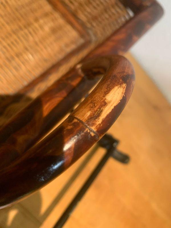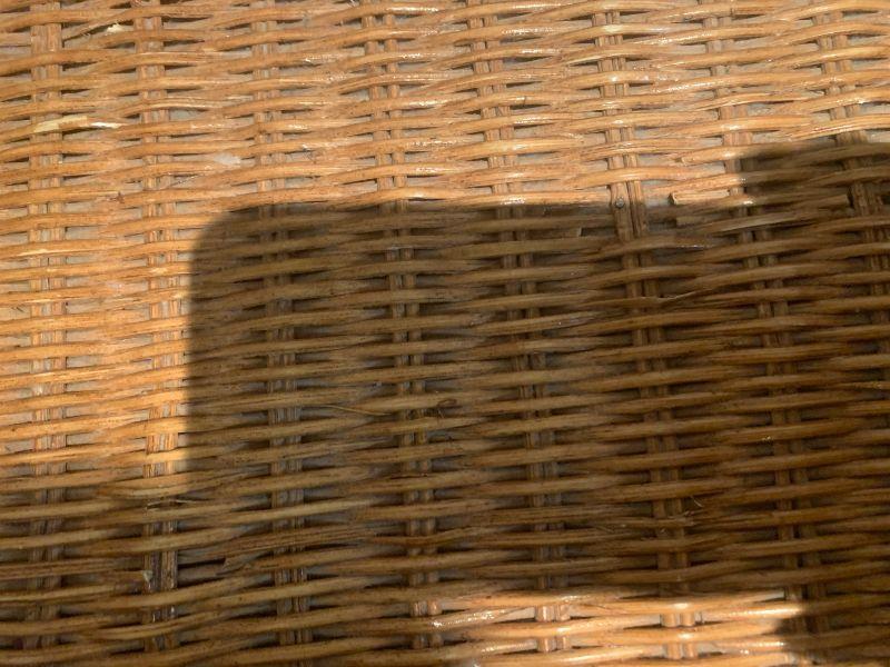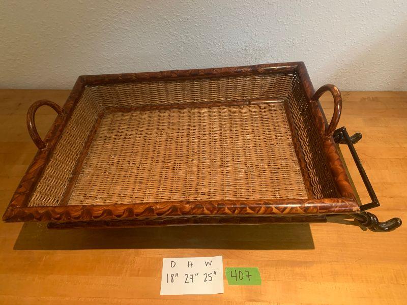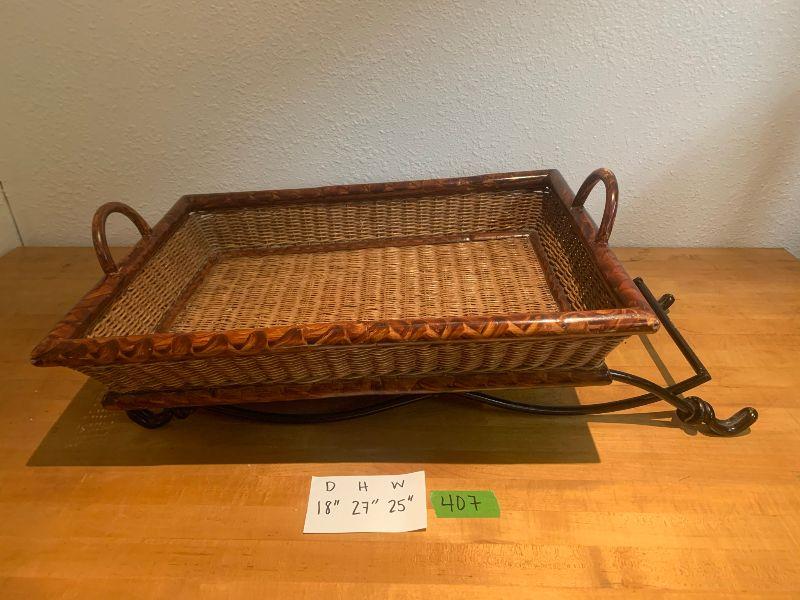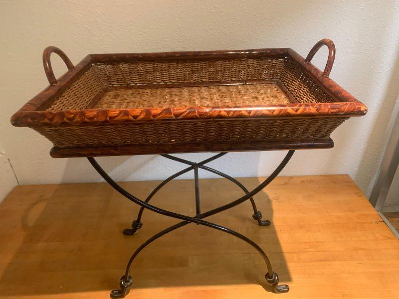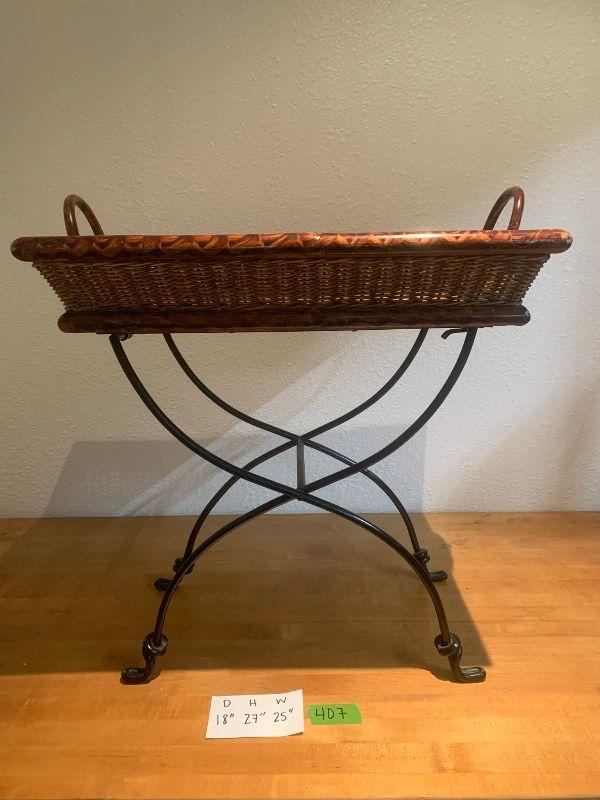 Folding basket stand metal legs and wicker and wooden basket