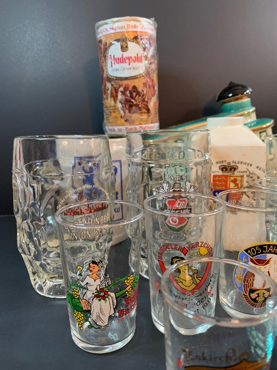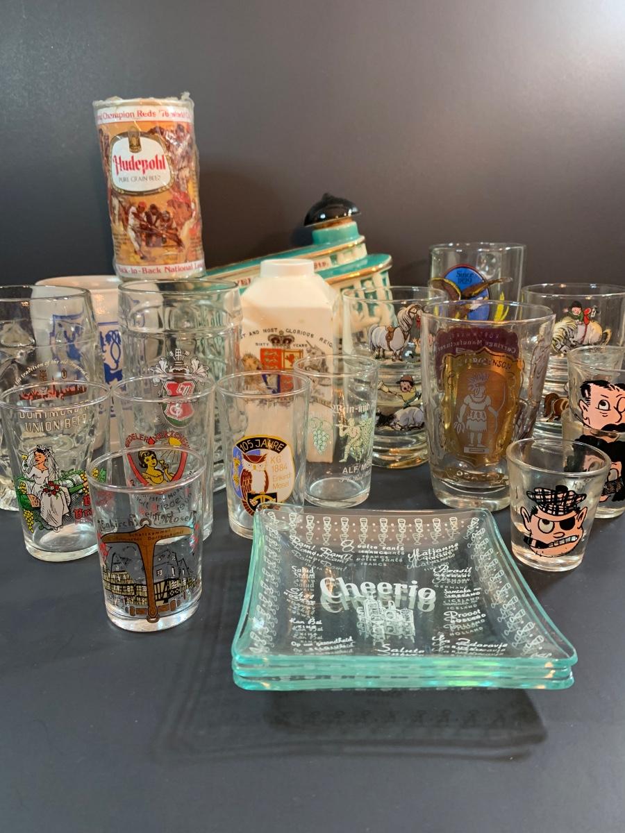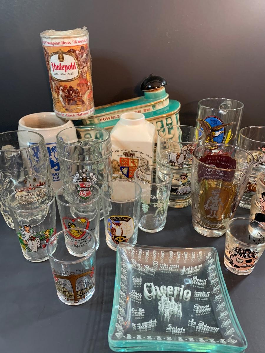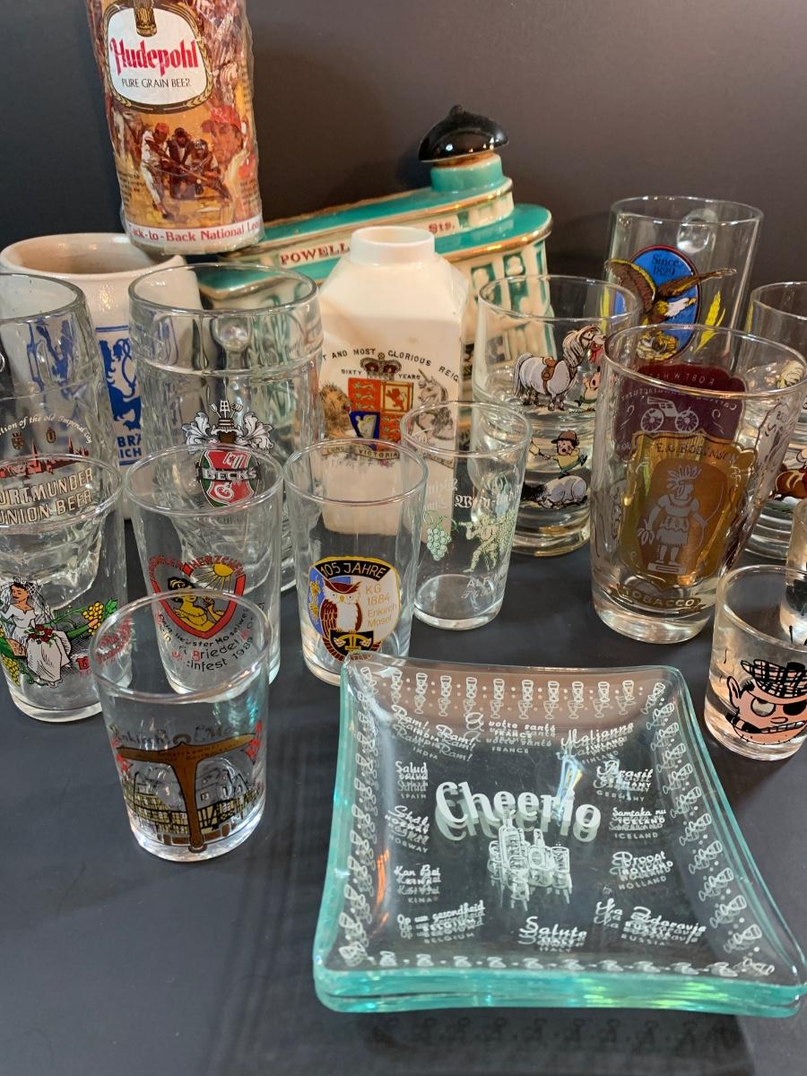 Lot 407: Vintage Bar Glasses, Steins, Shot Glasses, Ashtrays, Decanters & More