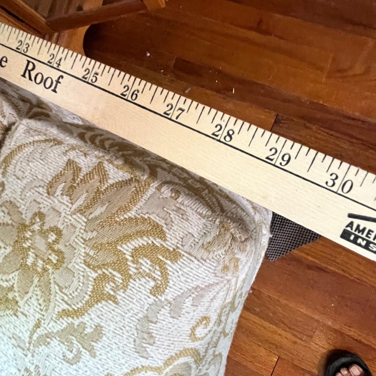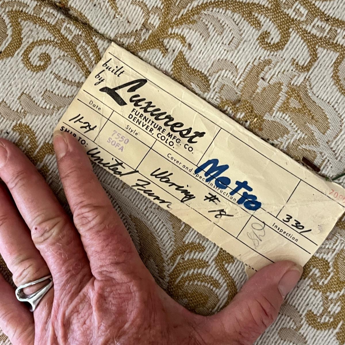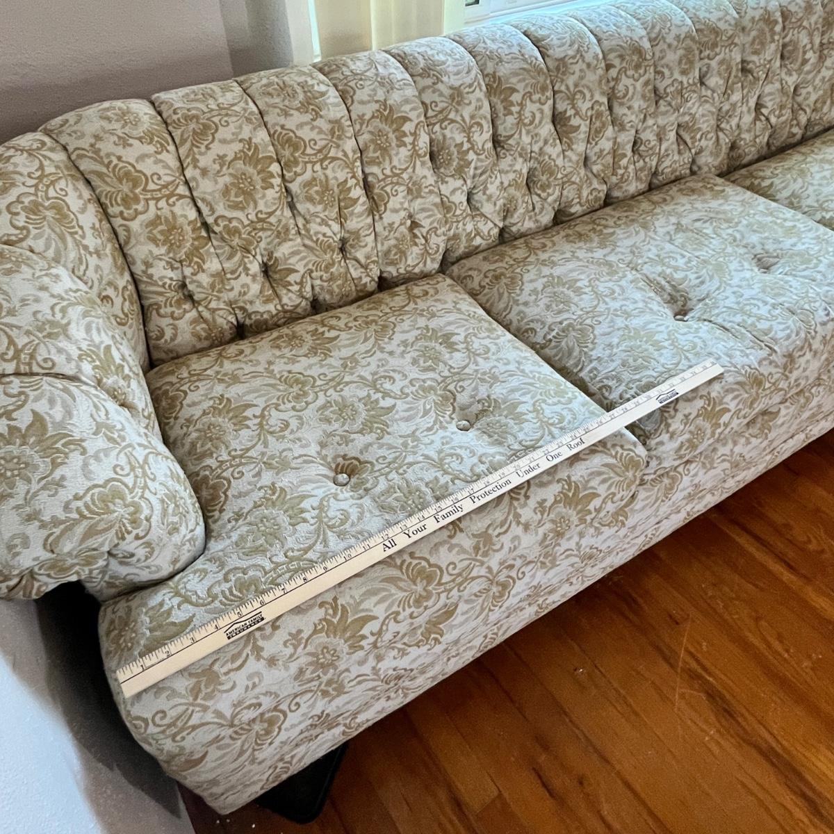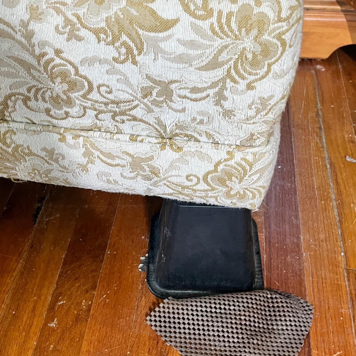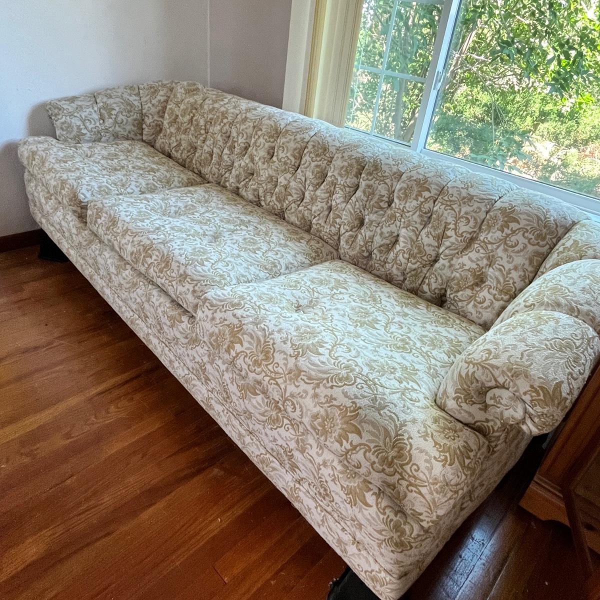 This couch is sitting on risers. Quite a beautiful couch! No damage or stains. NOT A SLEEPER!