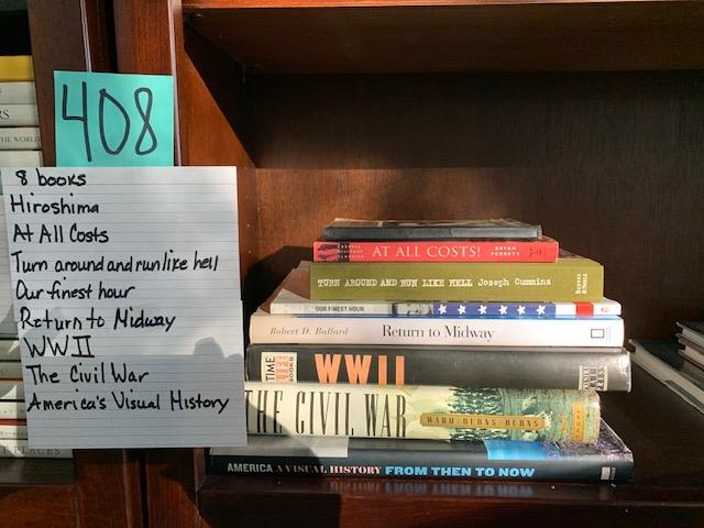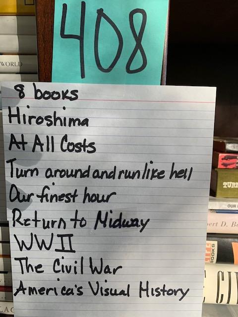 8 books: Hiroshima, Turn around “🦆, Return to “🦆, At all costs, our finest hour, WWII, Civil War, Plus