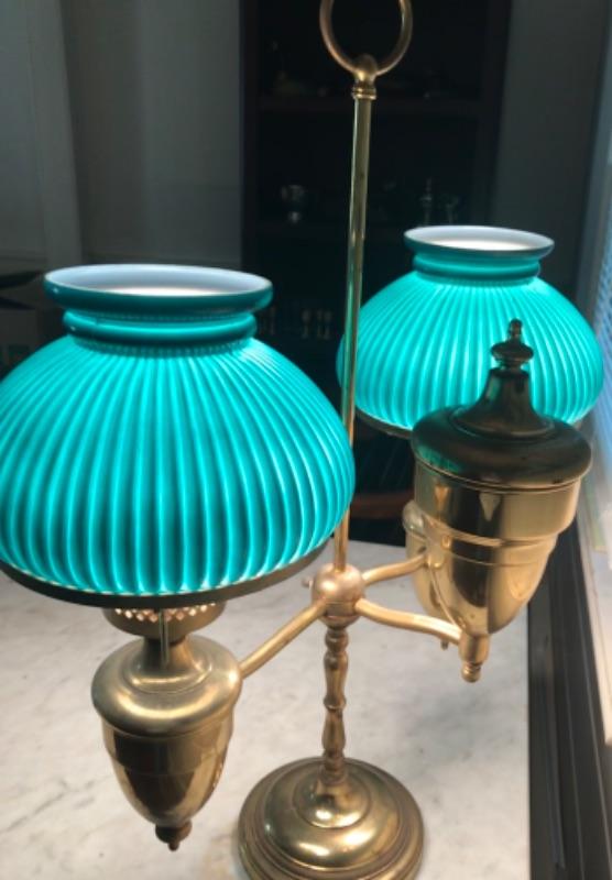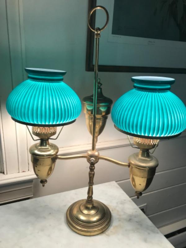 ANTIQUE BRASS STUDENT DESK LAMP WITH ORIGINAL GREEN GLASS SHADES