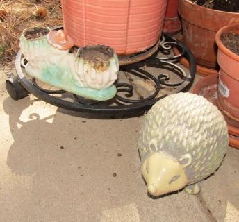 CERAMIC HEDGEHOG & CLAY POT OF SLEEPING MAN WITH SOMBRERO BETWEEN CACTUS