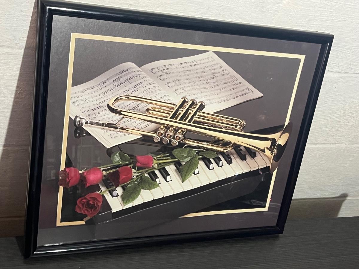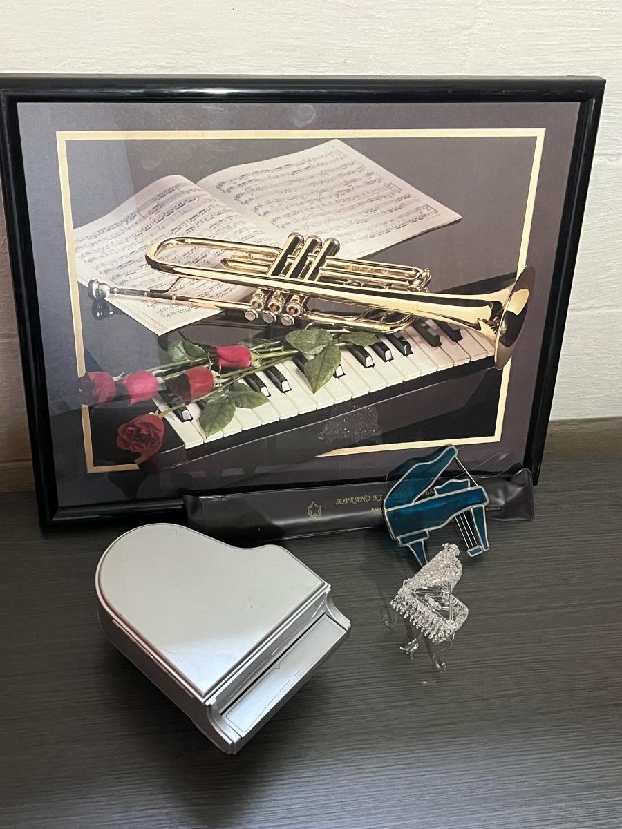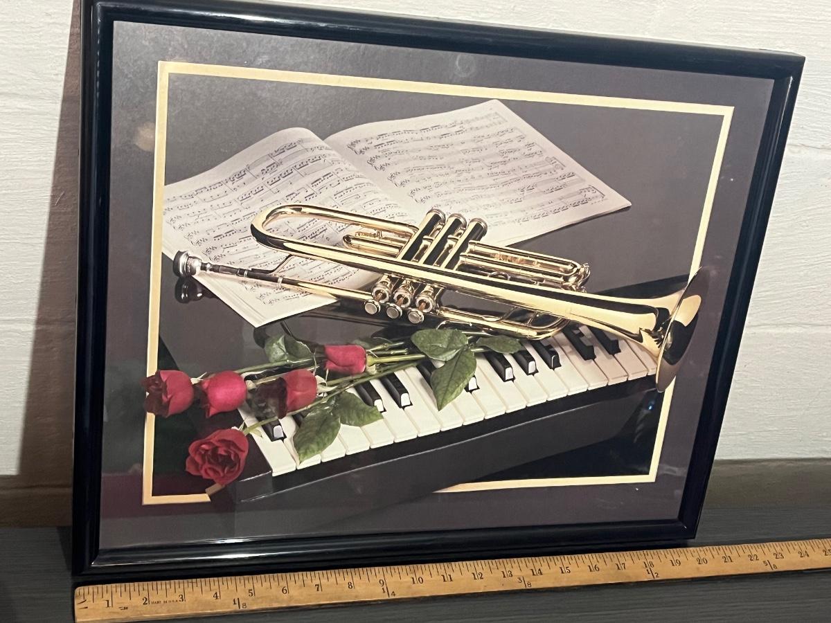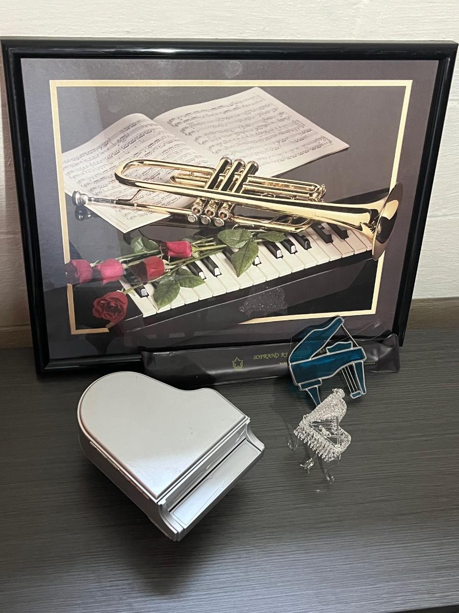 LOT 408B: Musical Decor - Framed Picture, Music Box, Recorder, Glass Piano