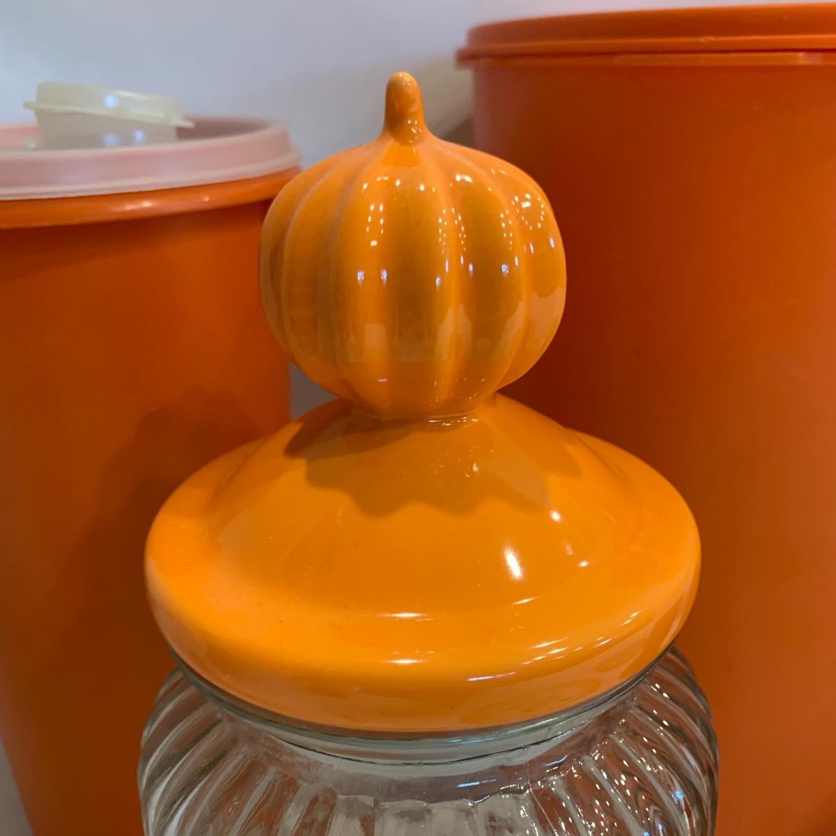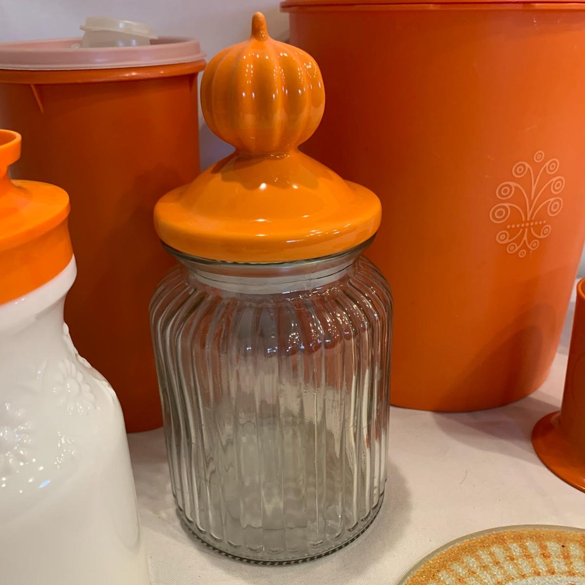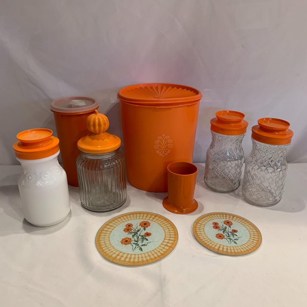 Here’s a great opportunity to add a splash of orange to your kitchen. This group includes a Tupperware container ( 9” X 8”), a Tupperware drink container, three glass lidded containers, a cookie jar featuring a pumpkin lid, two glass trivets, and an orange plastic cup.