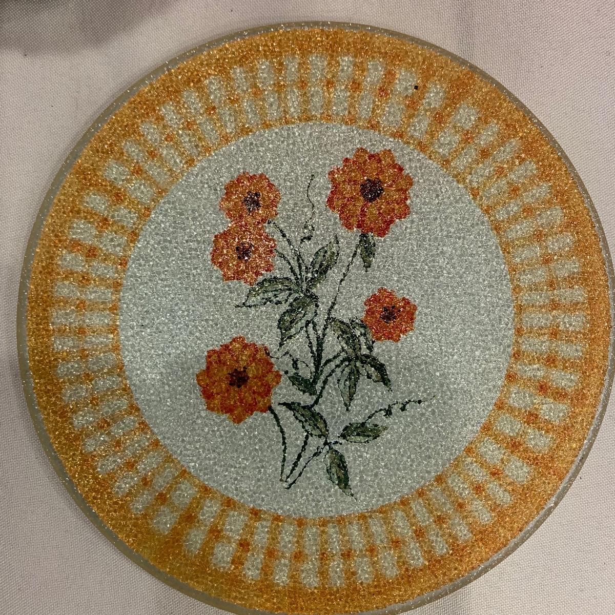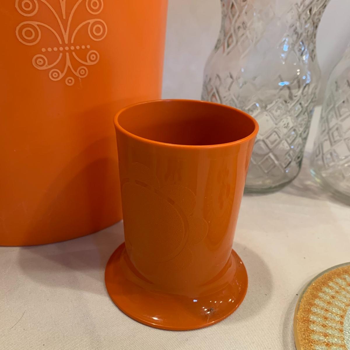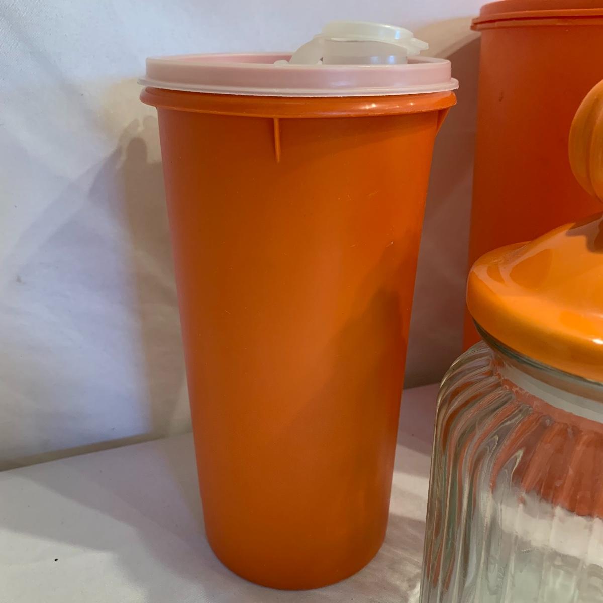 Here’s a great opportunity to add a splash of orange to your kitchen. This group includes a Tupperware container ( 9” X 8”), a Tupperware drink container, three glass lidded containers, a cookie jar featuring a pumpkin lid, two glass trivets, and an orange plastic cup.