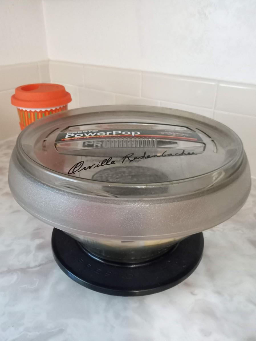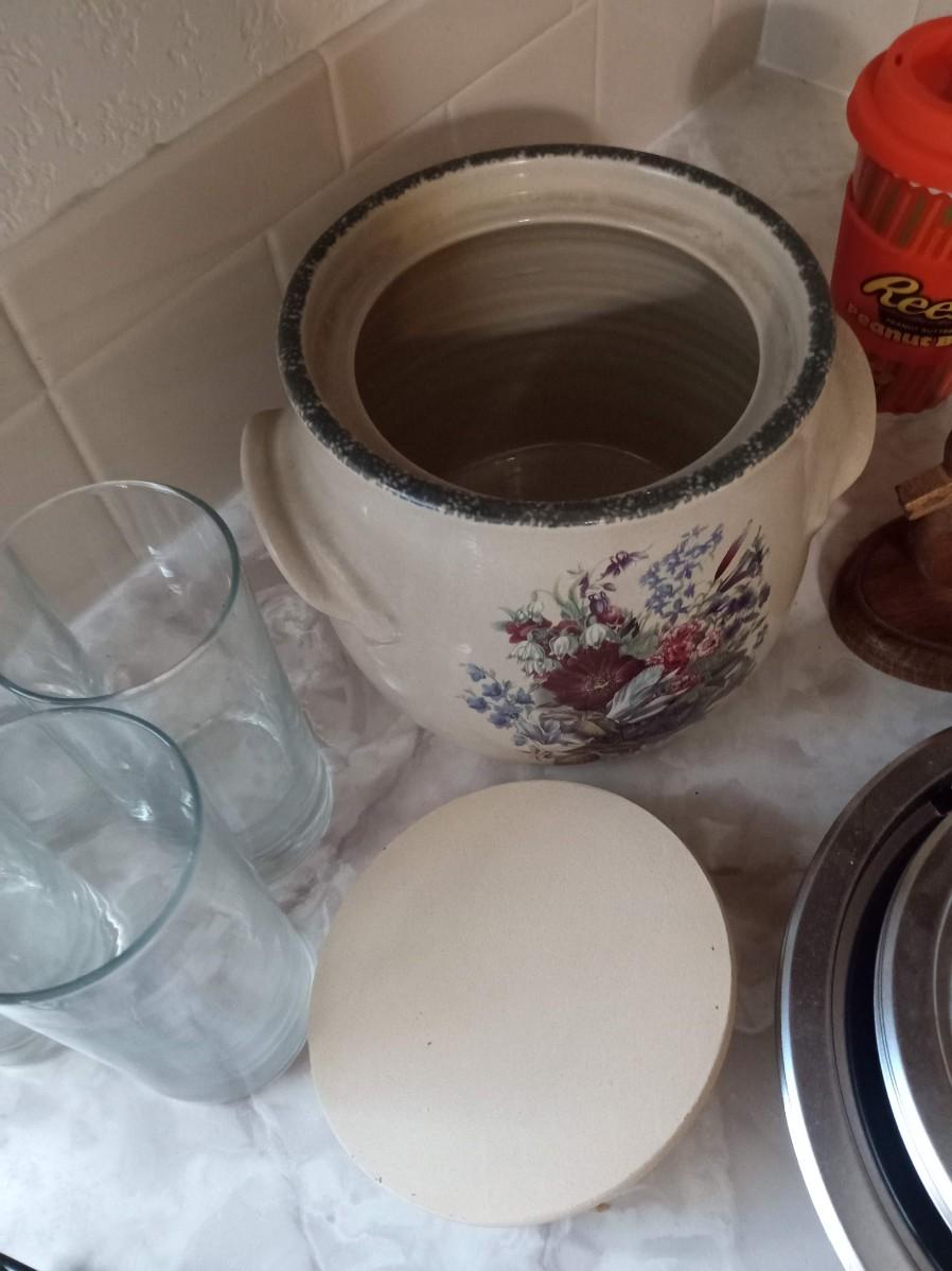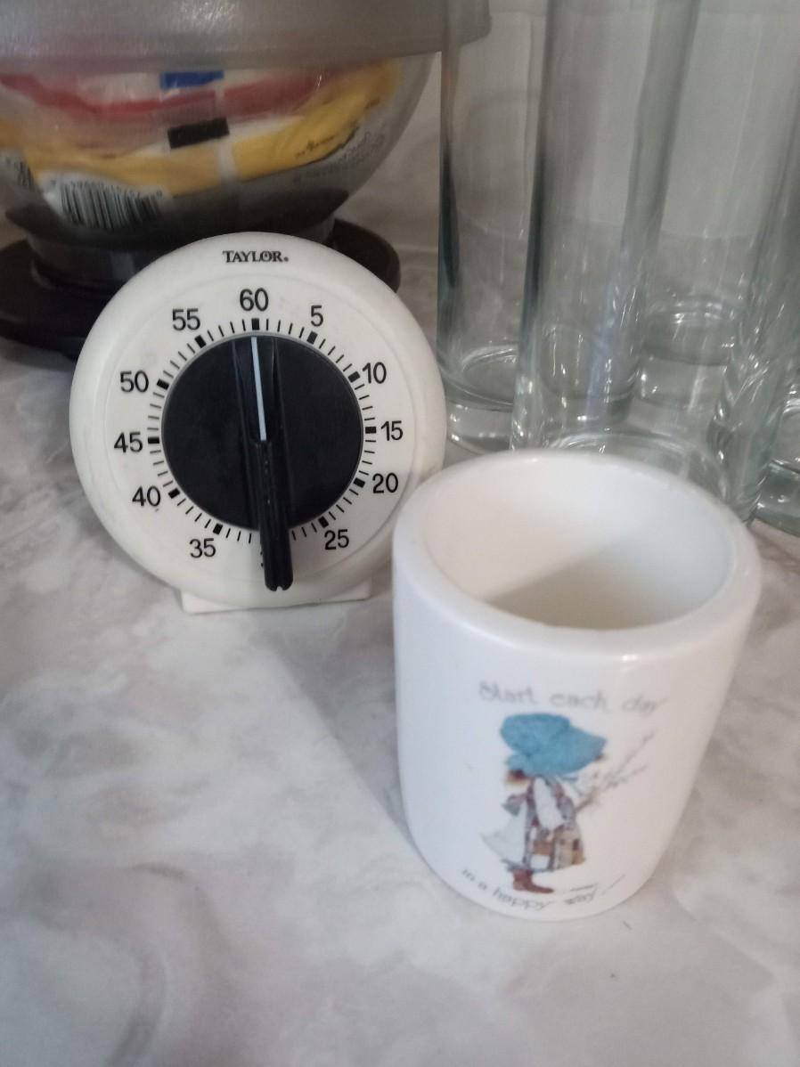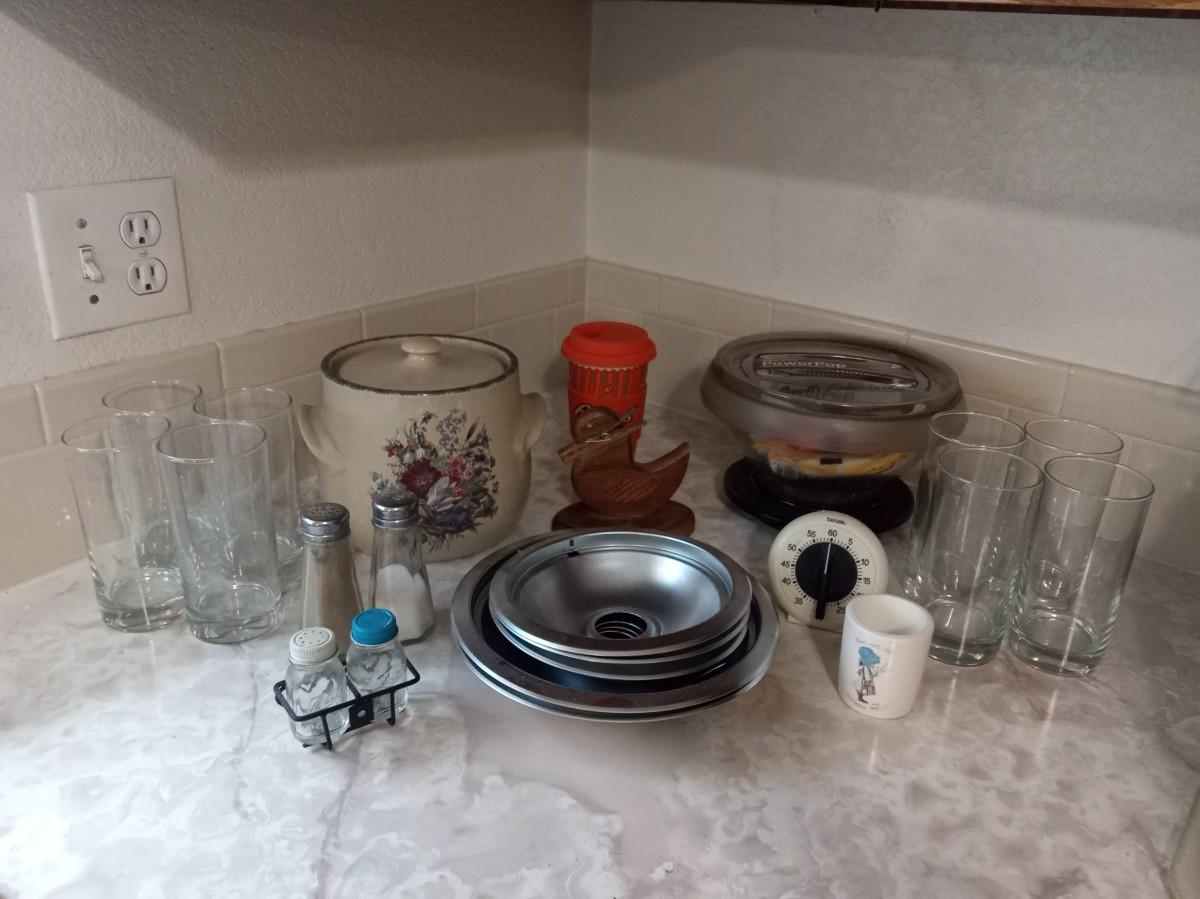 CLAY COOKIE JAR, 8 DRINKING GLASSES, SMALL BALL SALT AND PEPPER SHAKERS, STOVE DRIP PANS, MINUTE TIMER, ORVILLE'S POPCORN POPPER, RECIPE HOLDER DUCK AND HOLLY HOBBIE TOOTHPICK HOLDER
