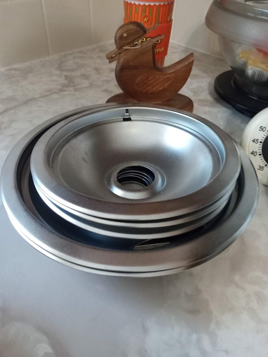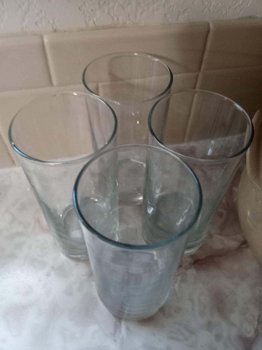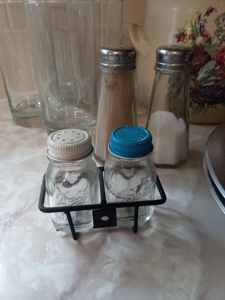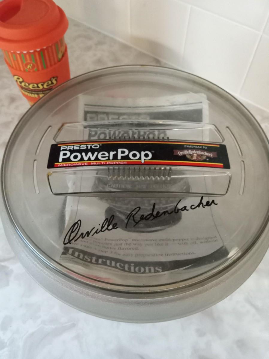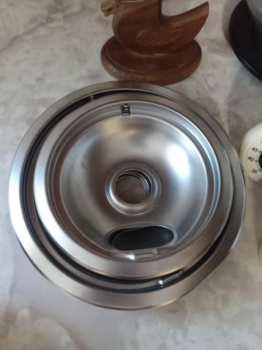 CLAY COOKIE JAR, 8 DRINKING GLASSES, SMALL BALL SALT AND PEPPER SHAKERS, STOVE DRIP PANS, MINUTE TIMER, ORVILLE'S POPCORN POPPER, RECIPE HOLDER DUCK AND HOLLY HOBBIE TOOTHPICK HOLDER