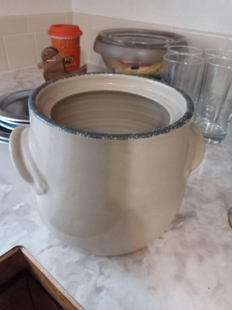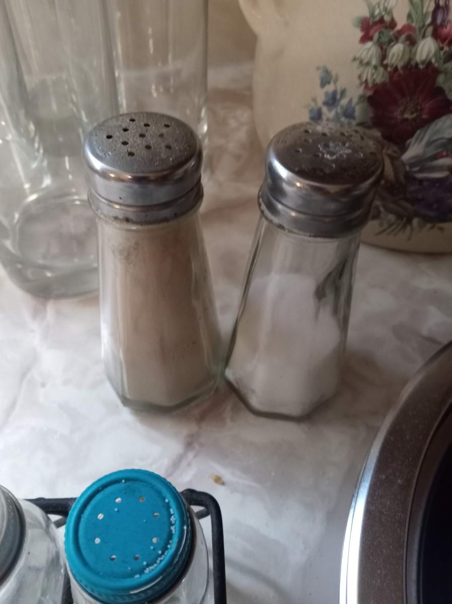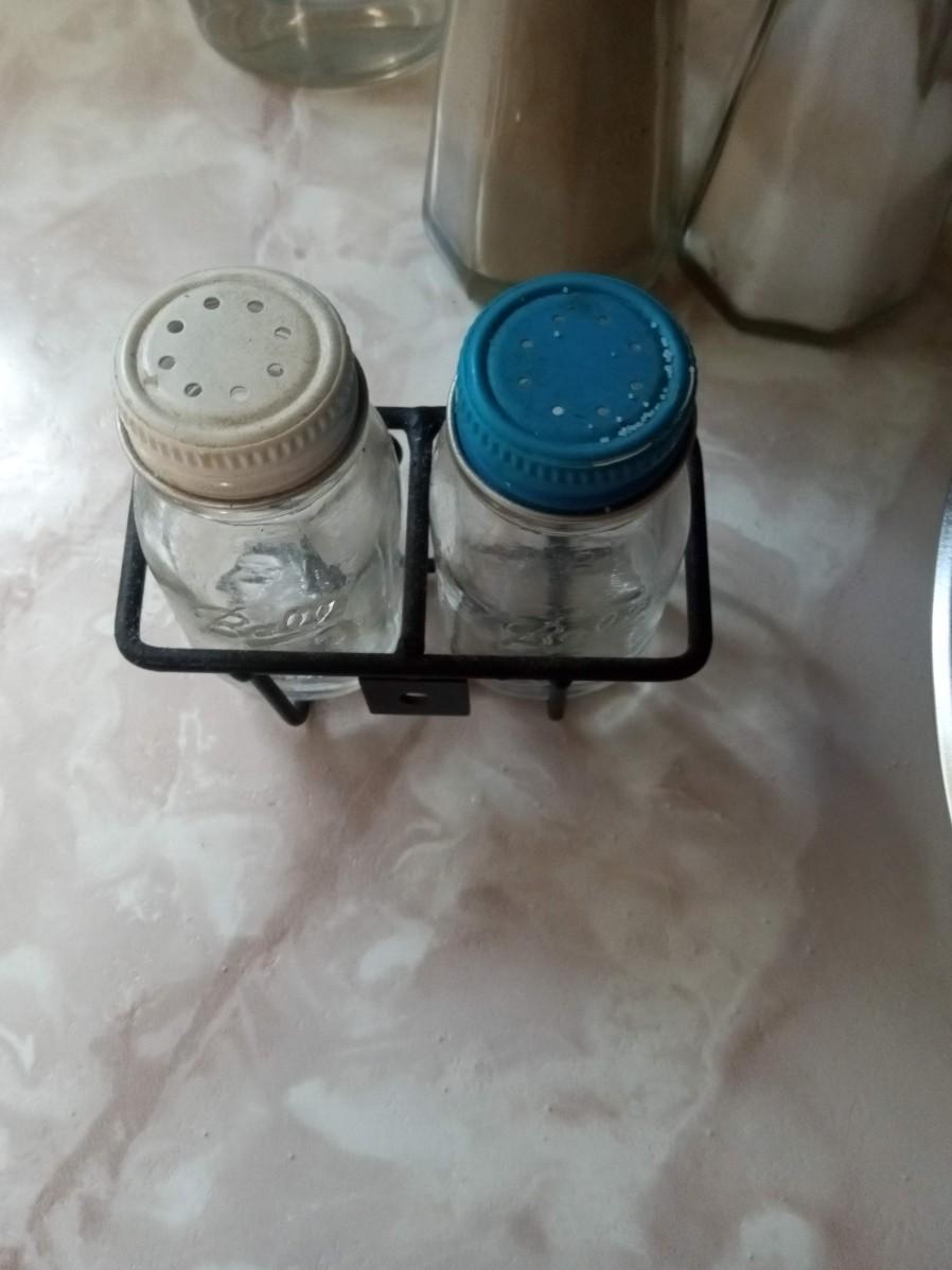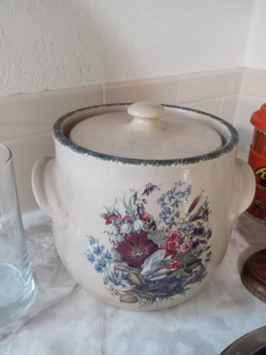 CLAY COOKIE JAR, 8 DRINKING GLASSES, SMALL BALL SALT AND PEPPER SHAKERS, STOVE DRIP PANS, MINUTE TIMER, ORVILLE'S POPCORN POPPER, RECIPE HOLDER DUCK AND HOLLY HOBBIE TOOTHPICK HOLDER