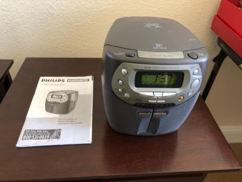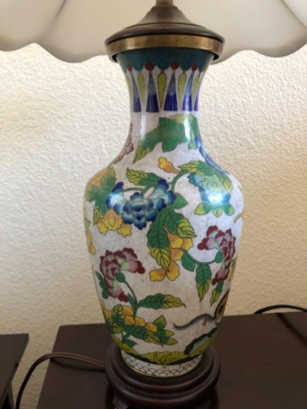 Lot 40U. Two bedside tables with 3 drawers, 3 Asian lamps (2 of which have no shades);=, 1 Phillips CD alarm clock (works)--$75