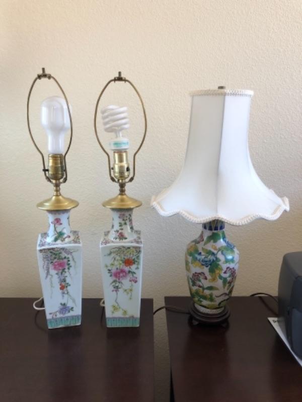 Lot 40U. 3 Asian lamps (2 of which have no shades), 1 Phillips CD alarm clock (works)--$25