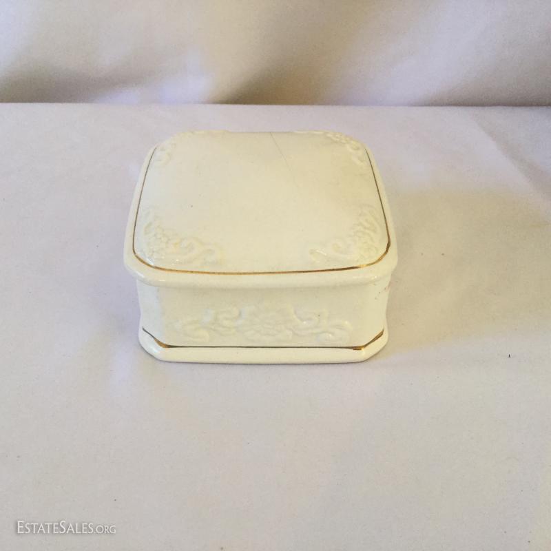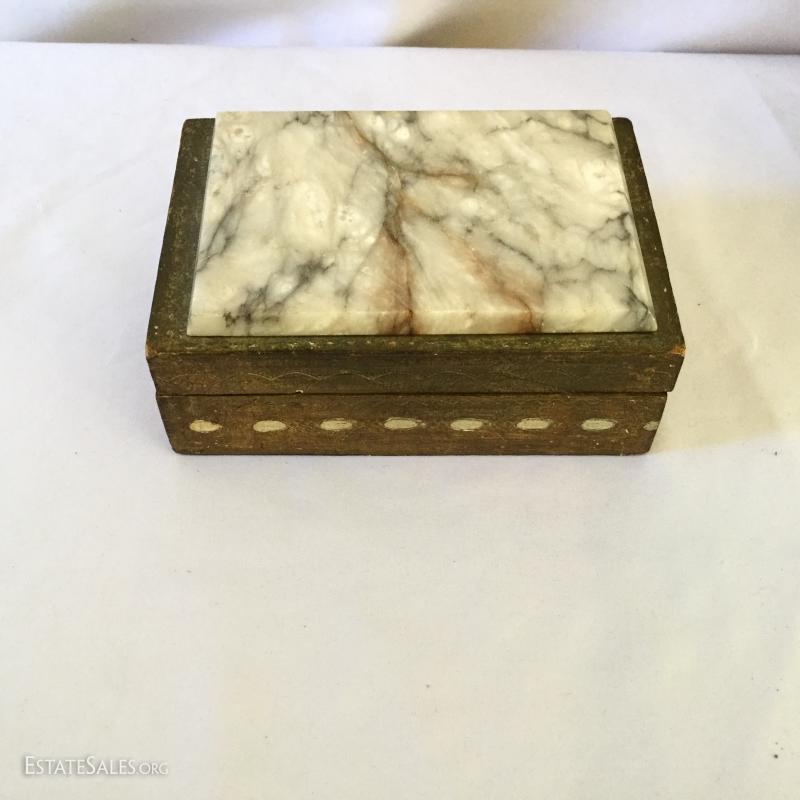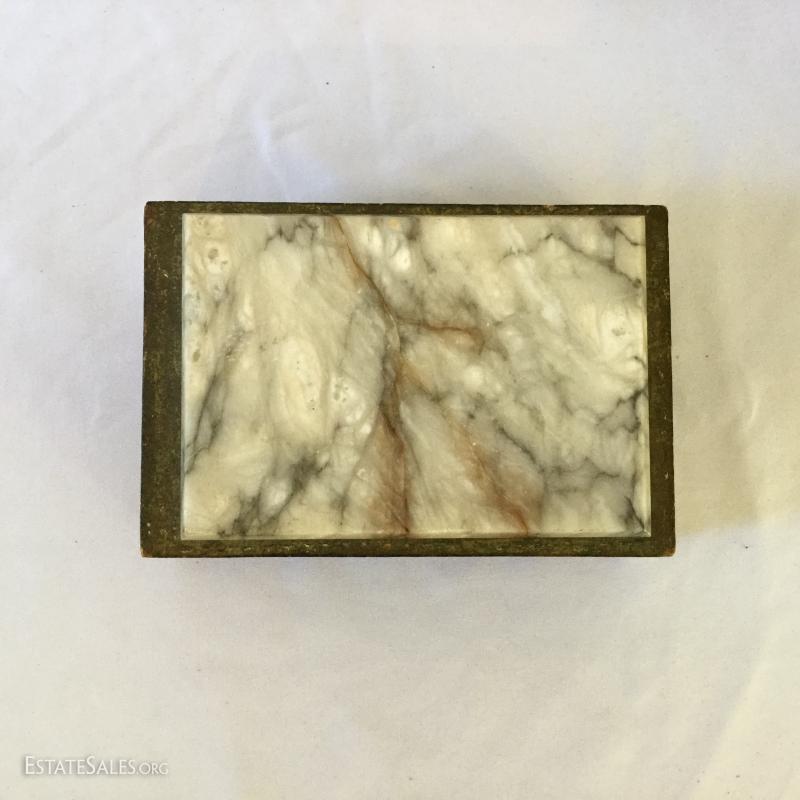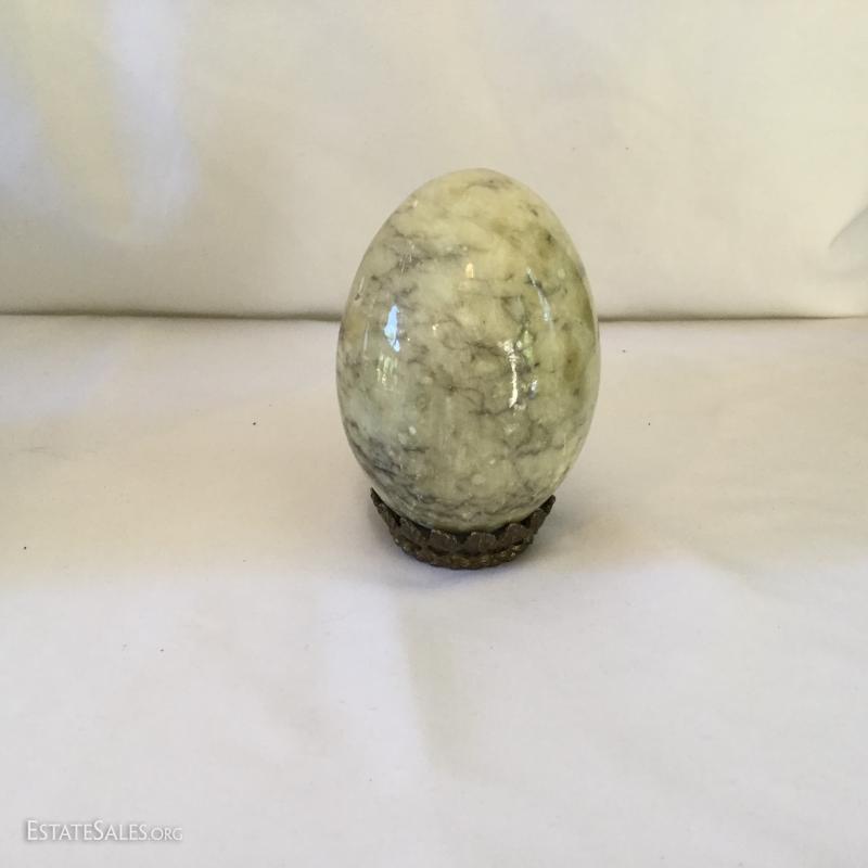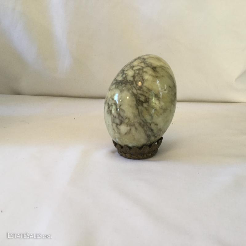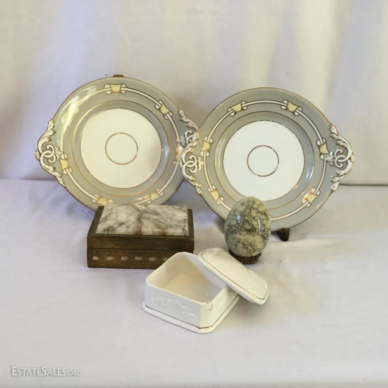 Lot includes marble egg with stand, 4" high, porcelain keepsake box with lid (crack in lid, see photo), two identical decorative plates (one plate has tiny chip, 11" wide), and keepsake box with marble lid.