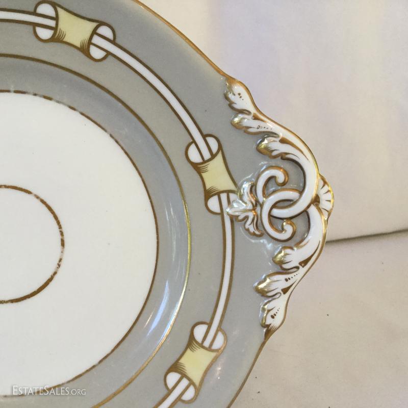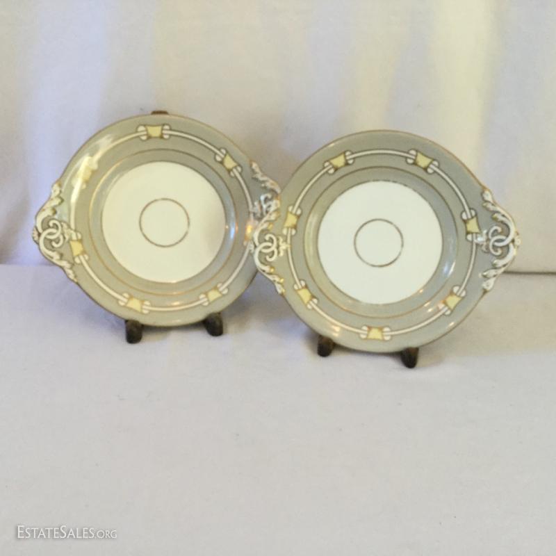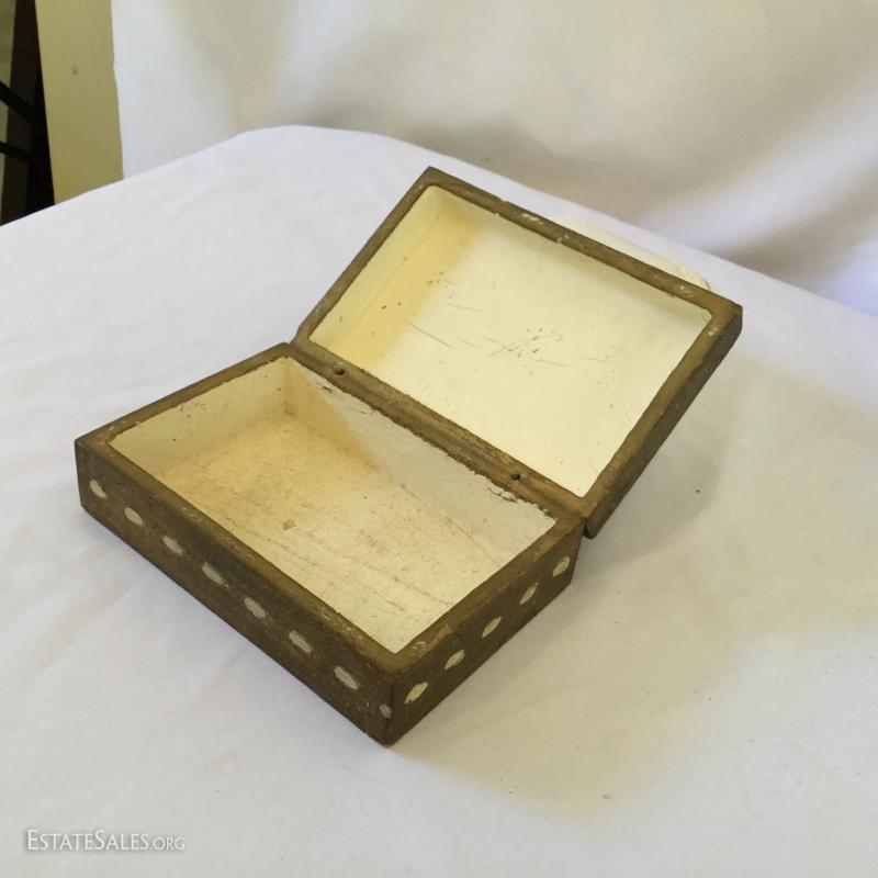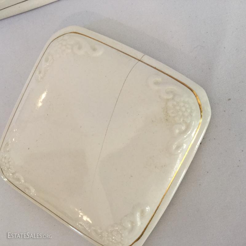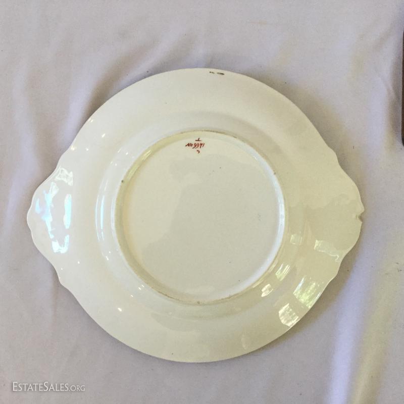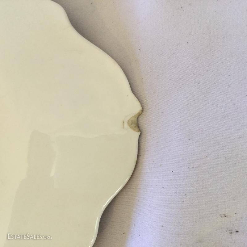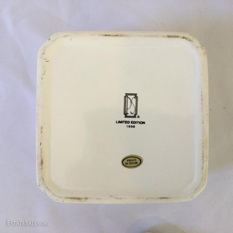 Lot includes marble egg with stand, 4" high, porcelain keepsake box with lid (crack in lid, see photo), two identical decorative plates (one plate has tiny chip, 11" wide), and keepsake box with marble lid.