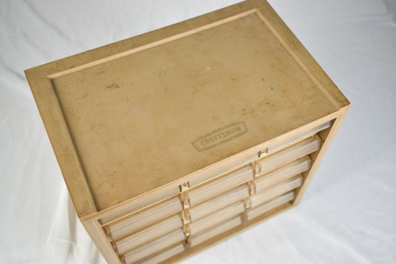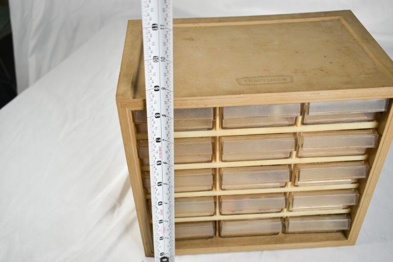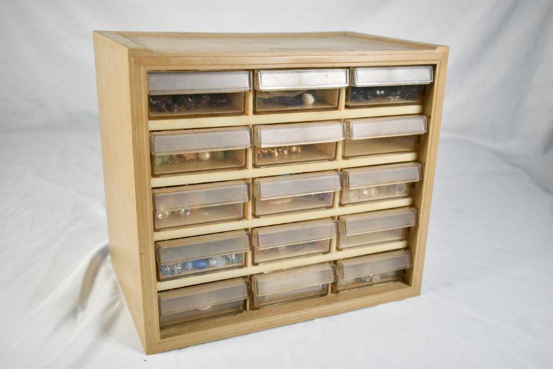 15-drawered Craftsman storage box. Jewelry fixings inside included. 8 3/4" x 10". **Please read Terms and Conditions before placing a bid. Pick up is Sunday, December 22 from 11am to 3pm or Monday, December 23 from 4pm-7pm in Mantua, NJ. All sales are final. All sales are as is, where is. Please review all photos. Props are not included. Measurements are approximate.