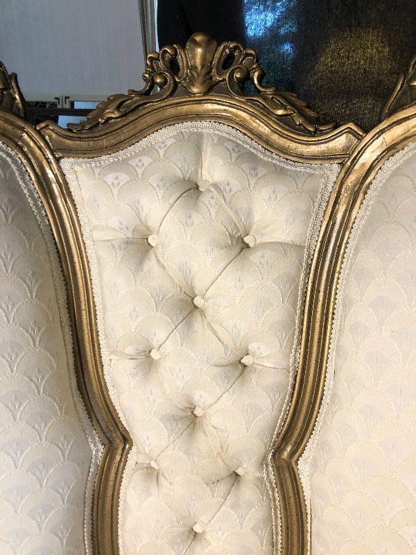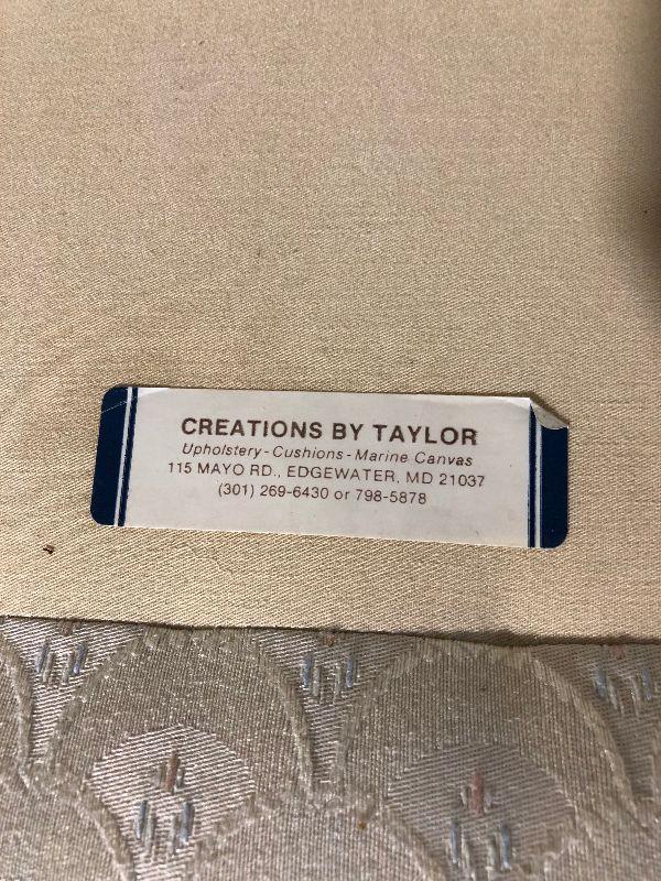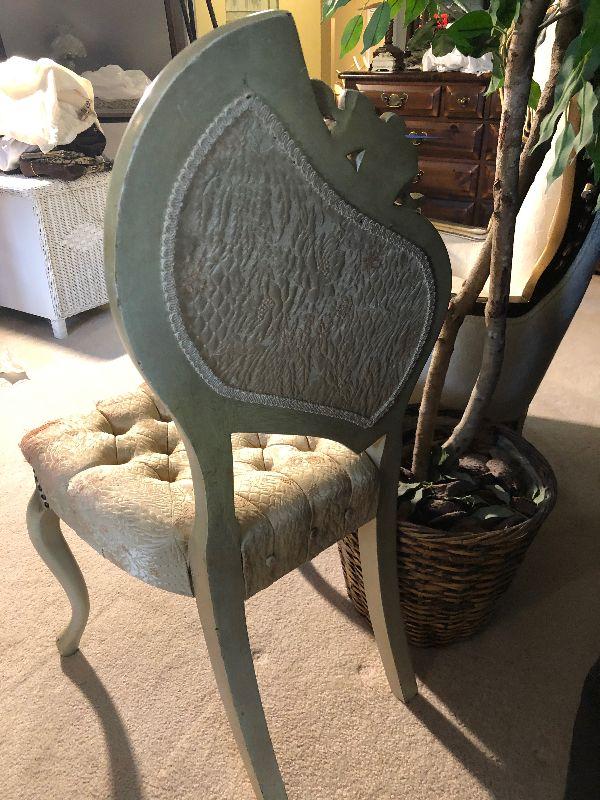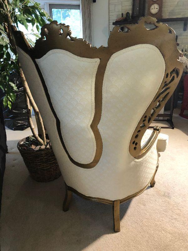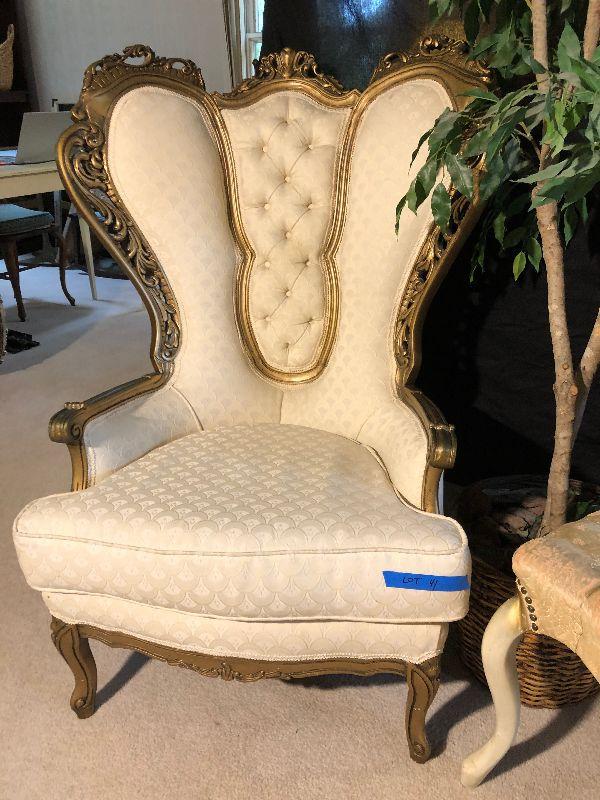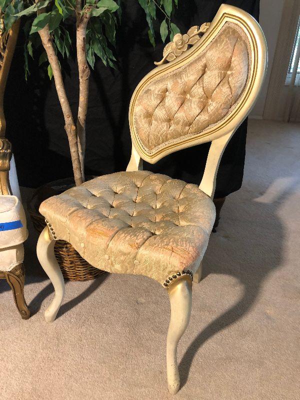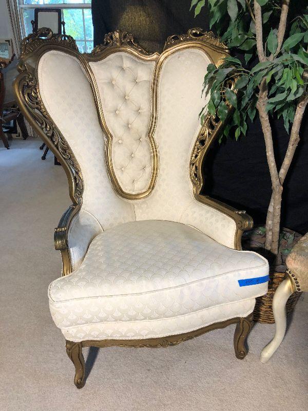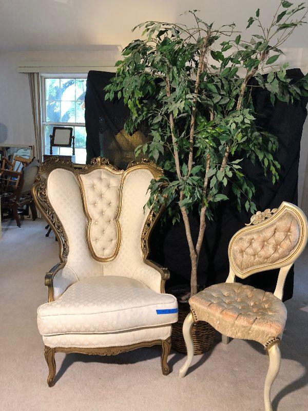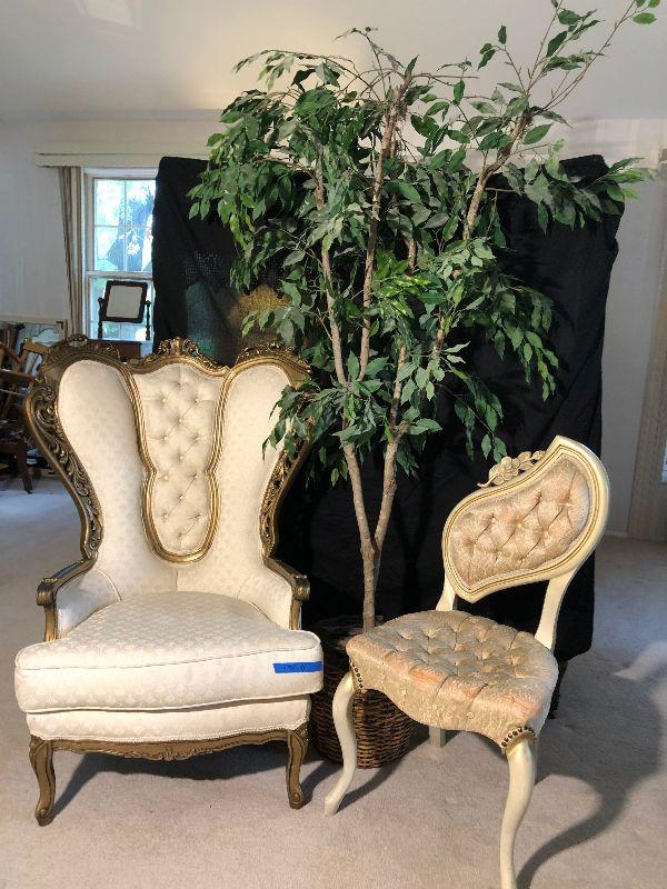 2 ornate antique chairs - 1 side chair (damage on seat), 1 high back chair with label which reads "Creations by Taylor - Edgewater, MD" and a tall artificial tree in basket.