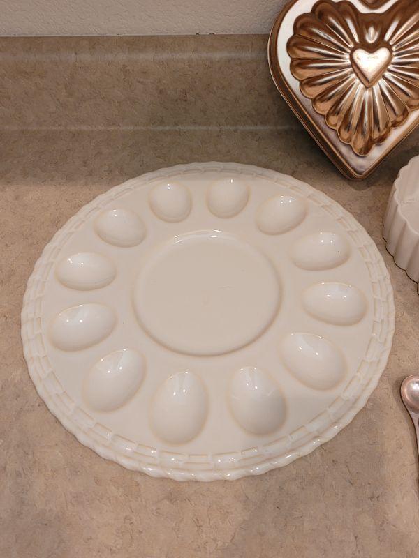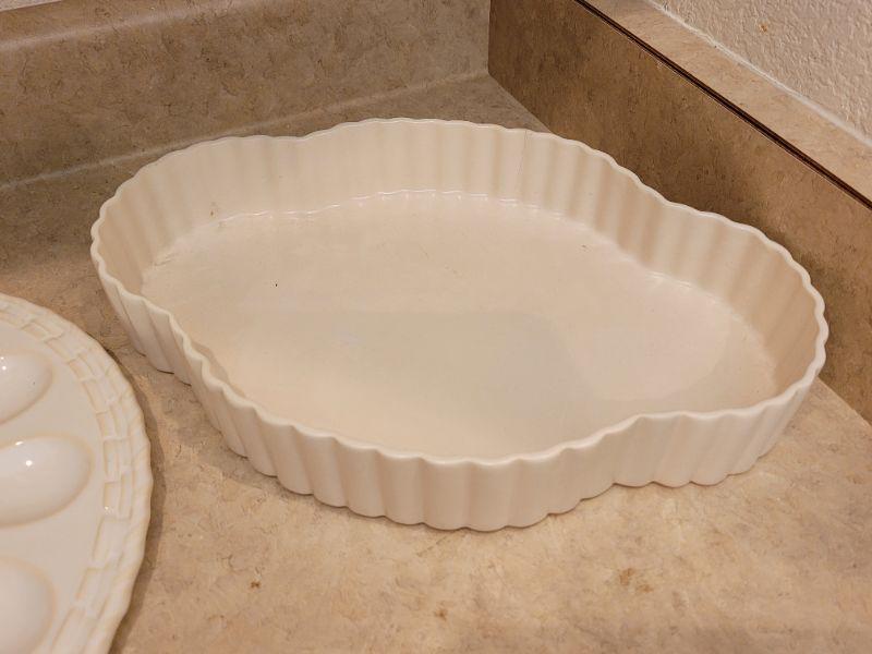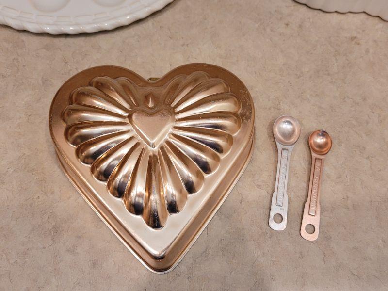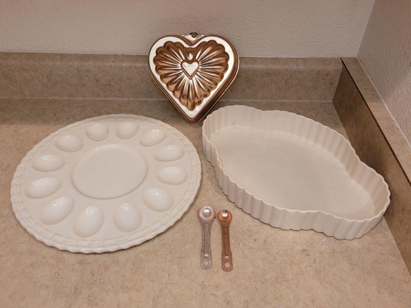 Lot 41: Rose Copper Heart Mold & 2 Measuring Spoons, Hallmark Egg Dish, and Serving Dish