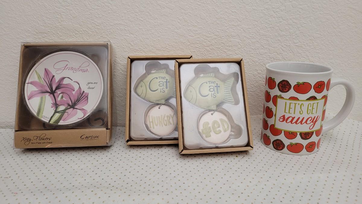 Lot 41: Assorted NEW Cups and Cat FED/HUNGRY Magnet Sets for Dishonest Pets and Forgetful Owners
